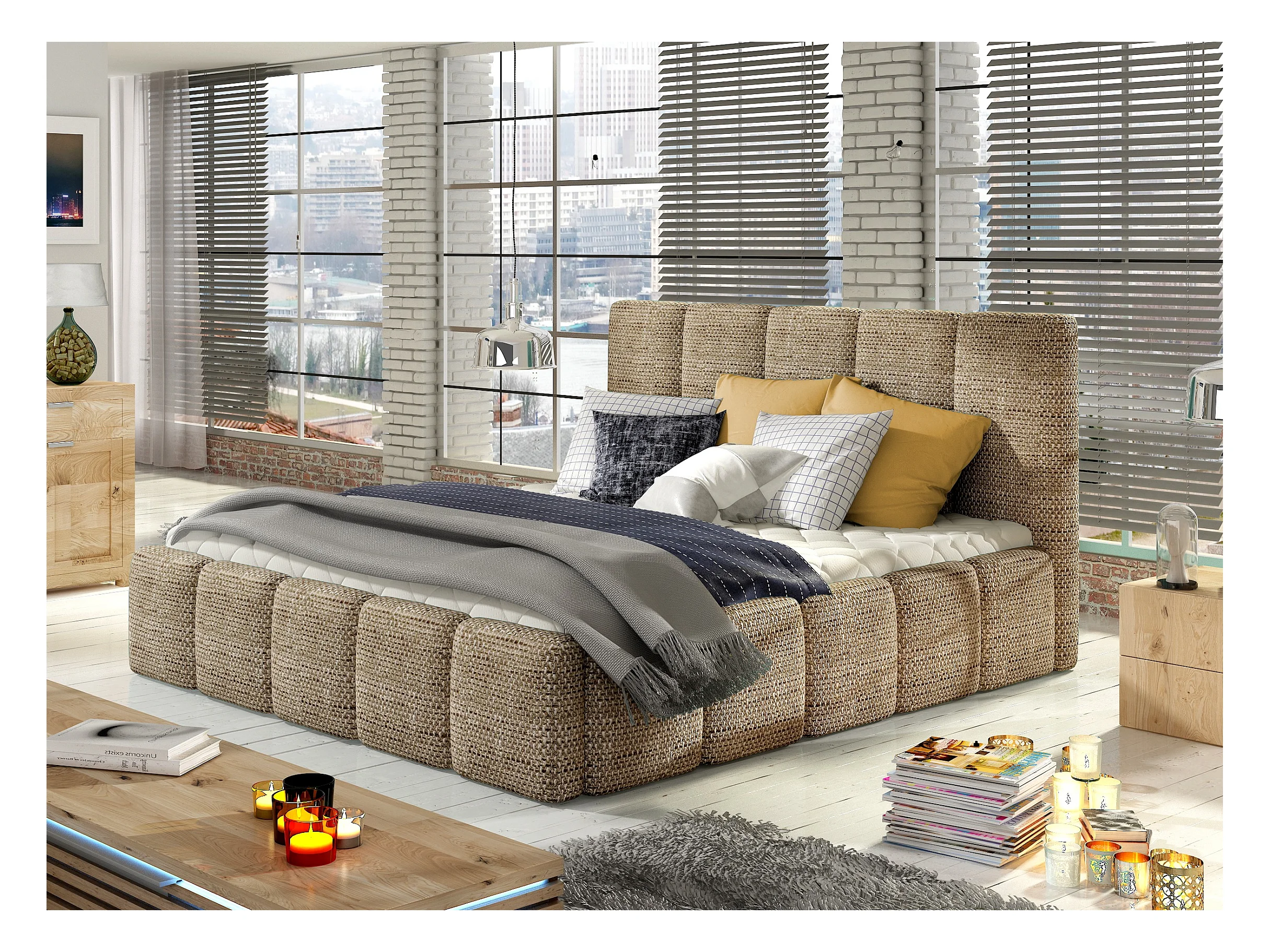 Lit adulte avec coffre de rangement Vika – Tissu capitonné-Beige chiné-140x200