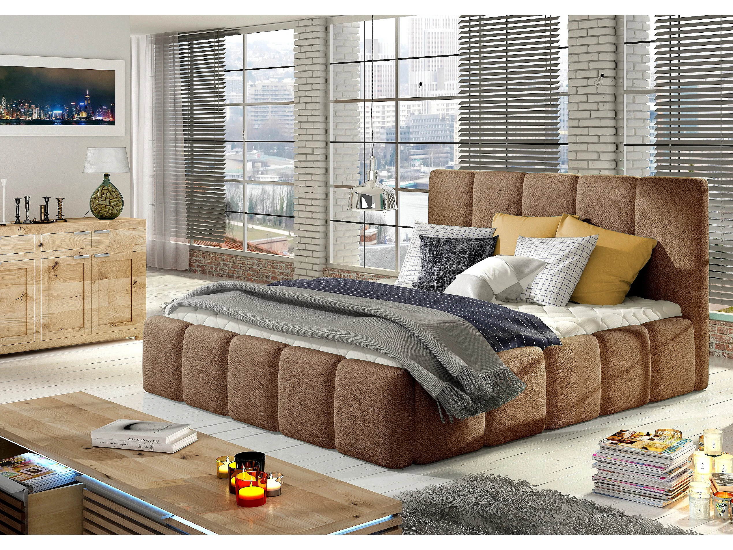 Lit adulte Vika – Velours capitonné-Marron clair-140x200-Version avec sommier