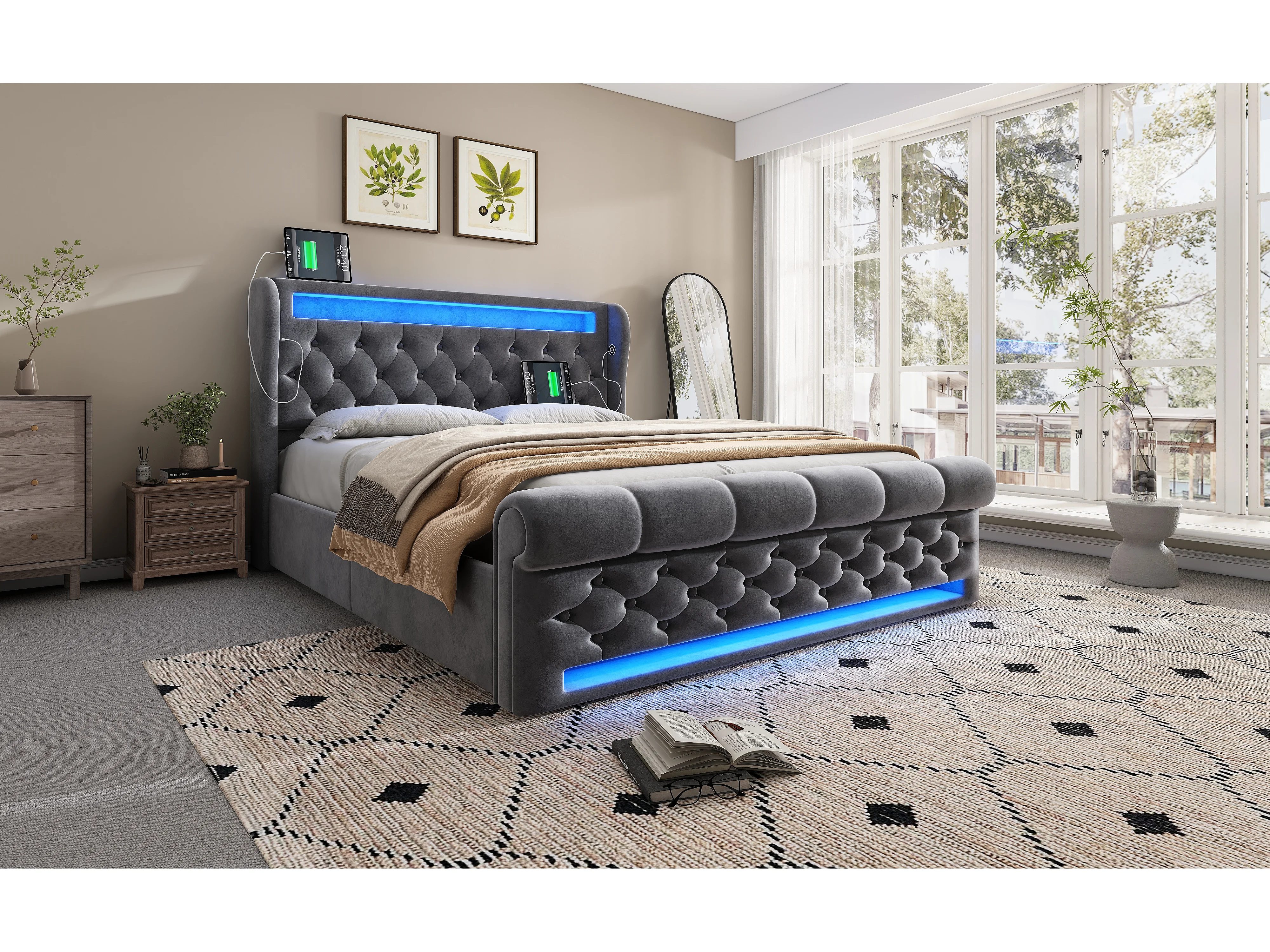 Lit moderne en velours 160x200 cm, avec éclairage LED et tête de lit de rangement, gris