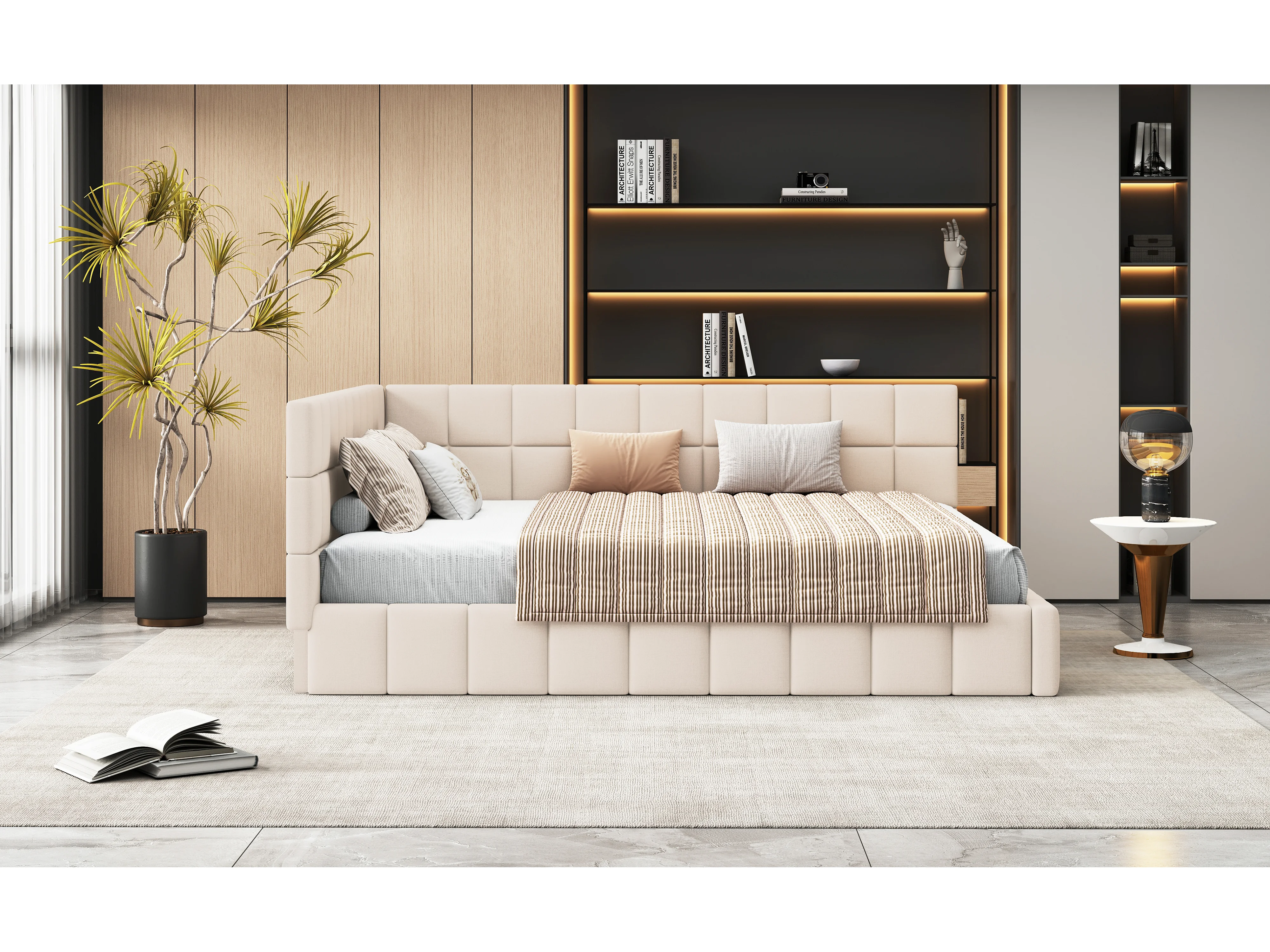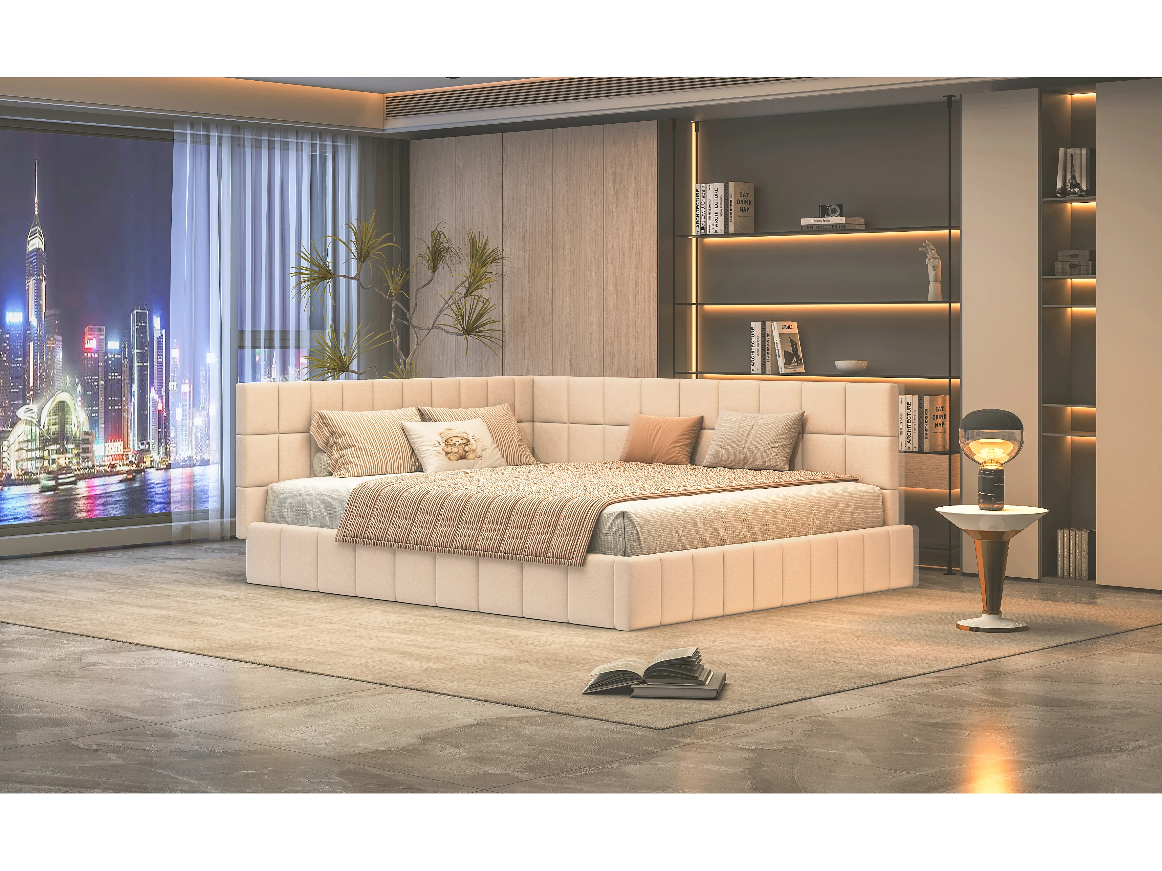 Lit multifonctionnel 160×200 cm en velours beige avec échelle et barrières de sécurité