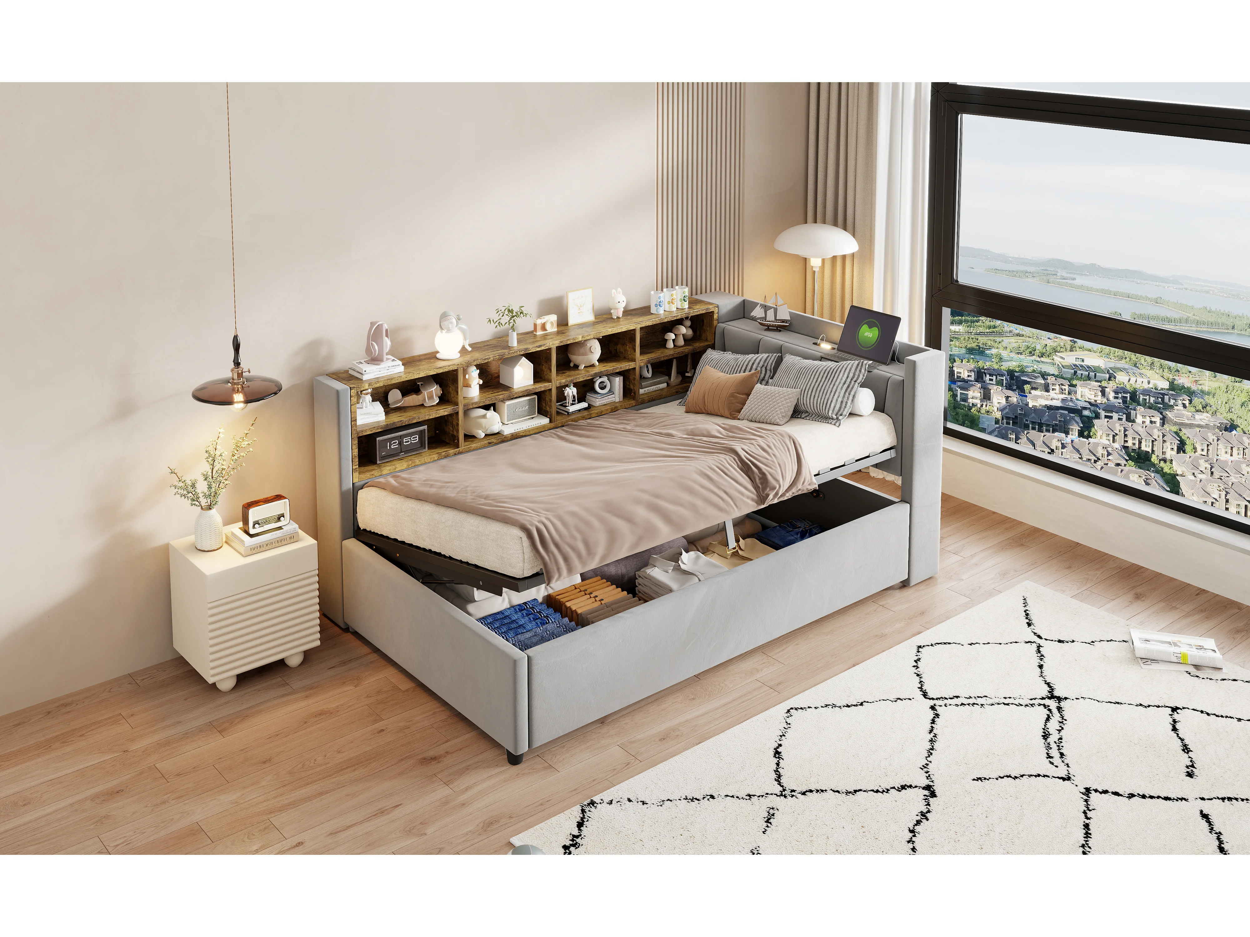 Lit multifonctionnel 90×200 cm, gris, avec rangement hydraulique, éclairage nocturne et prises USB