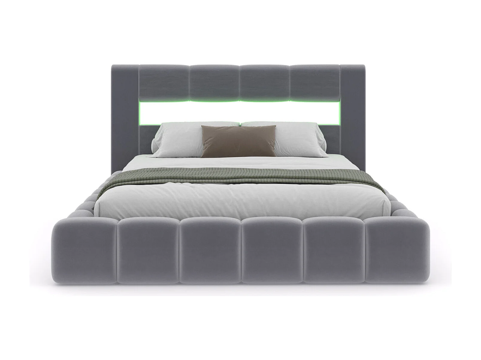 Lit nuage LED avec coffre 180x200cm en velours gris avec tête de lit et sommier OMAHA