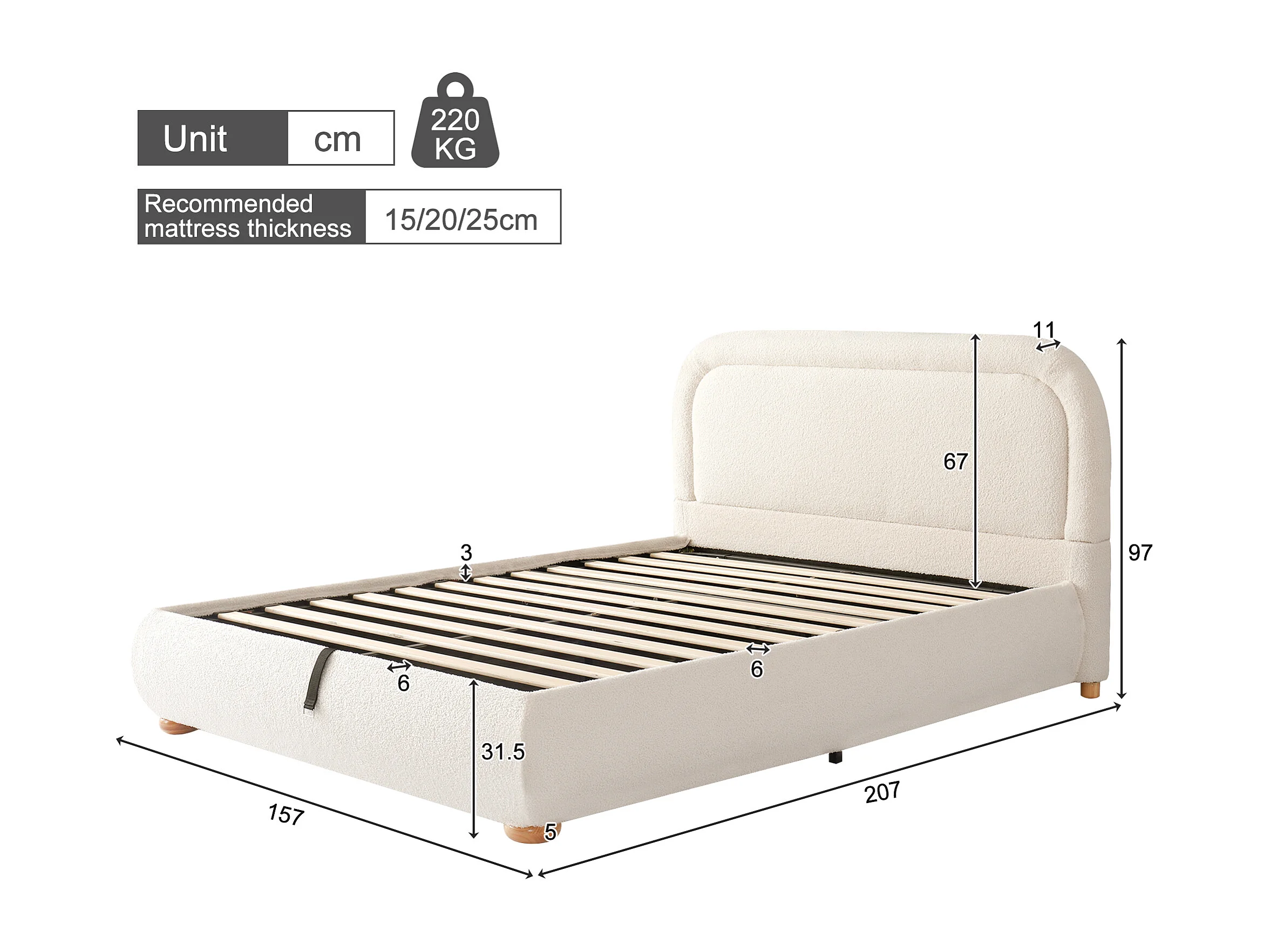 Lit offre double - 140 x 190 cm - avec tête de lit rembourrée + rangement hydrauliquement - boucle - beige