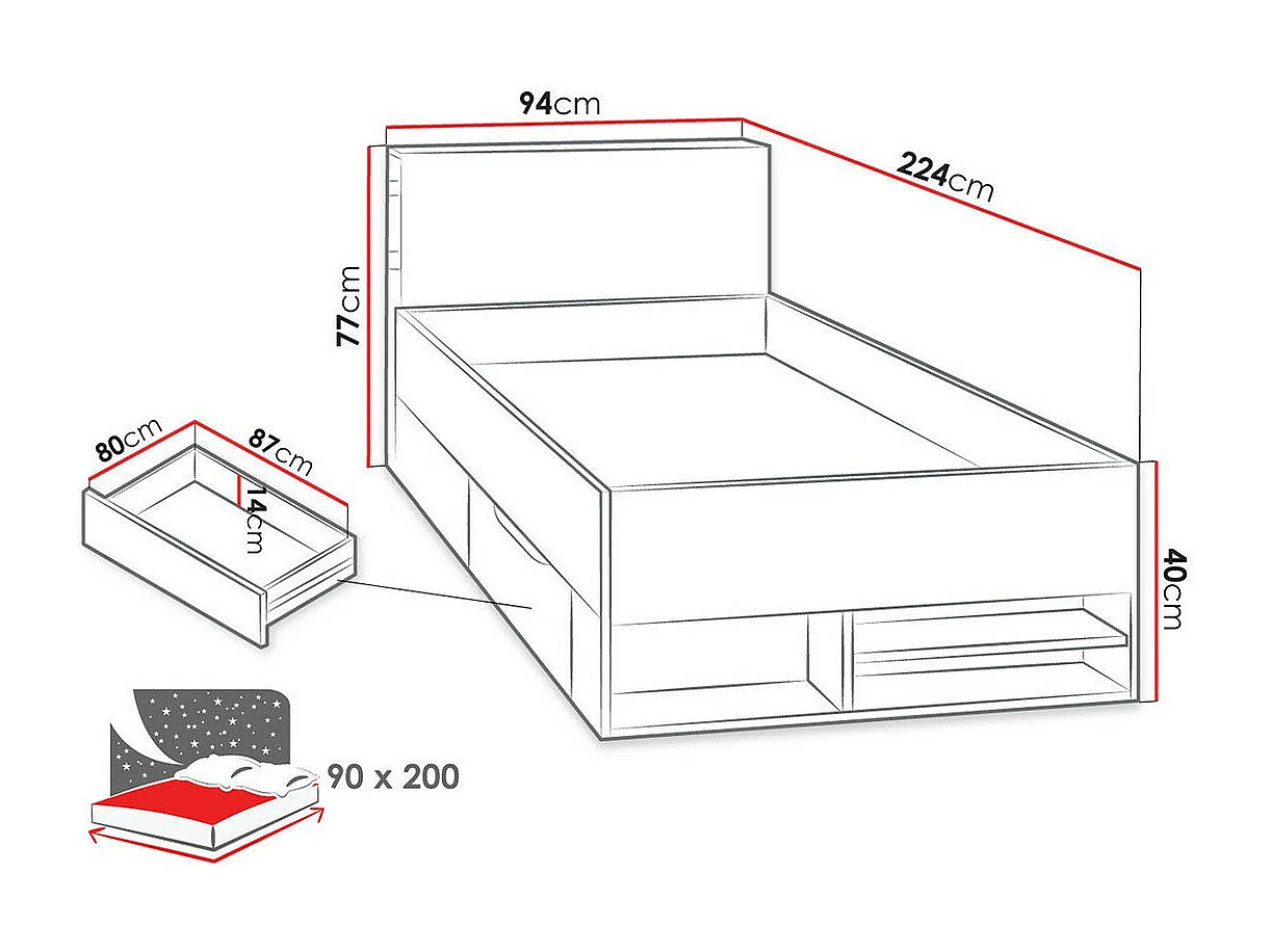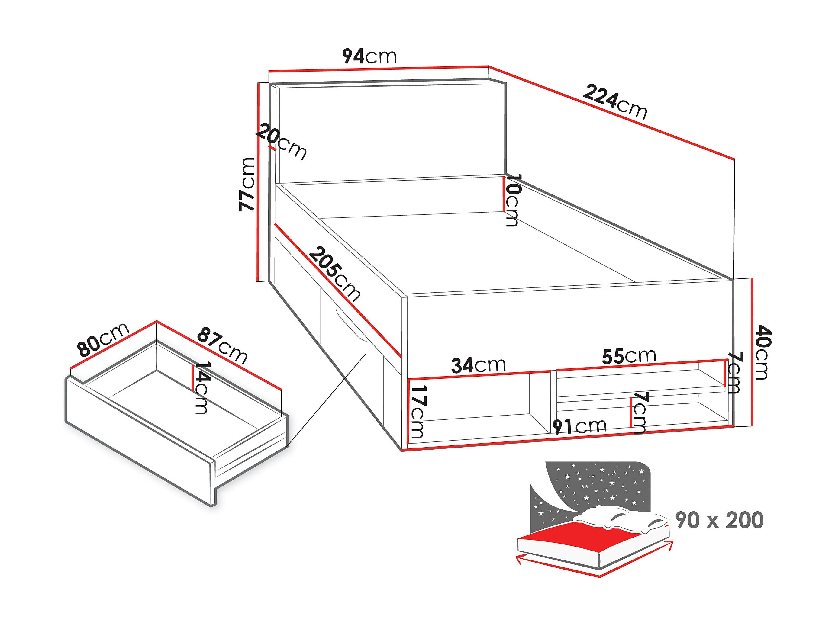 Lit Camteso 112, Unique, Noir, 90x200, Stratifié, Disponible, 94x224x77cm