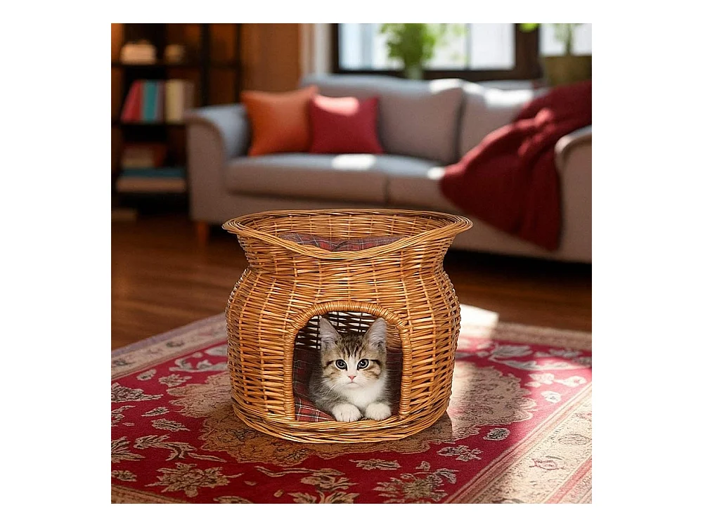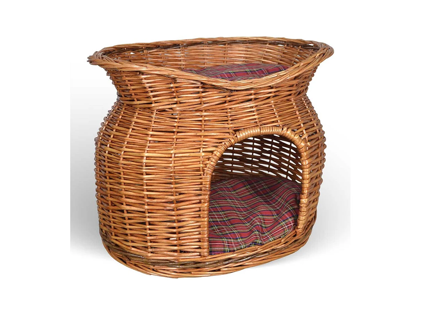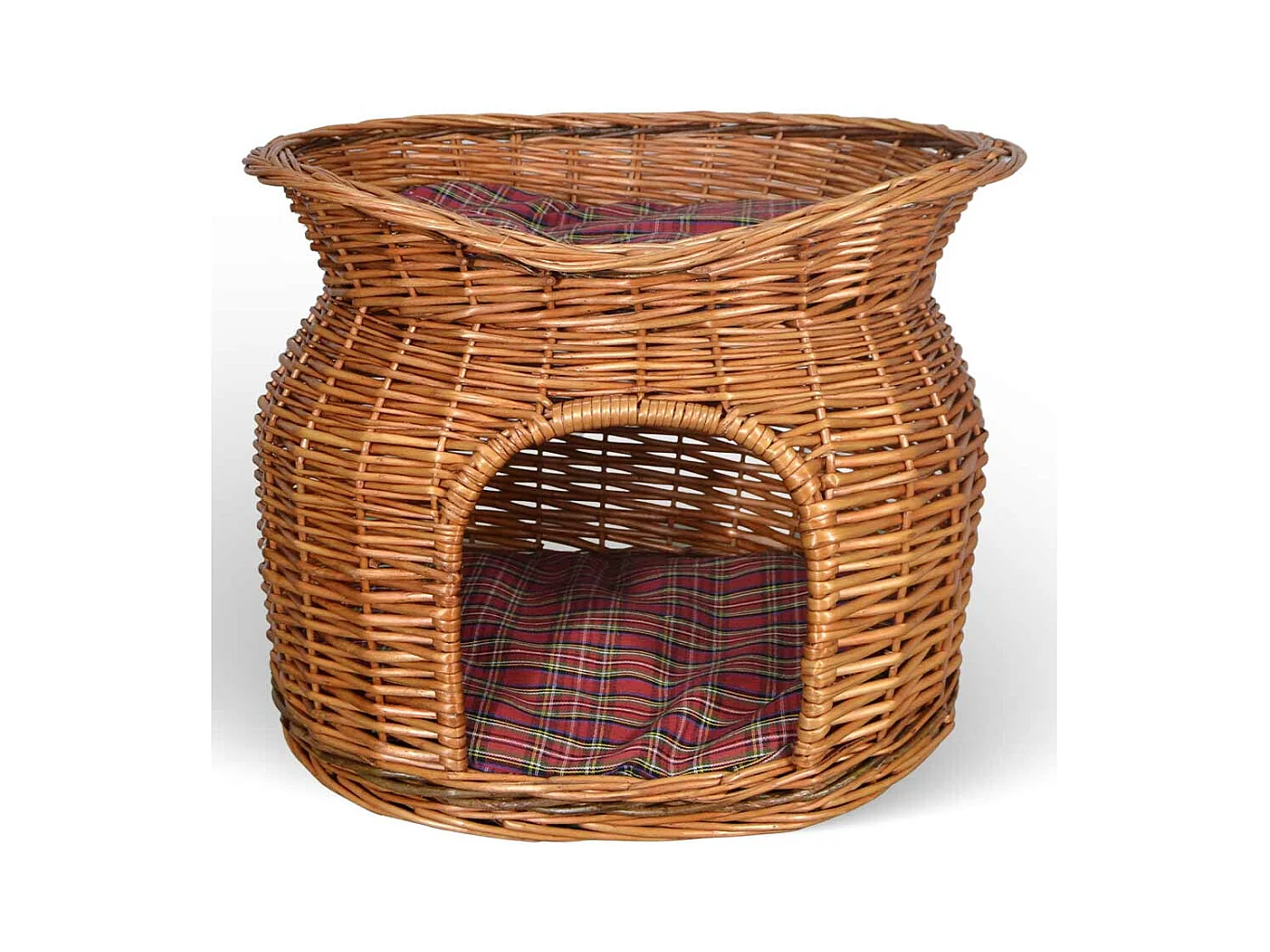 Lit panier igloo à deux niveaux en osier naturel avec deux coussins