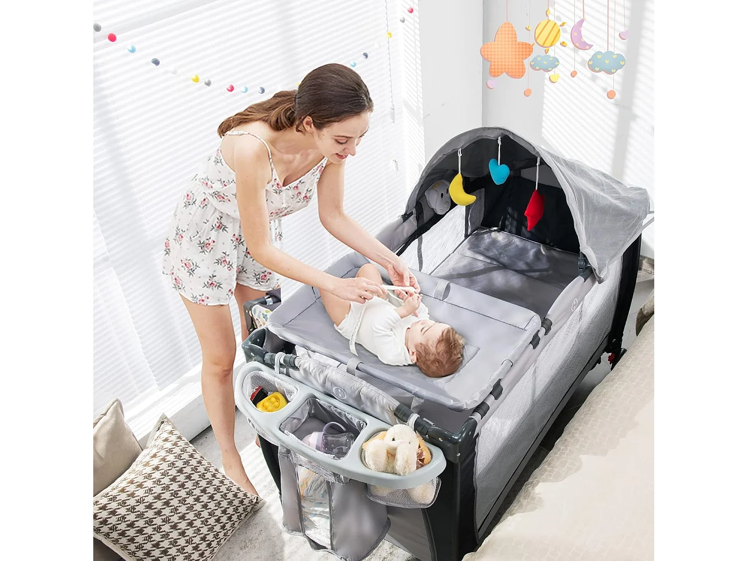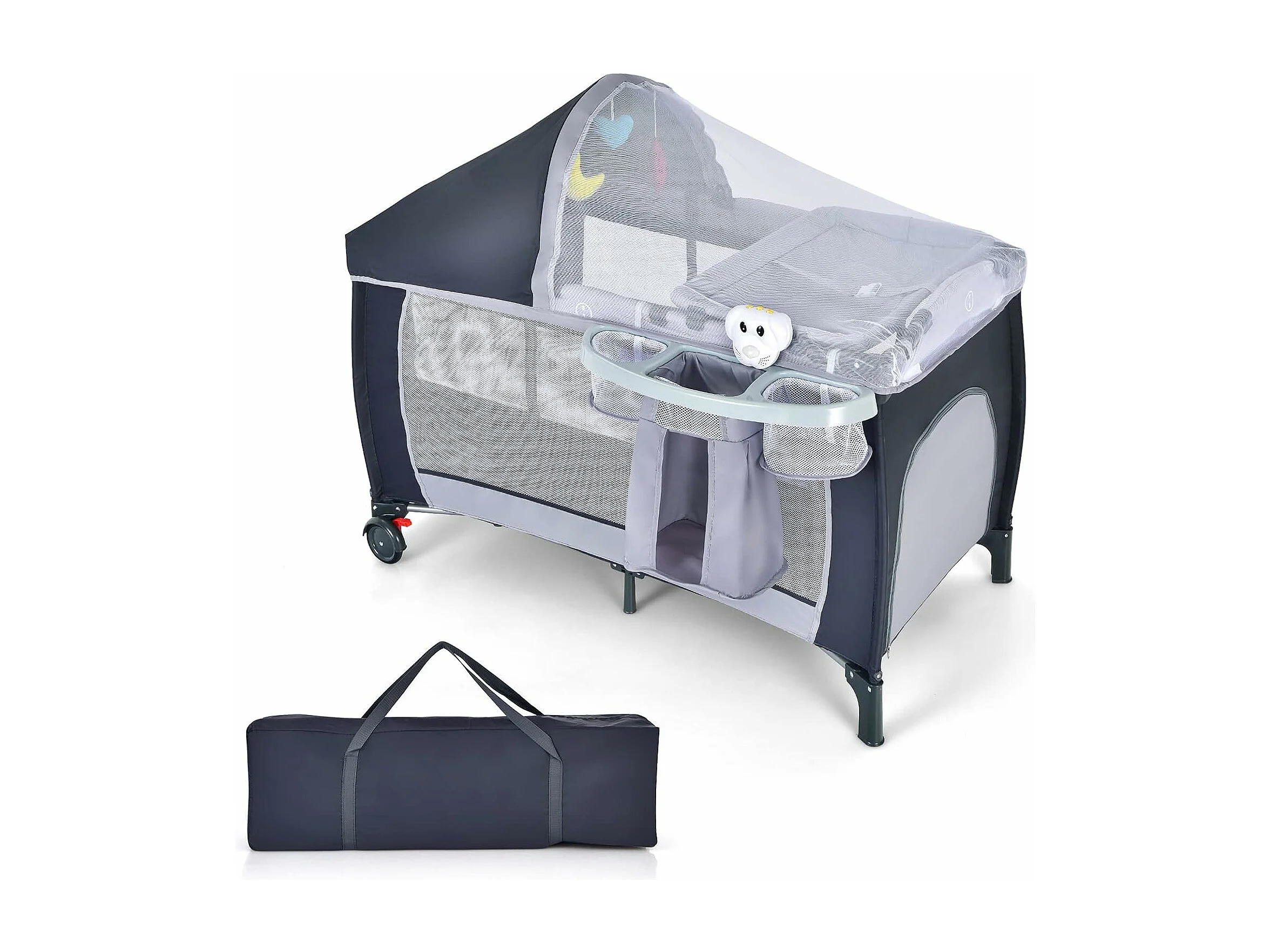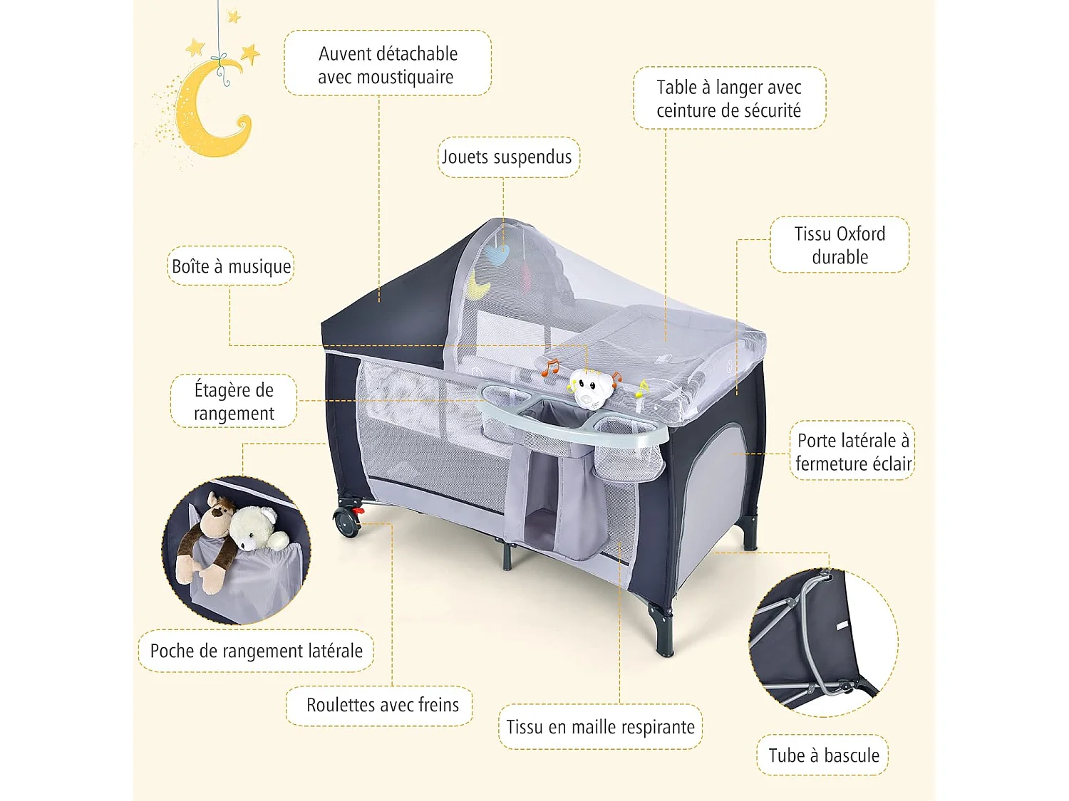 Lit Parapluie Bébé Pliant 4 en 1 Berceau/Table à Langer Parc de Jeux Fonction Basculement avec Matelas,Arc de Jeux Sac Gris