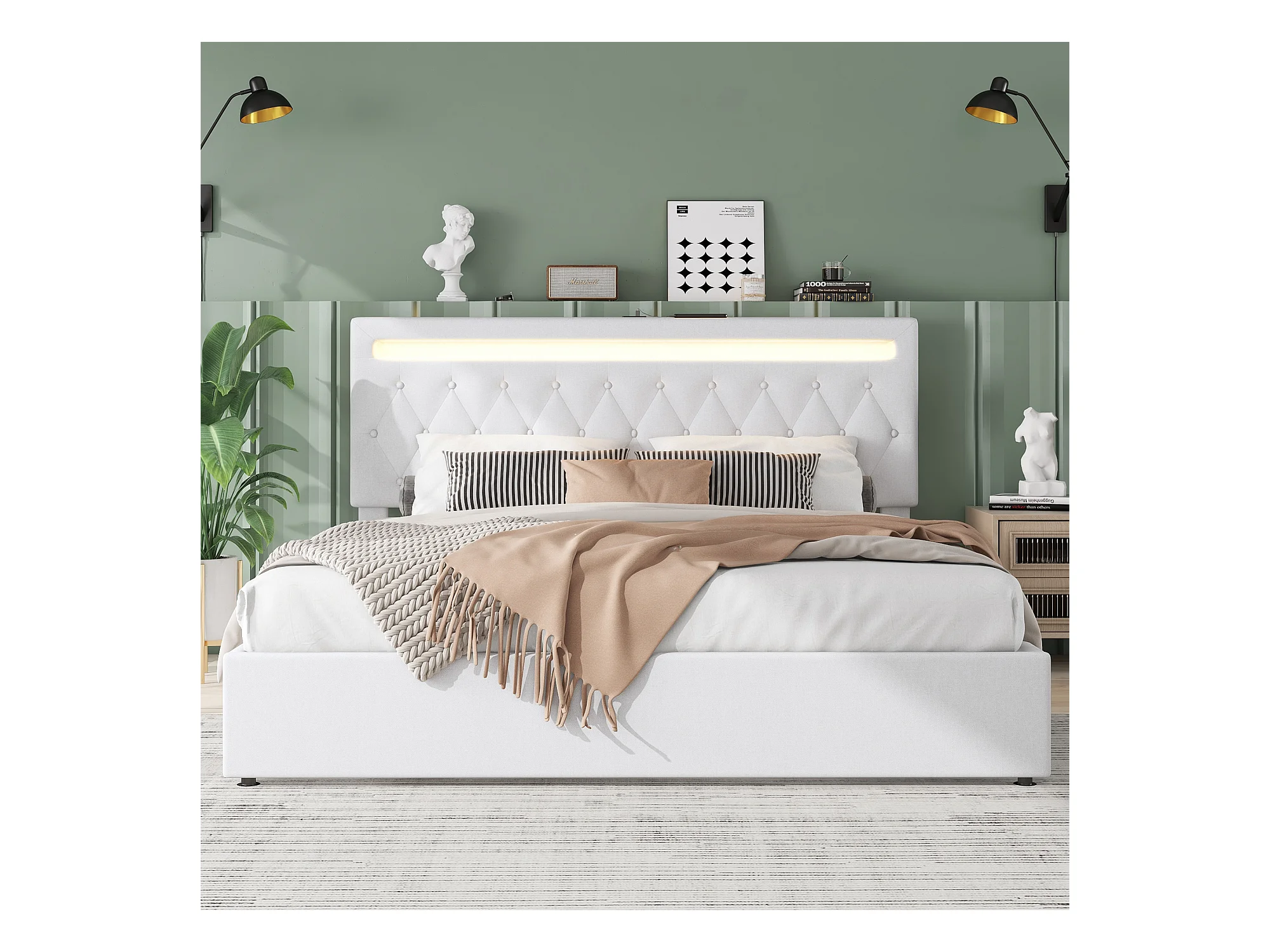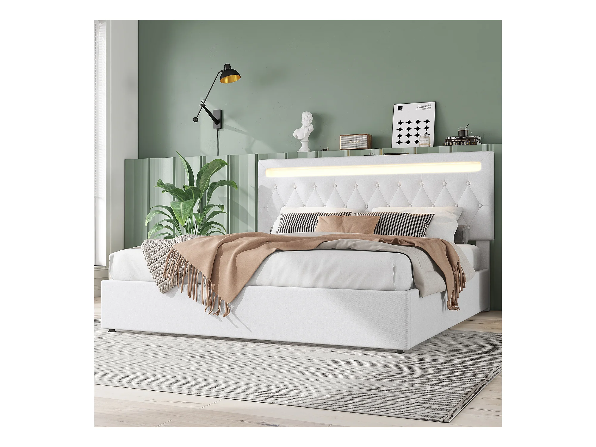 Lit plat 180x200 cm, structure rembourrée, hydraulique, éclairage LED changeant, télécommande, prise USB, grand rangement, Blanc