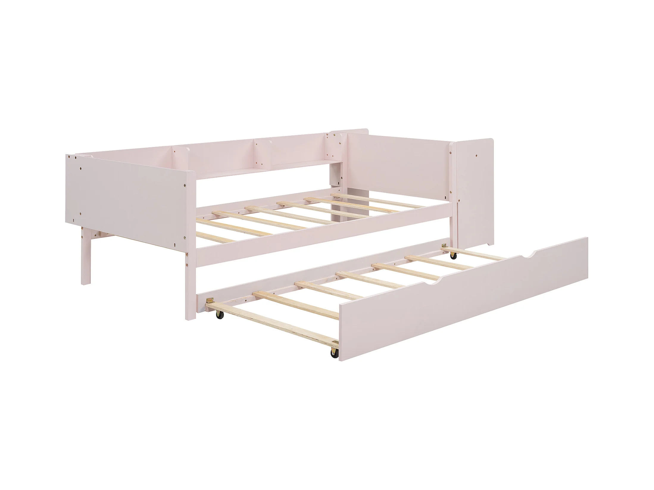 Lit plat 90x200 cm, avec lit escamotable, bureau intégré, trois étagères latérales, en pin, rose (241.9x112x73 cm)