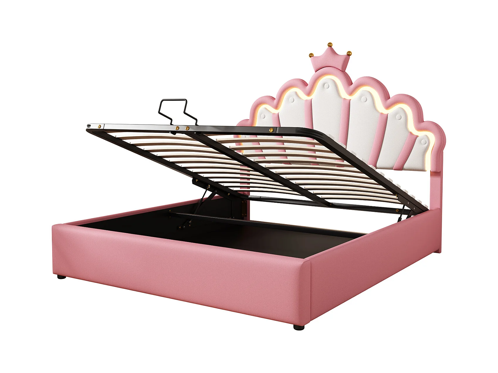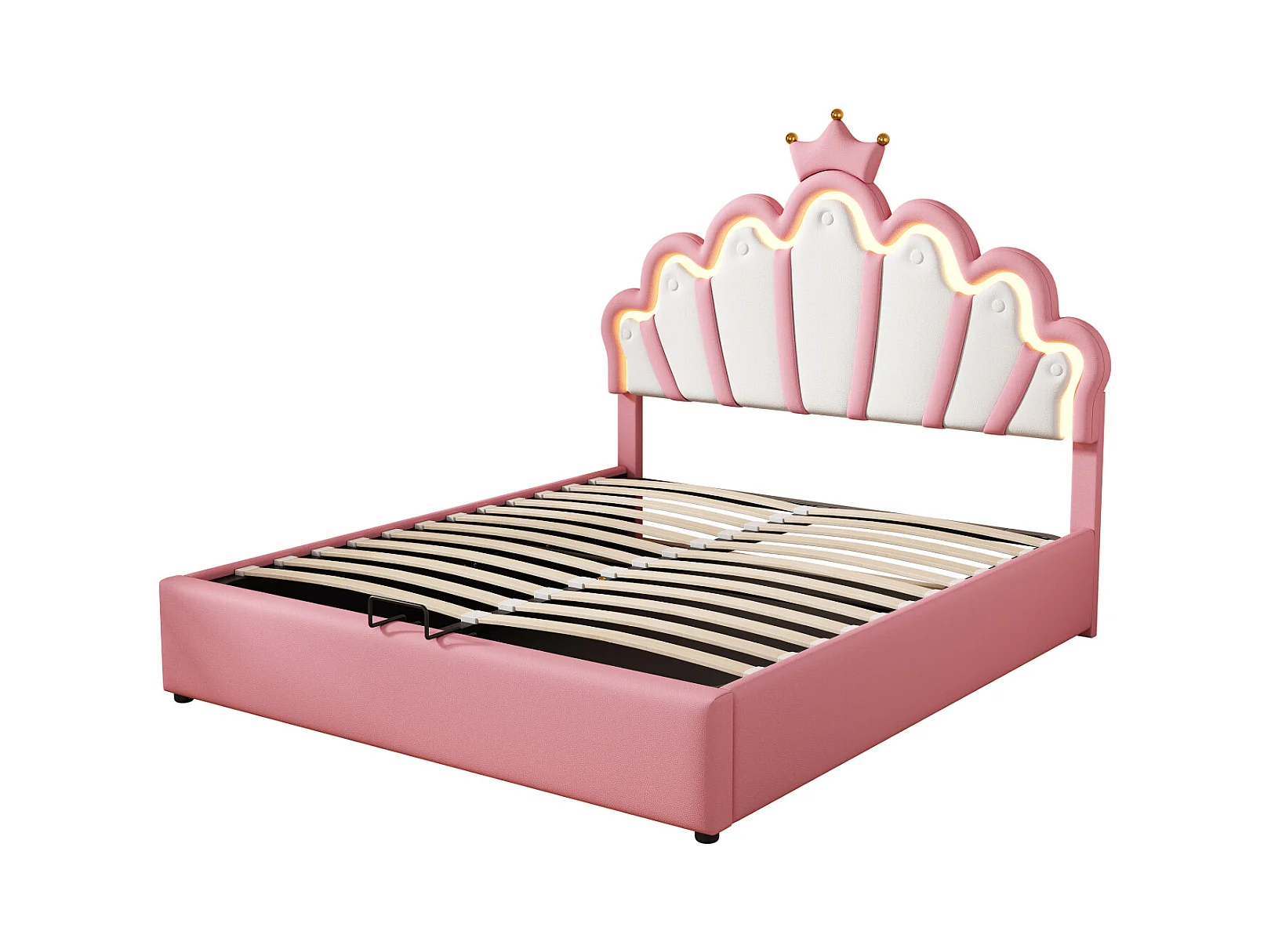Lit plat, lit capitonné, lit princesse, éclairage d'ambiance réglable, moulure couronnée, ROSE, 140 x 200 cm