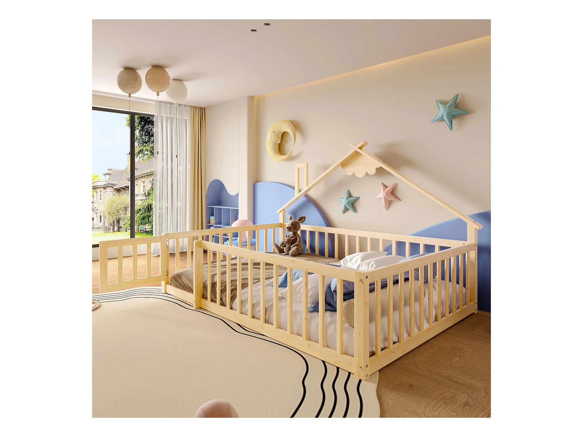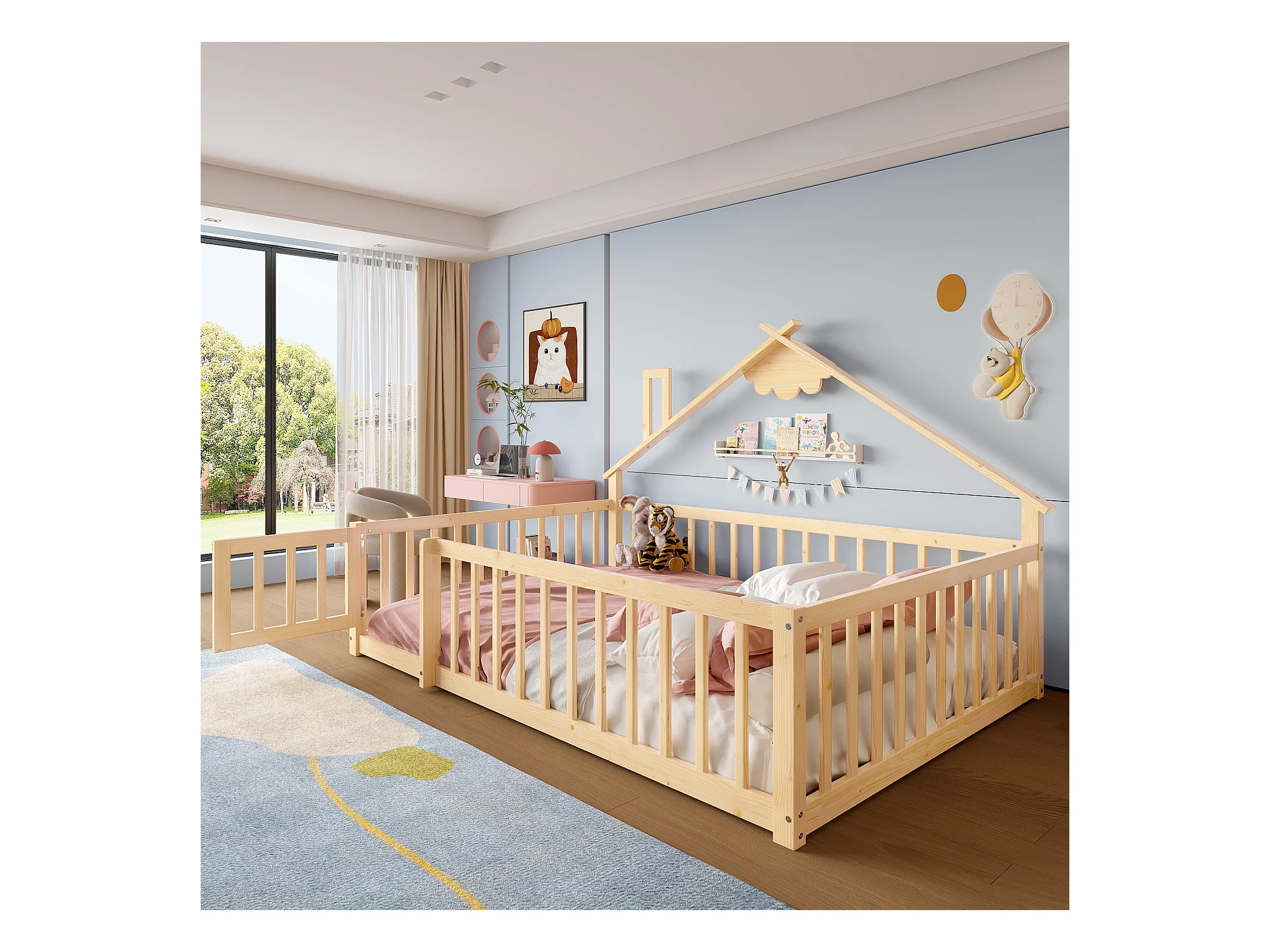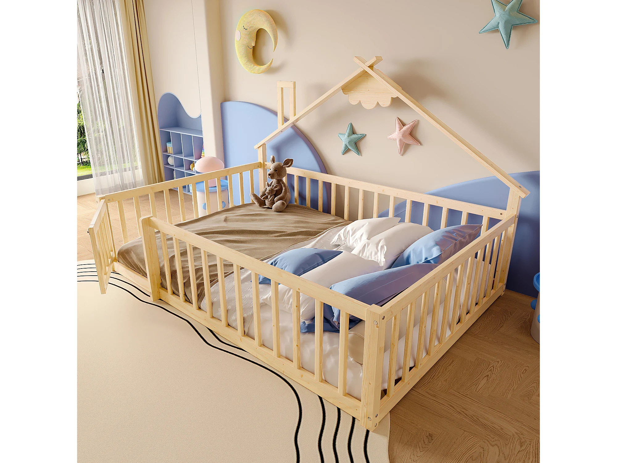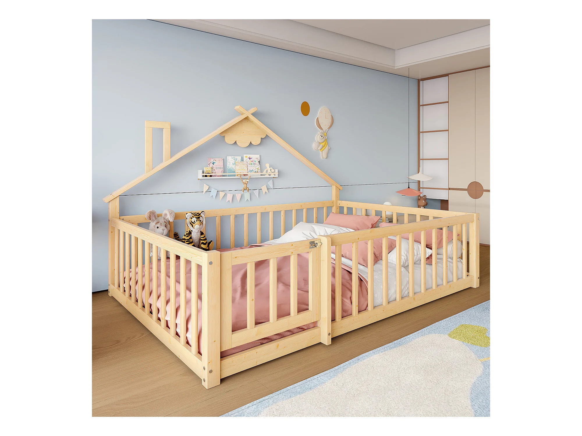 Lit plat pour enfant 140 x 190 cm, avec balustrade et verrou, en pin naturel (200x151x112 cm)