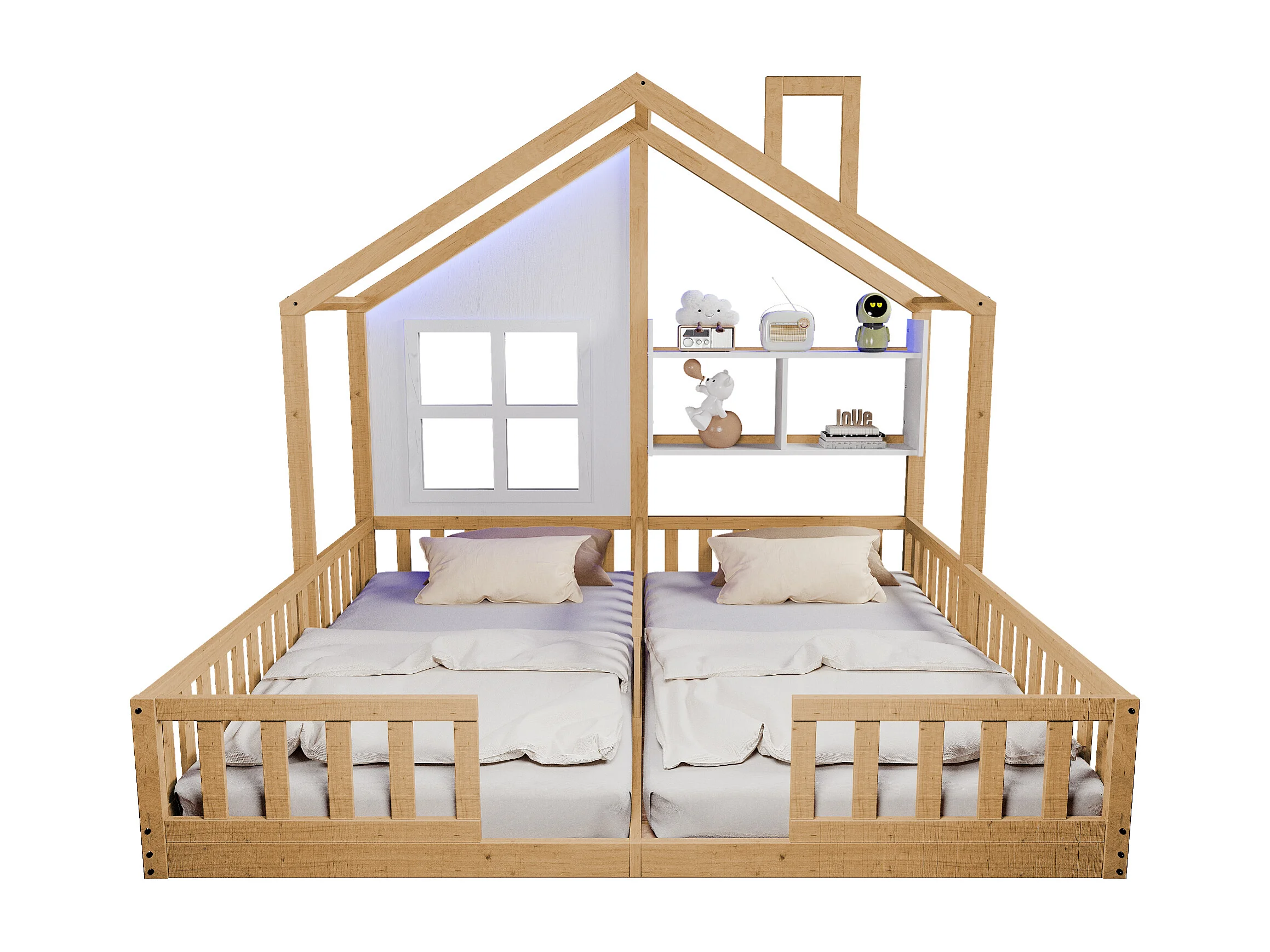 Lit plat pour enfant - 2 x 90 x 200 cm - style maison avec fenêtres - avec Leds + étagères de rangement - bois + MDF - naturel