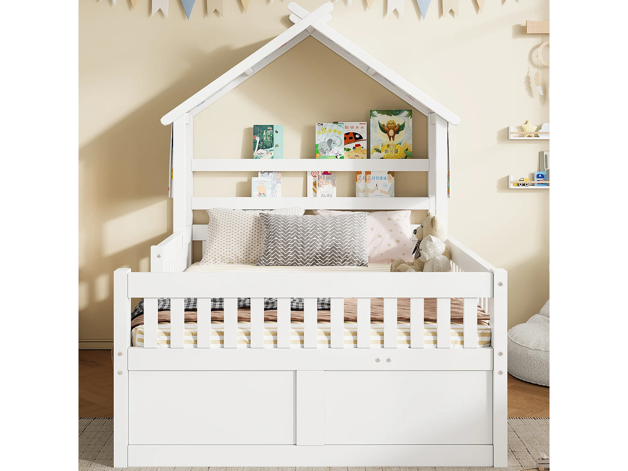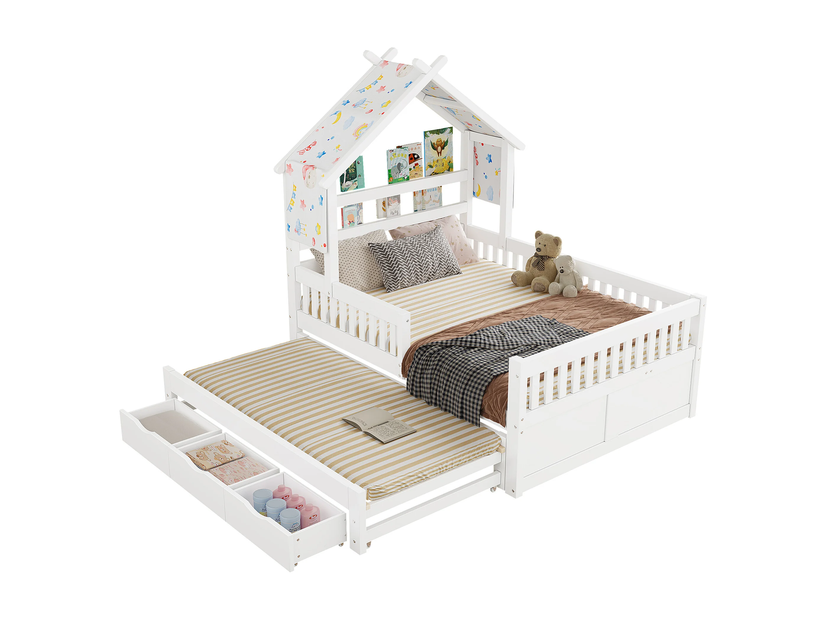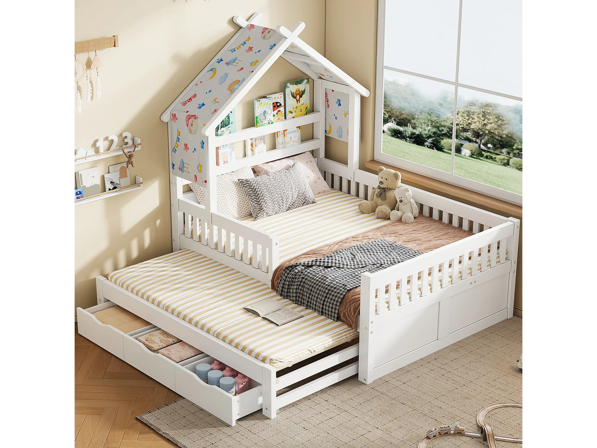 Lit plateforme en bois - 140 x 200 cm - avec lit gigogne 90 x 190 cm + tiroirs + barrières de sécurité - blanc