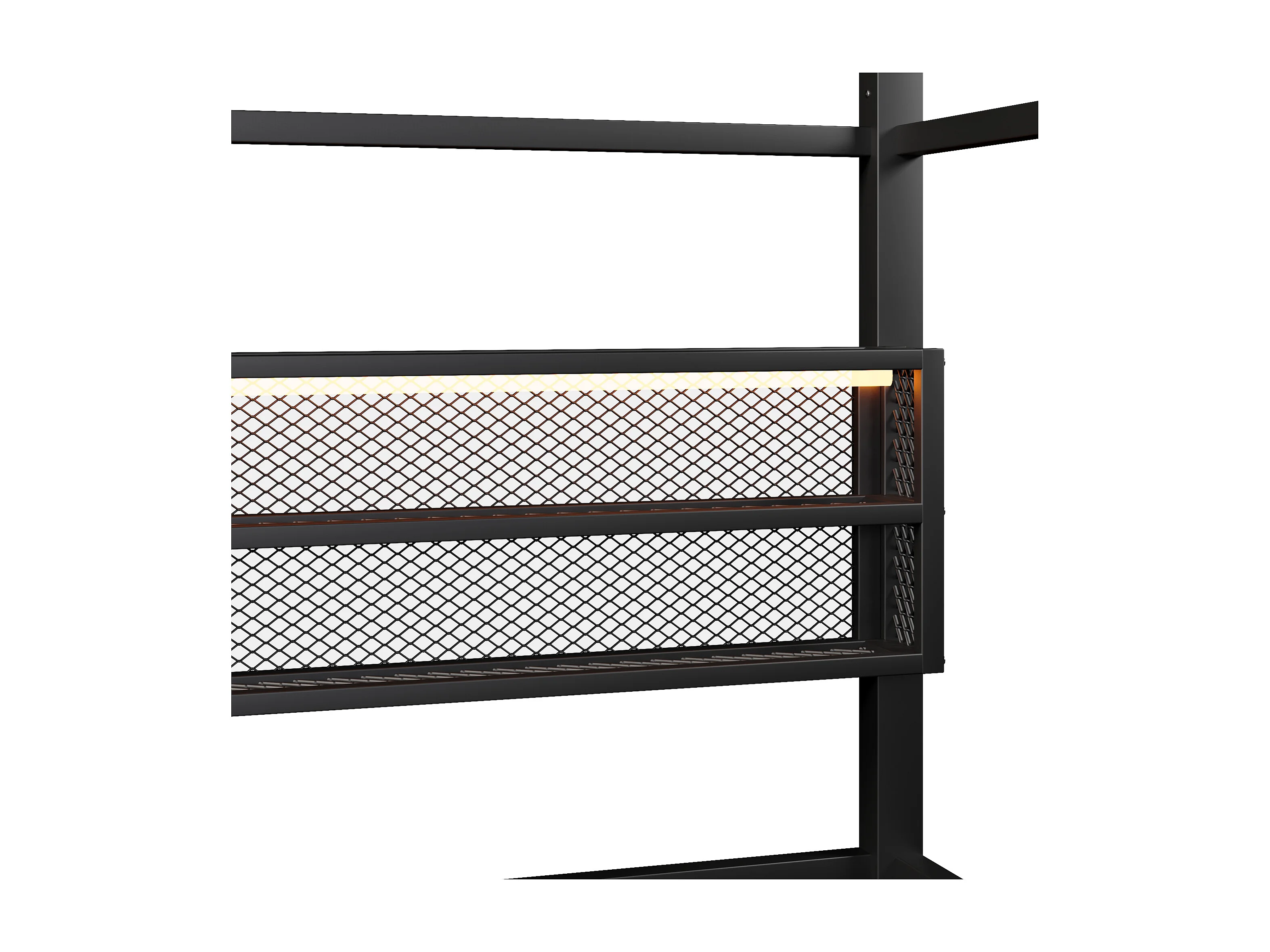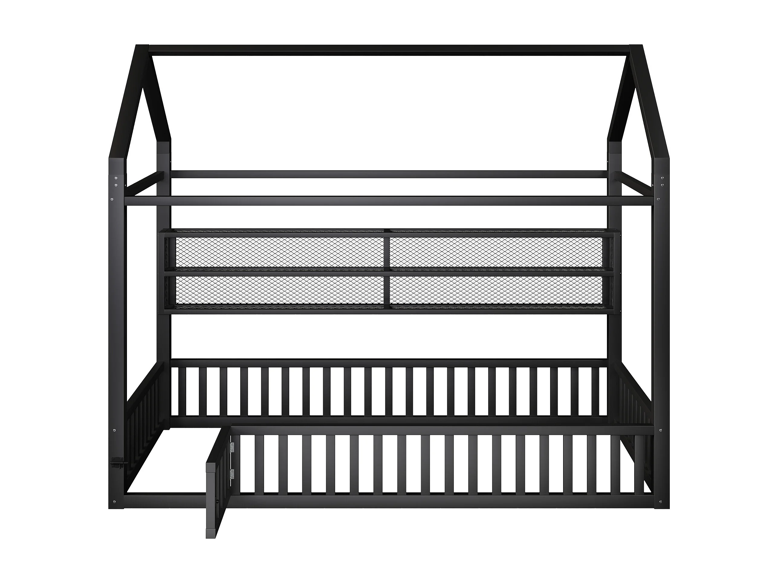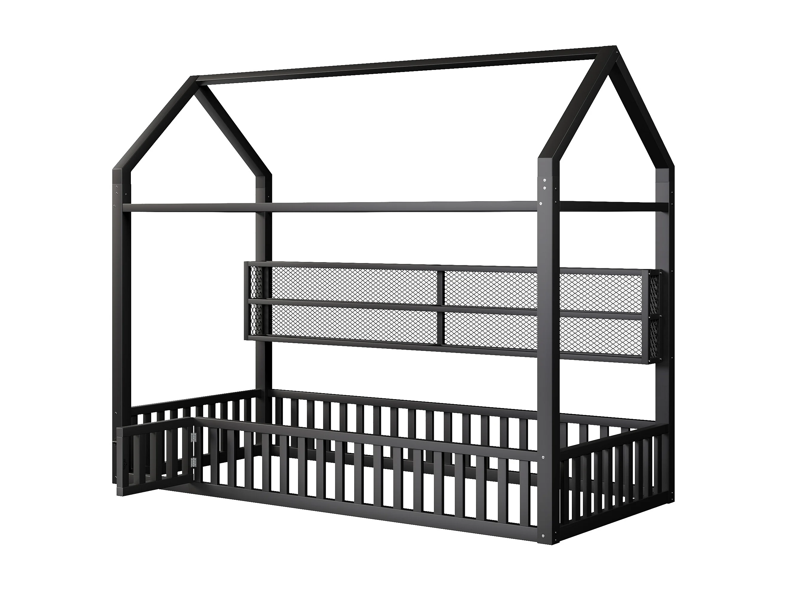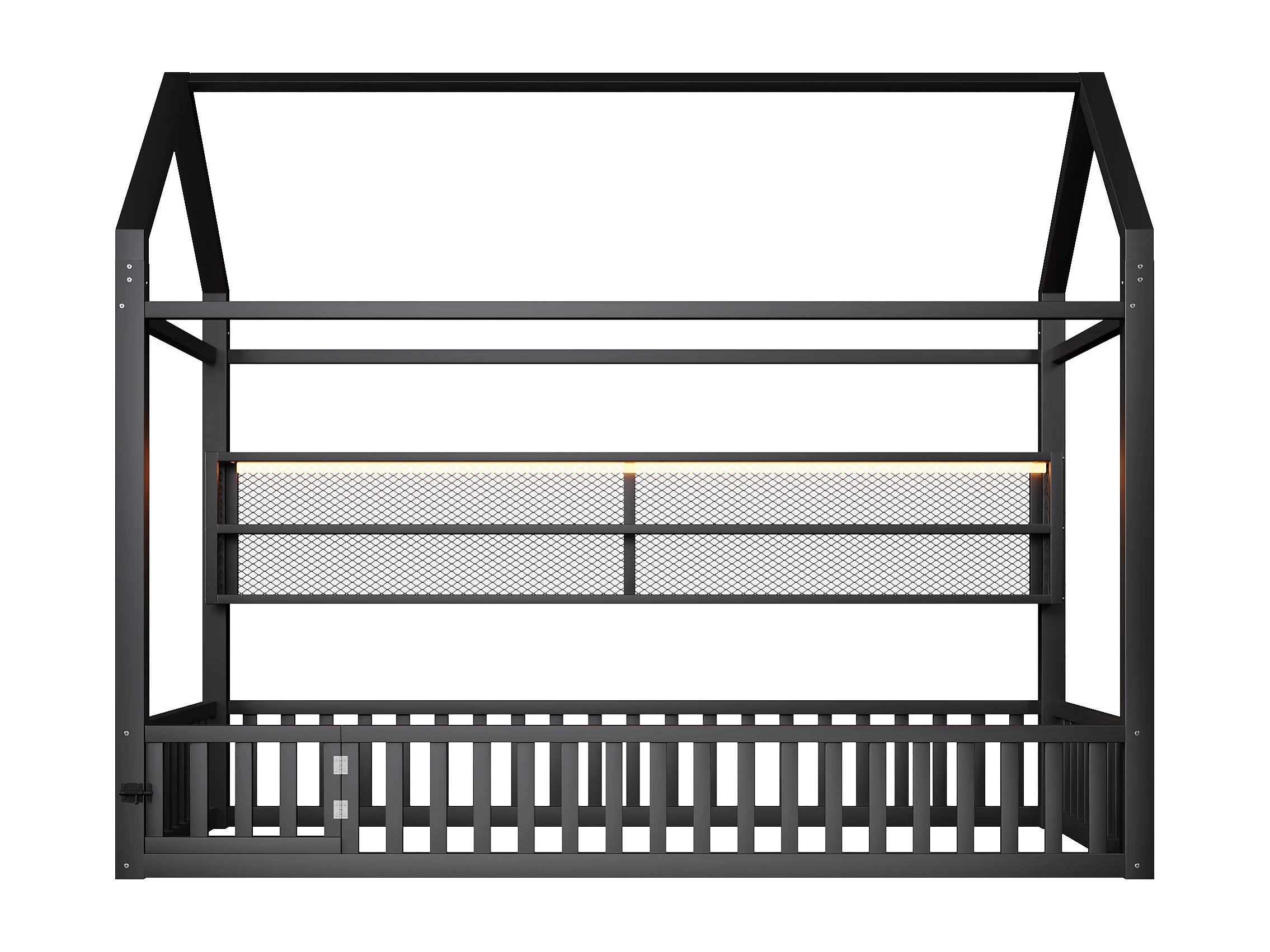 Lit plateforme en forme de maison pour enfant - 90 x 200 cm - avec barrière + Leds + rangement - métal - noir