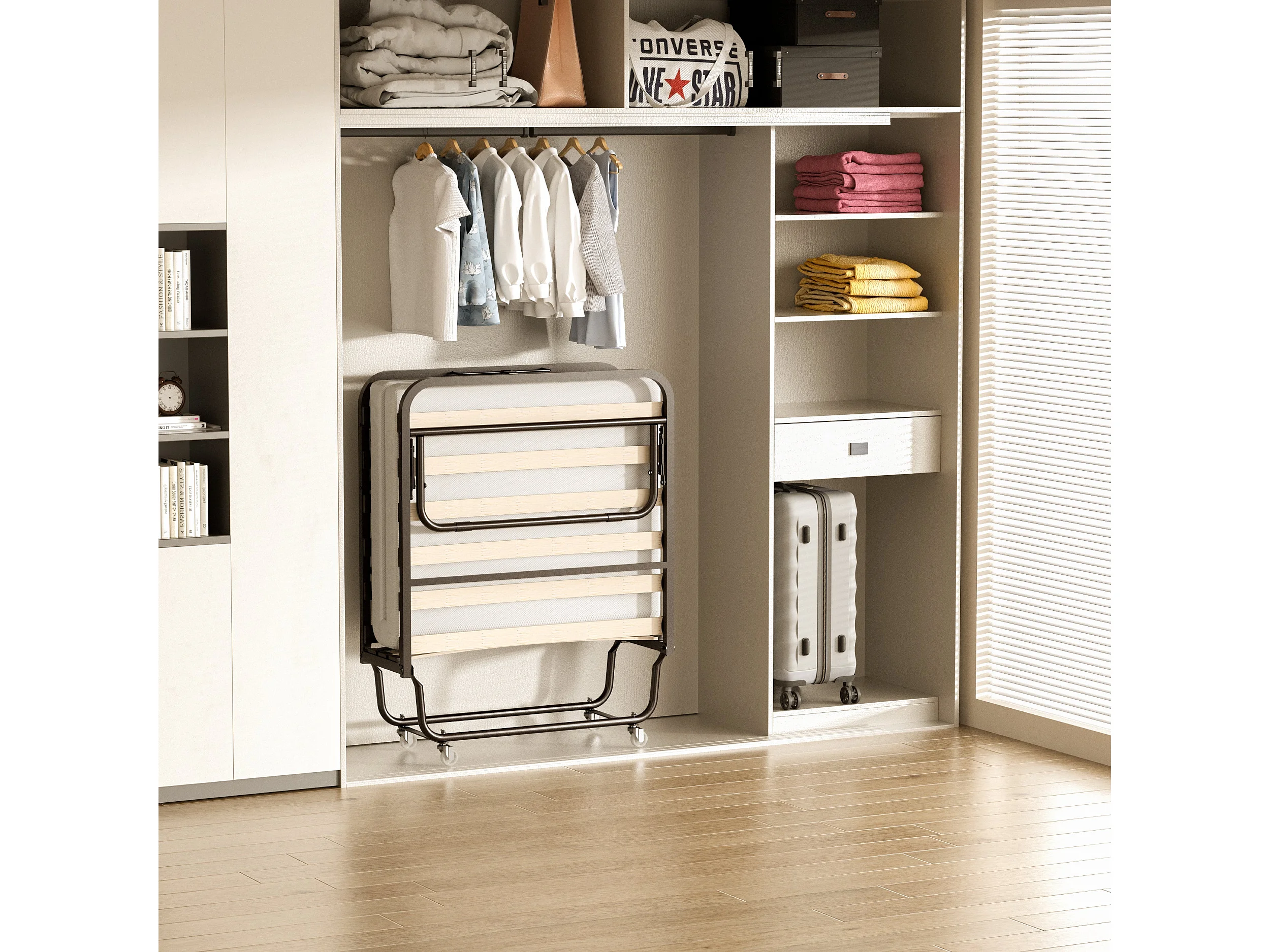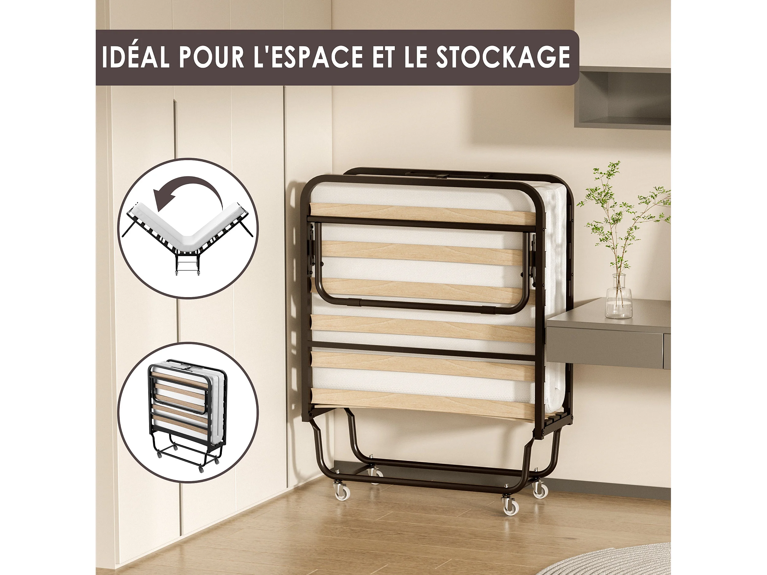 Lit Pliant 90x190 CM avec Matelas de 10cm, Lit Pliable 1 Personne Adulte, 4 roulettes, 2 Min Assembler