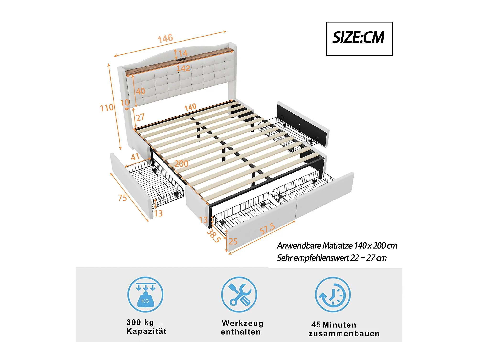Lit Polster 140 x 200 cm, table de nuit avec port USB et étagère, lit double avec 4 tiroirs, tissu en lin beige.