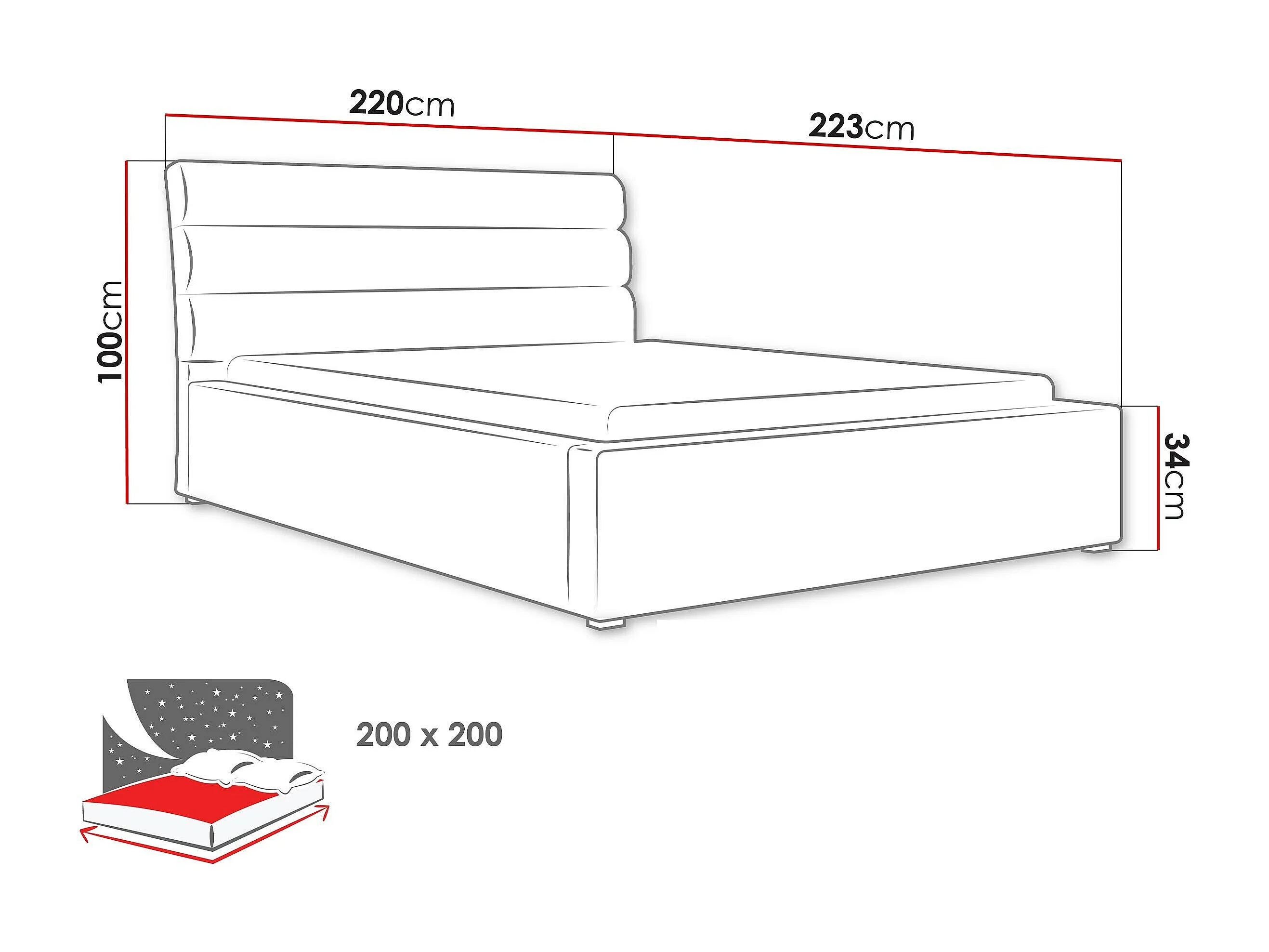 Lit Pomona 108, Double, Gris, 200x200, Tissu, Disponible, 220x223x100cm
