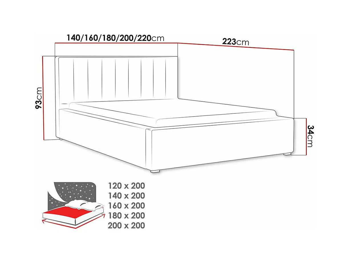 Lit Pomona 109, Double, Gris, 140x200, Tapisserie, Sommier à lattes, 160x223x93cm