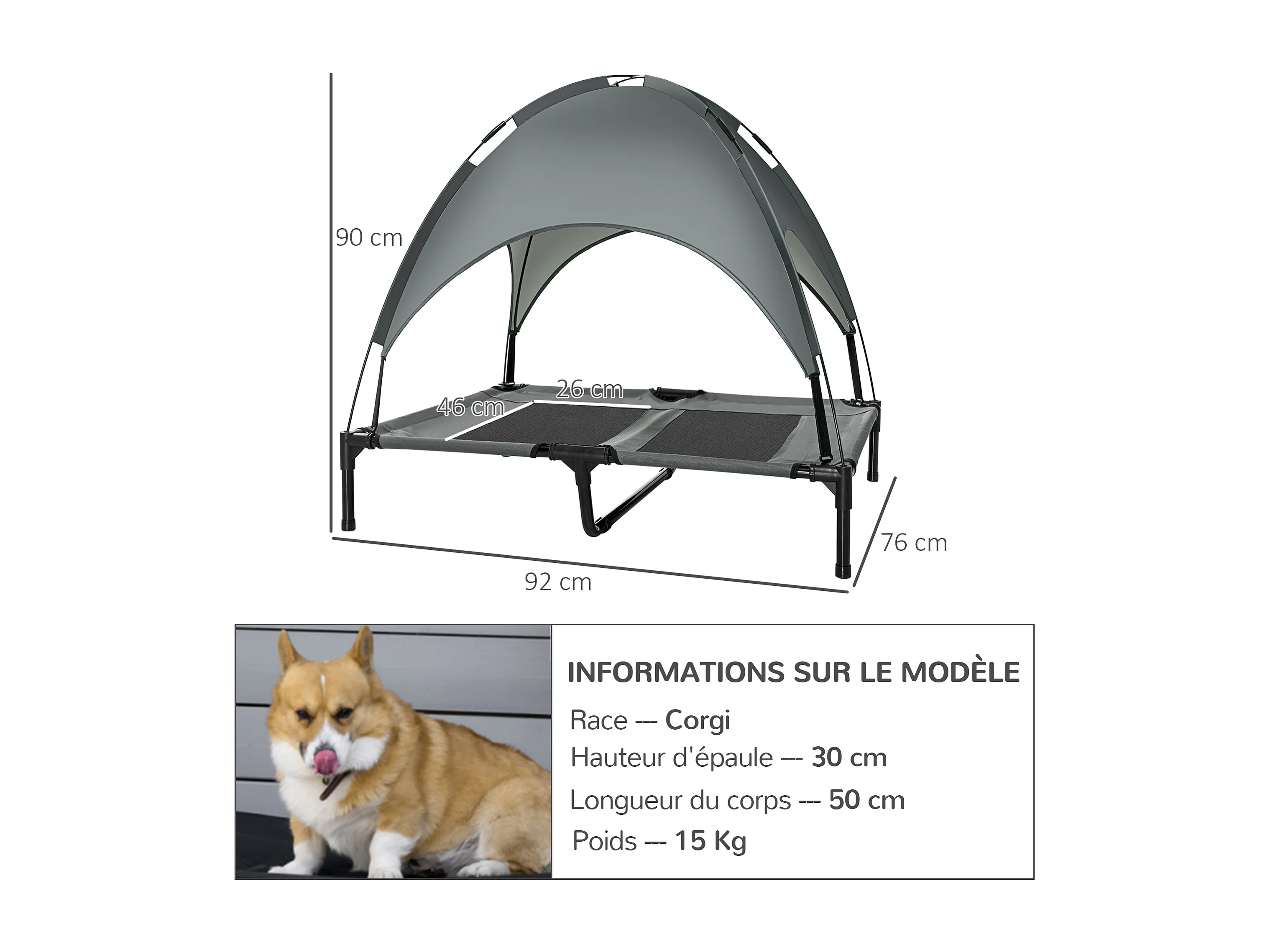 Lit pour chien chat ur pied lit de camp lit urélevé rafraîchiant velum anti-UV Oxford micro-perforé paraol et ac de tranport inclu dim. 92L x 76l x 90H cm gri noir