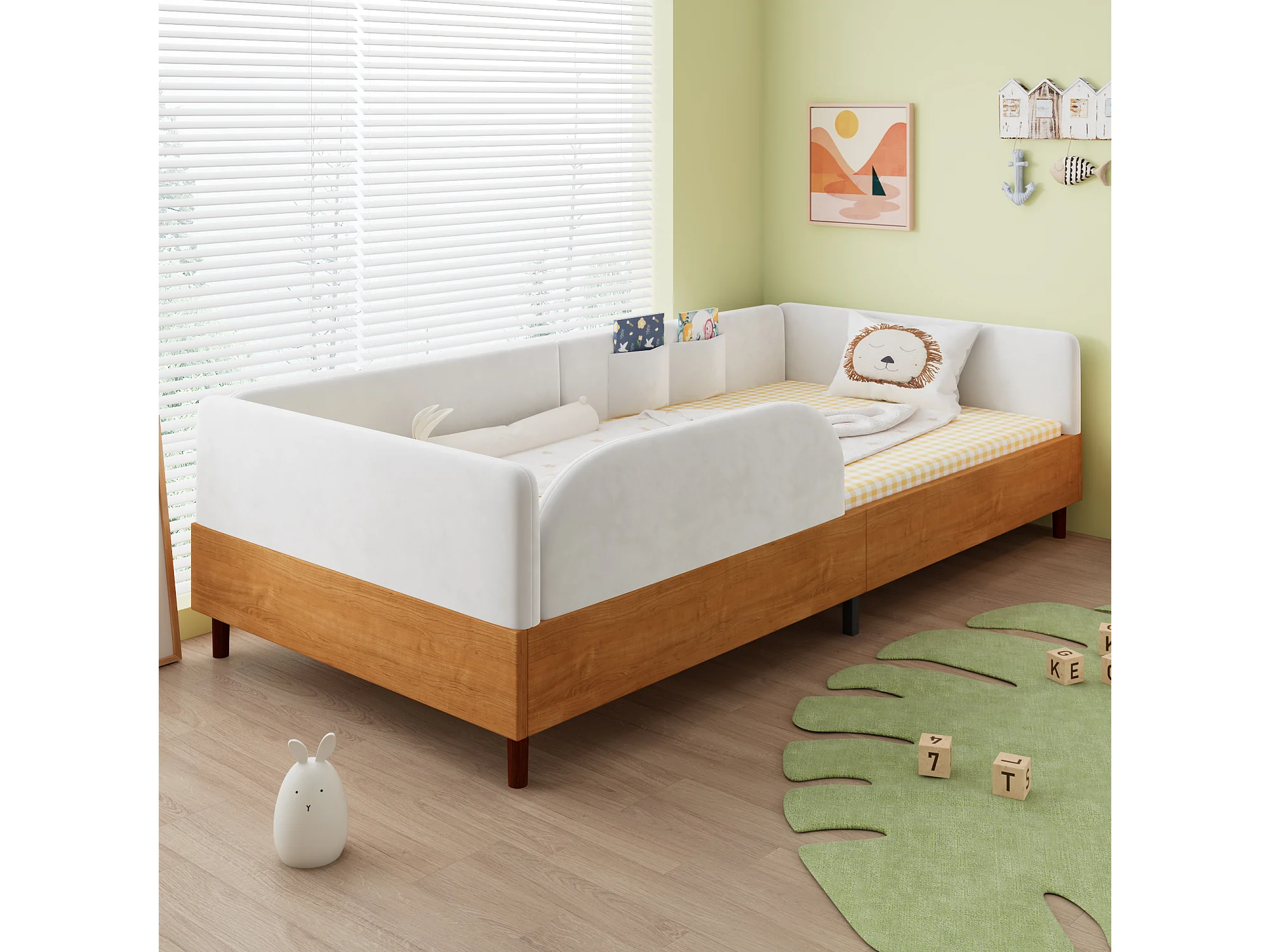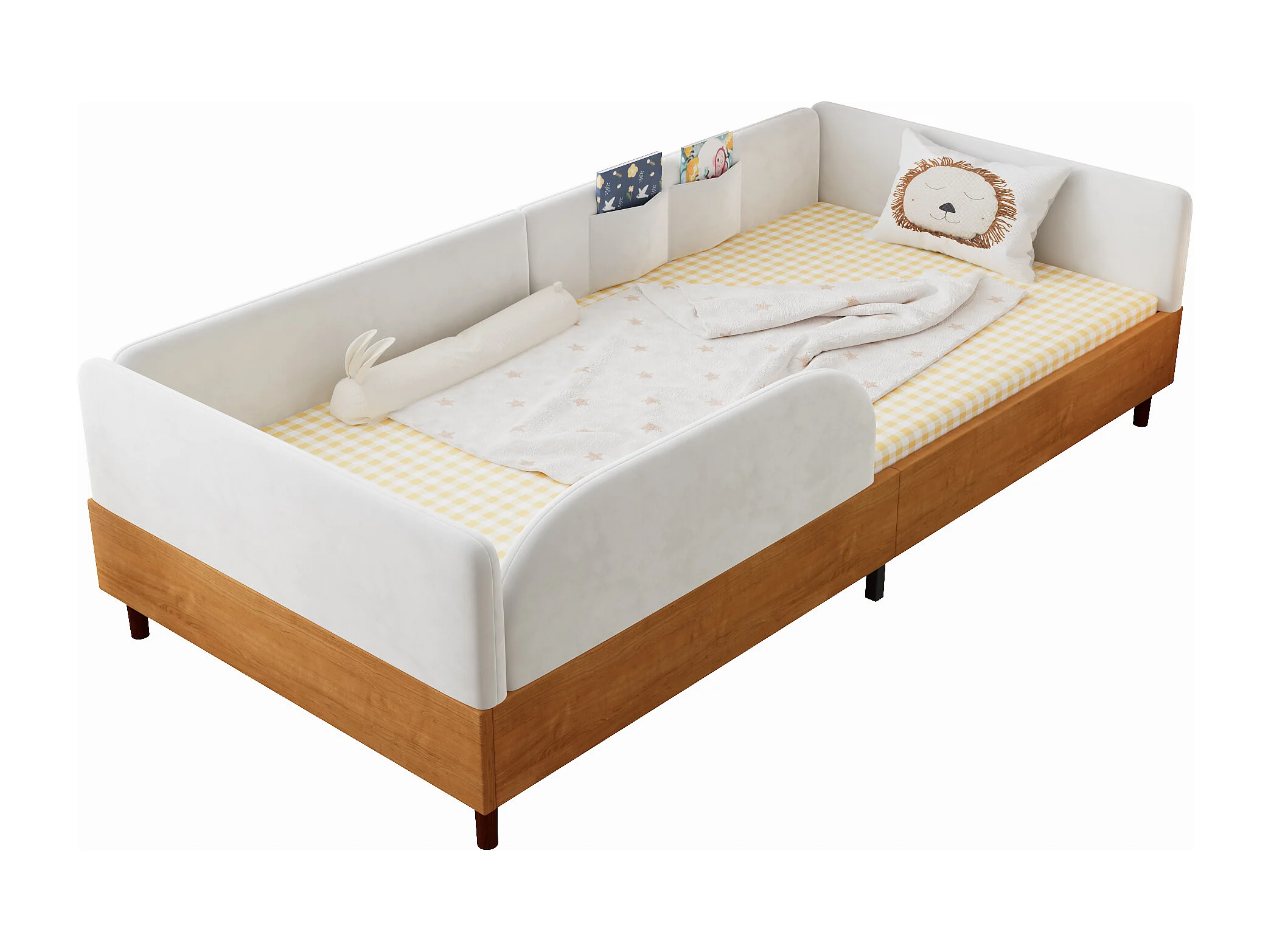 Lit pour enfant rembourré 90x200 cm - avec 2 sacs de rangement - Velours + contreplaqué - Blanc + Naturel(sans matelas)