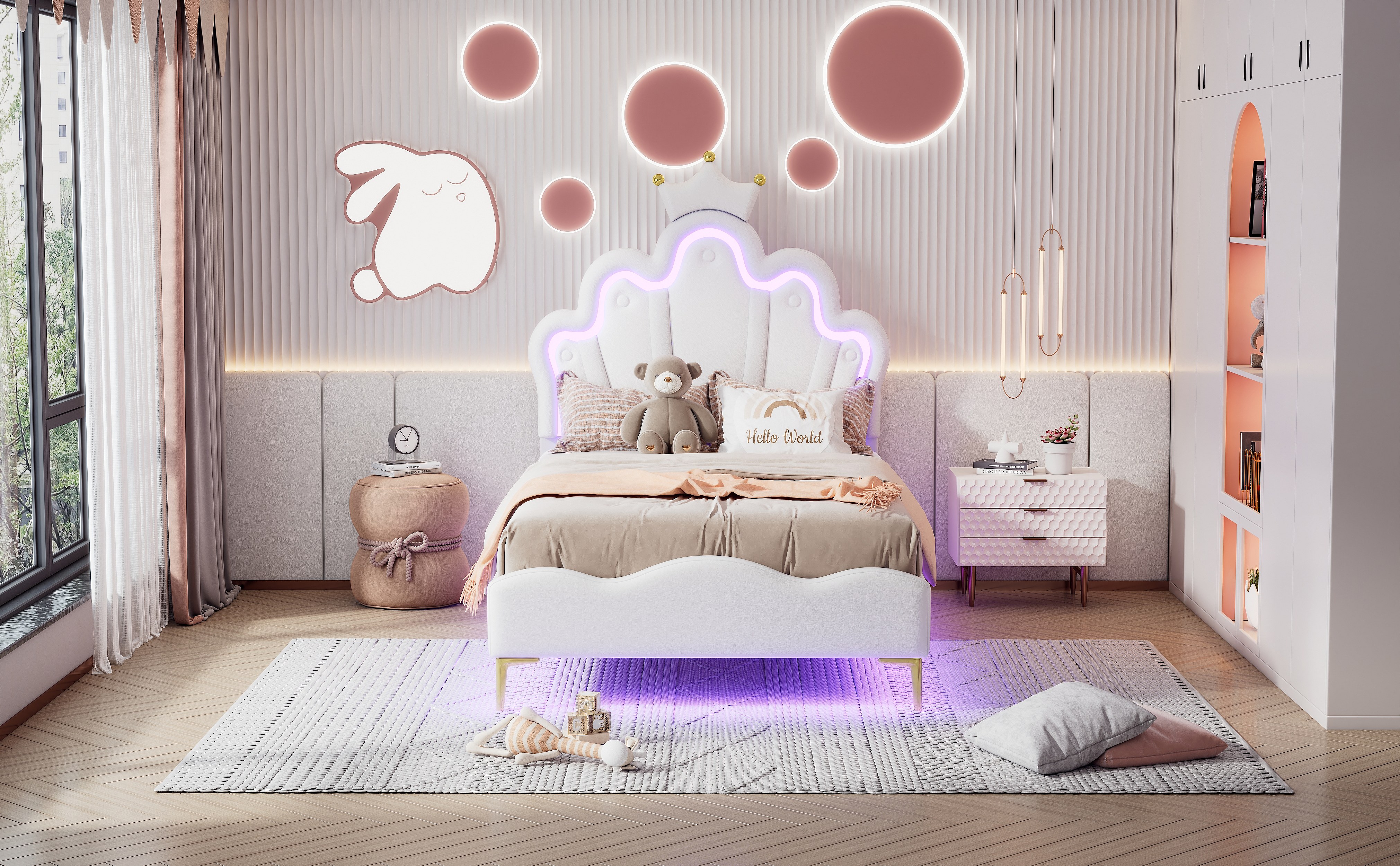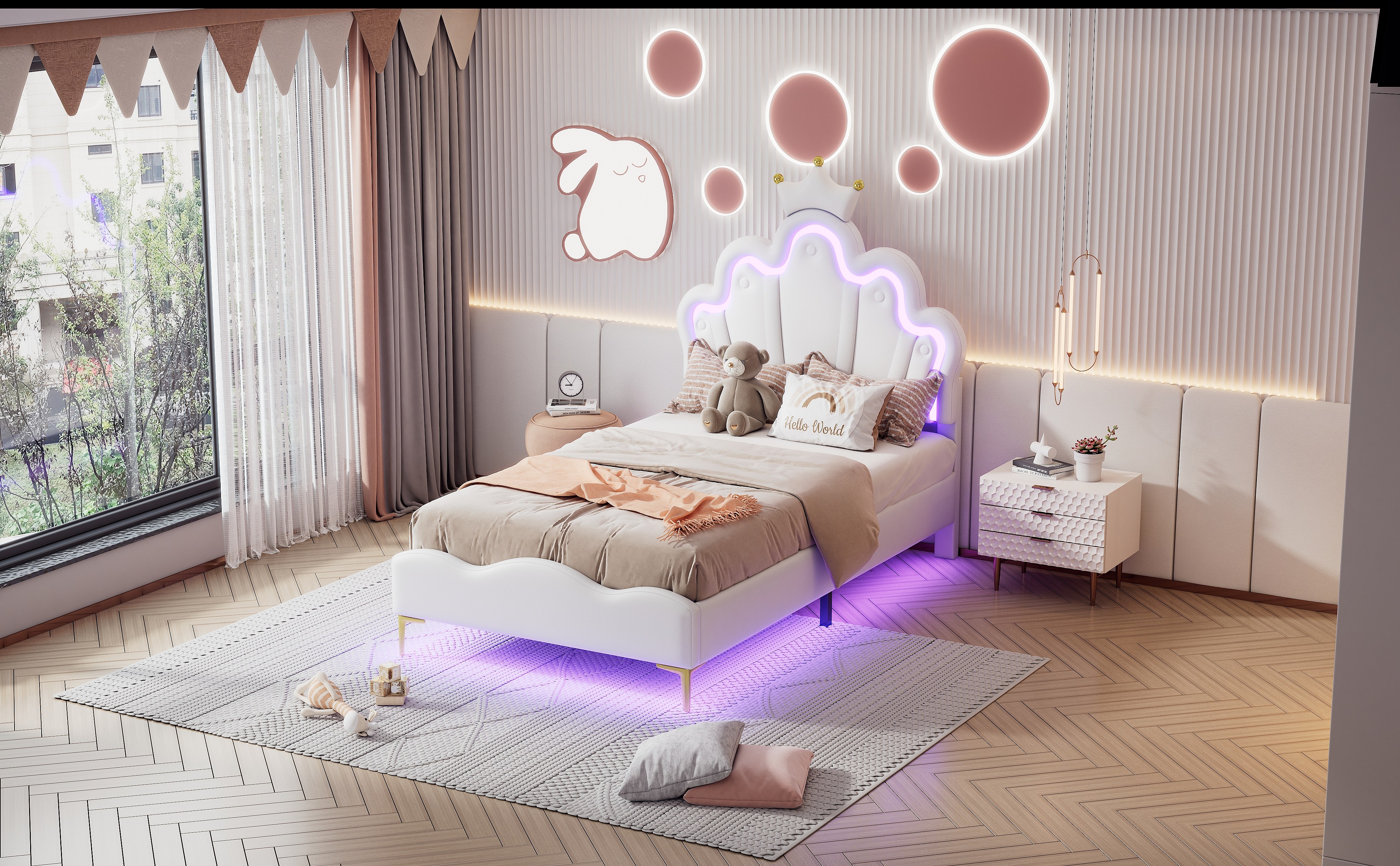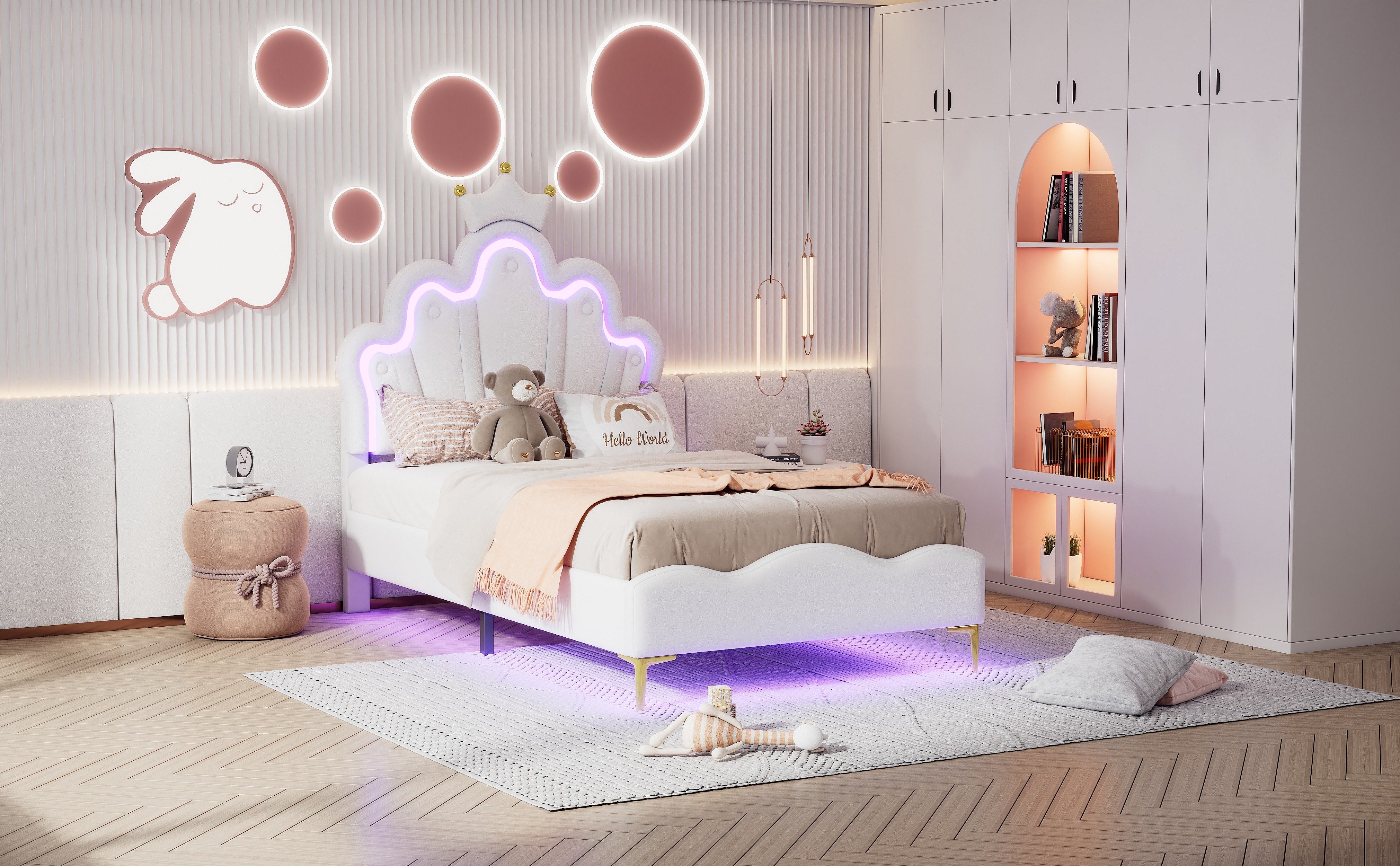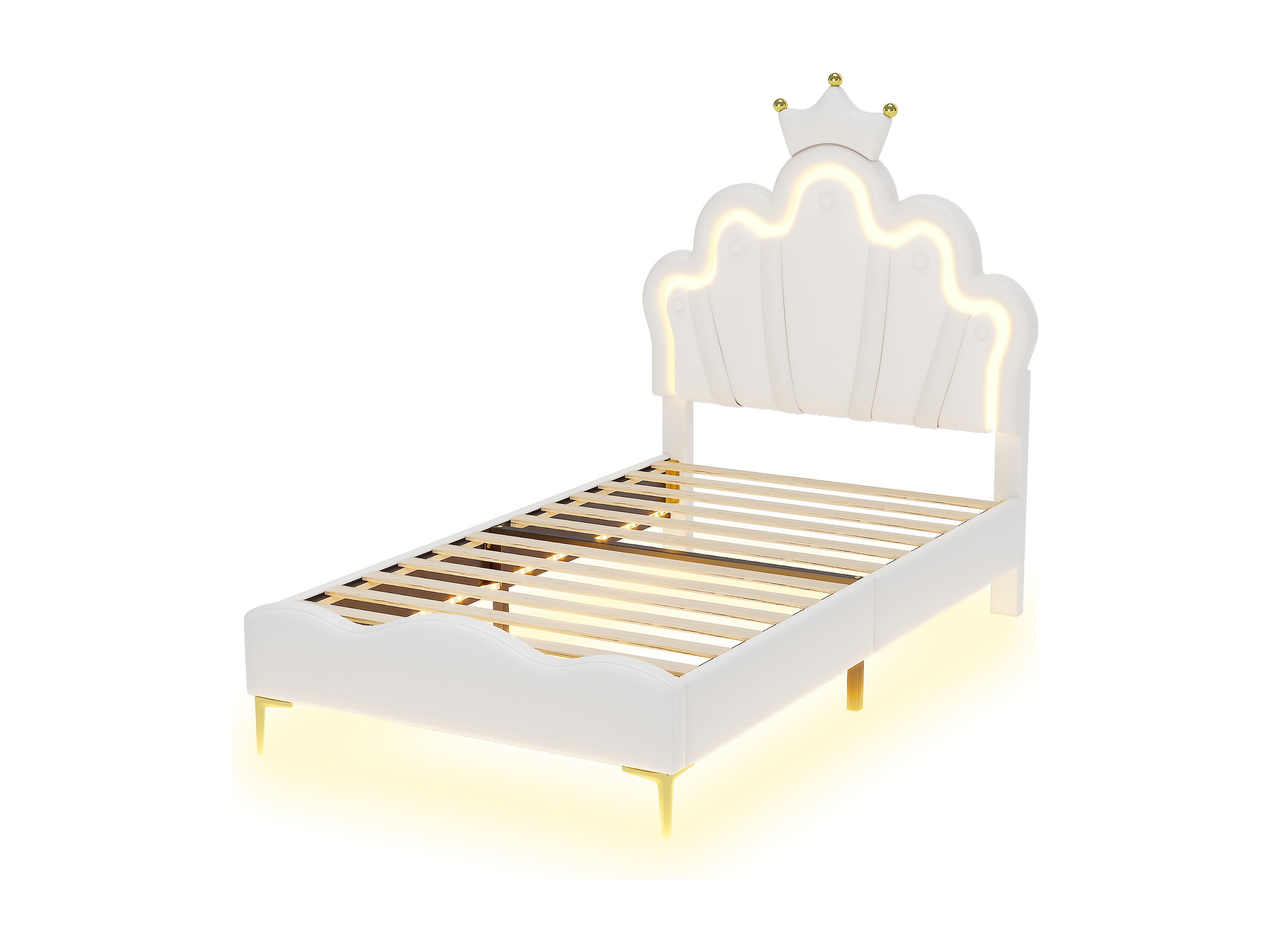 Lit princesse 90x200 cm blanc, tête de lit en forme de couronne, revêtement PU rembourré, bande LED réglable intégrée