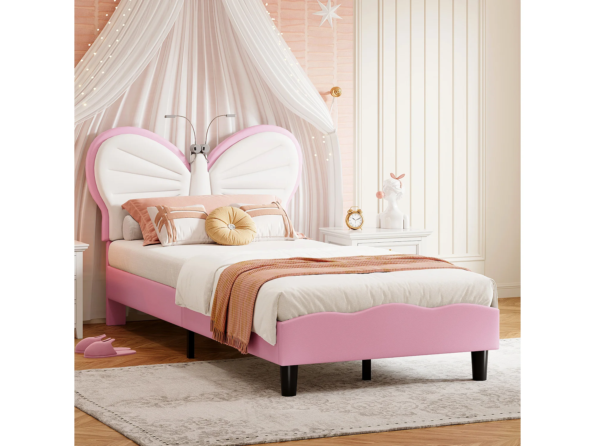 Lit princesse 90x200 cm,lit fille,lit enfant,avec deux lampes de lecture,tête de lit en forme de papillon,velours+PU,rose