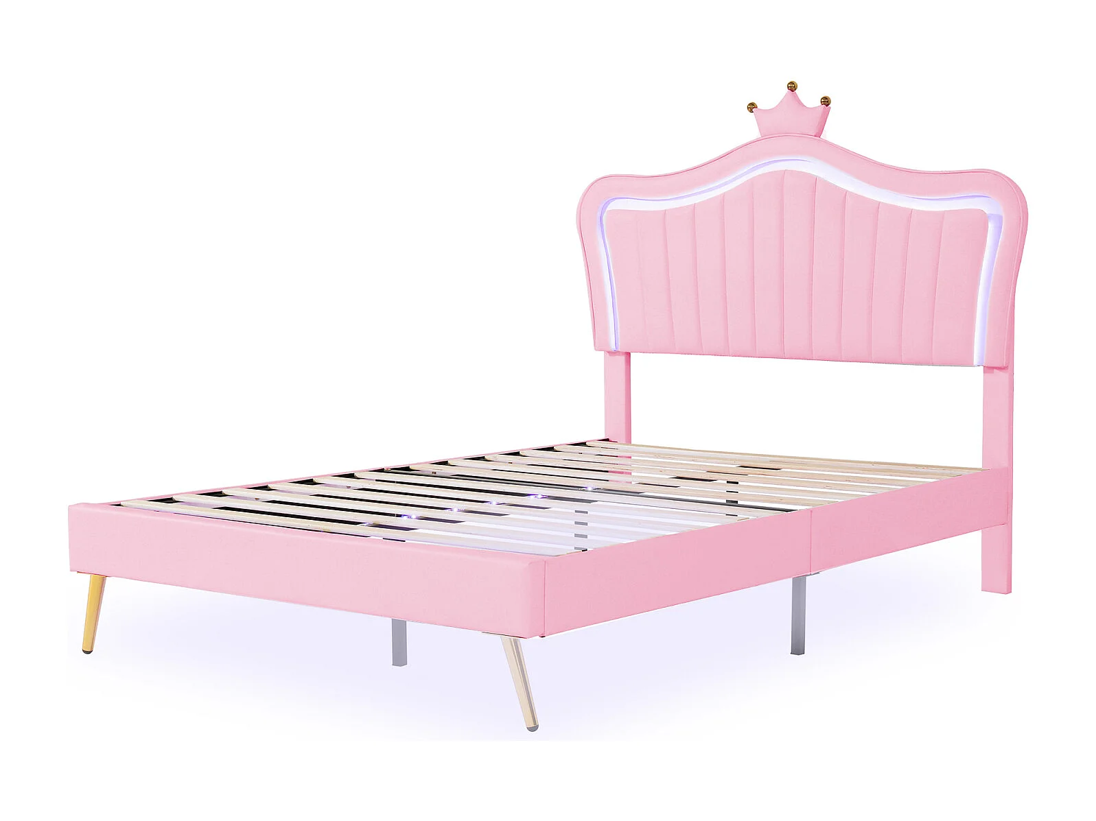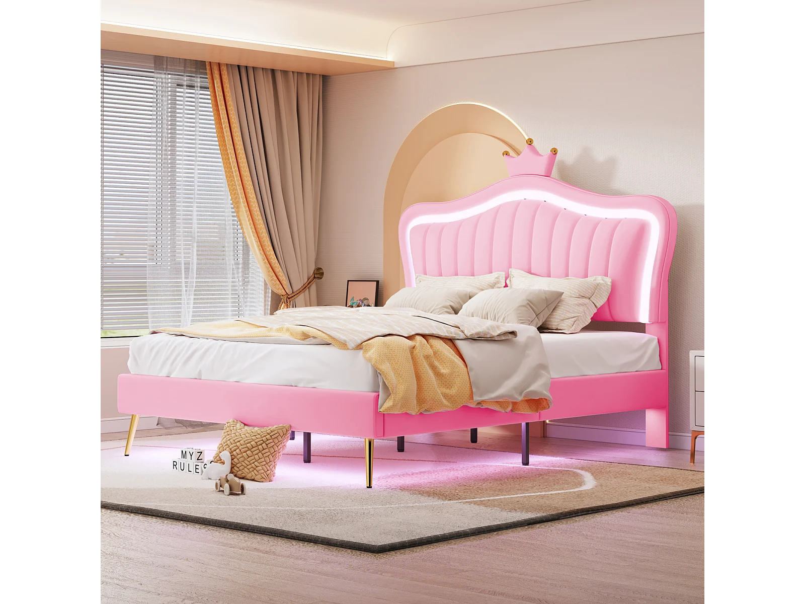 Lit princesse pour fille 140x200 cm en PU rose, tête de lit couronne avec LED, sommier inclus et dossier rembourré – Sans matelas