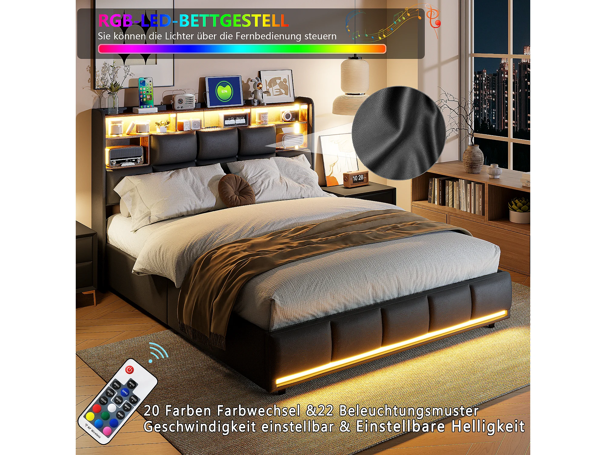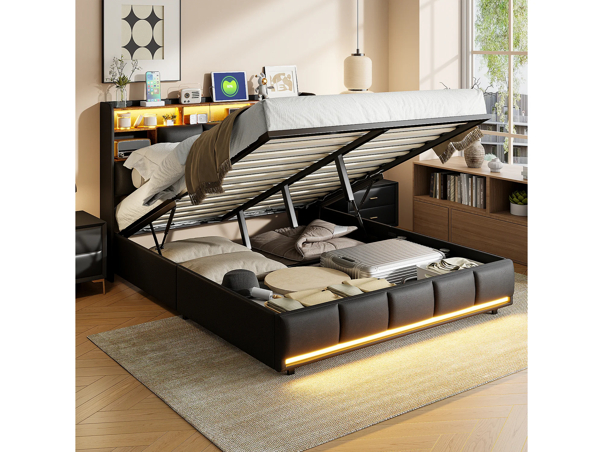 Lit rembourré 140×190 cm avec prises USB et secteur, lit enfant avec sommier à lattes et rangement, lit coffre LED, similicuir noir