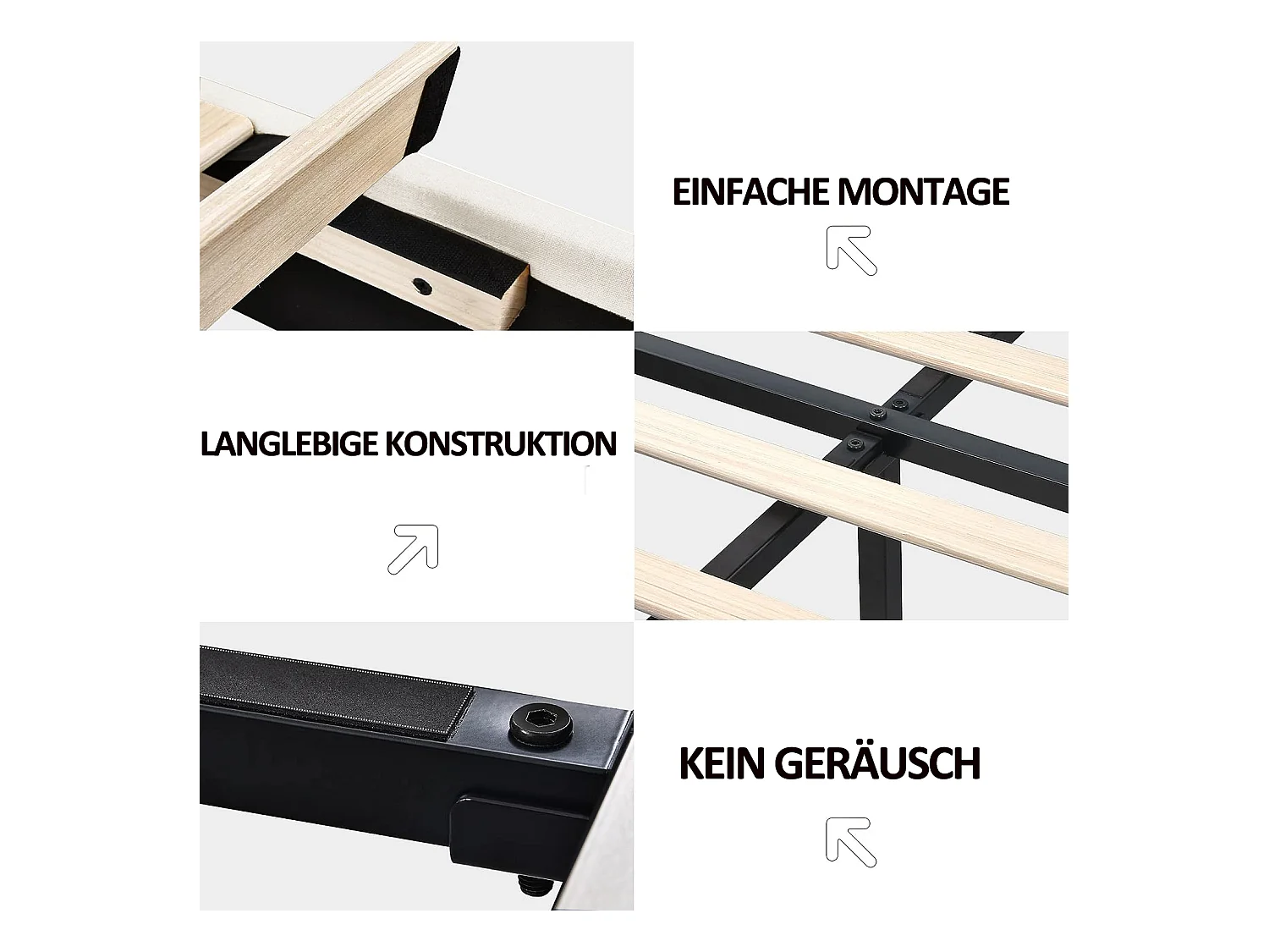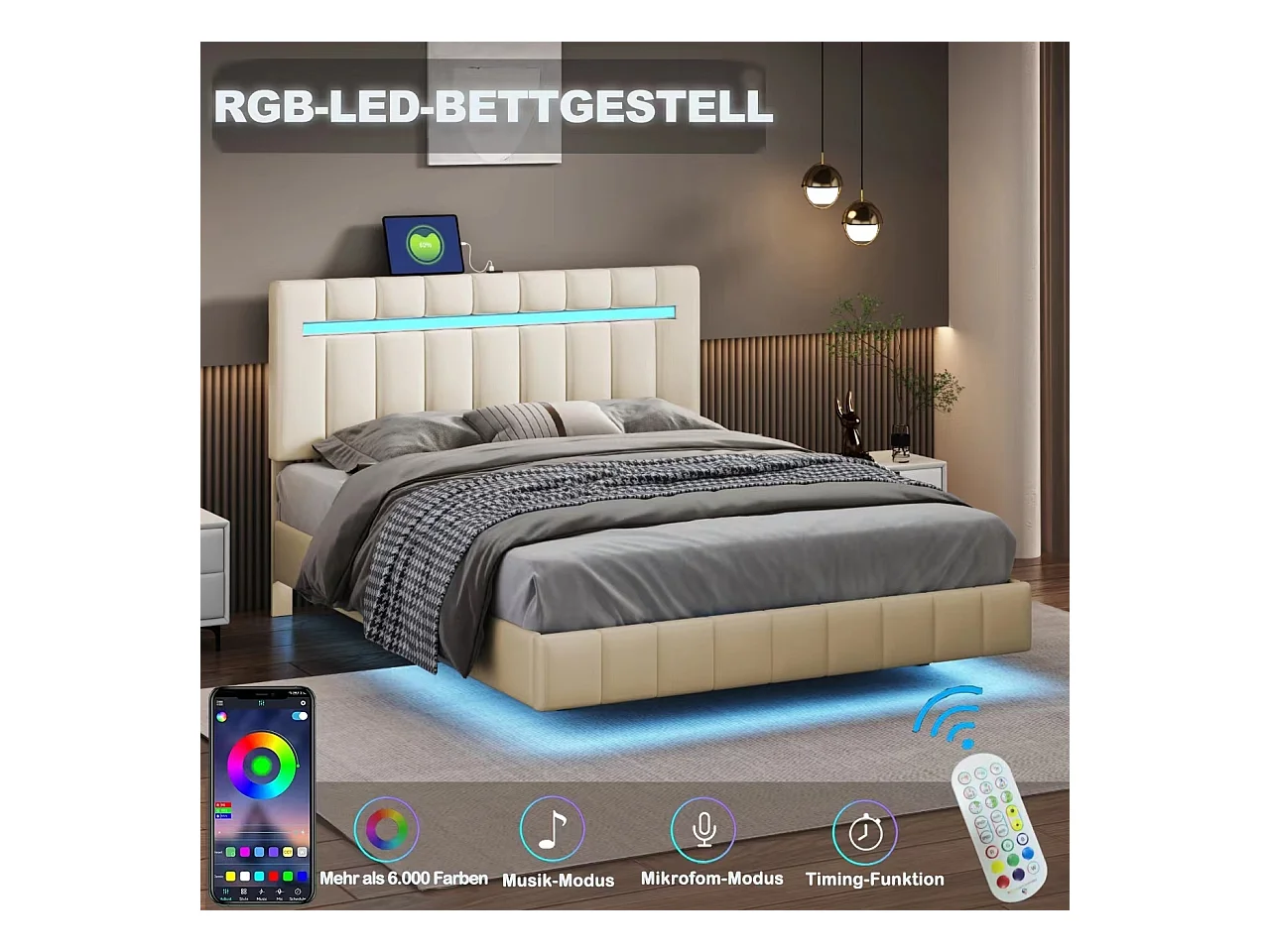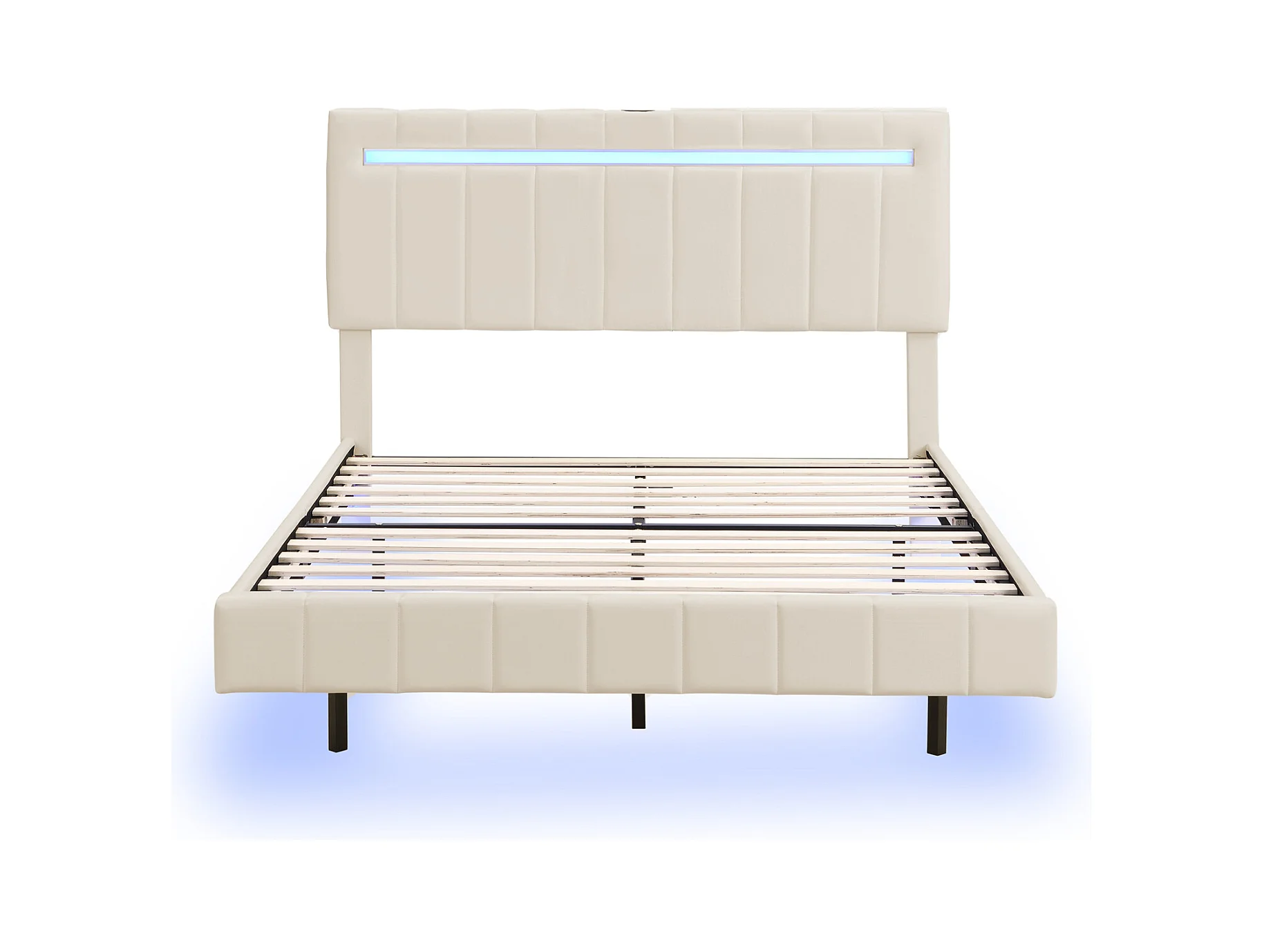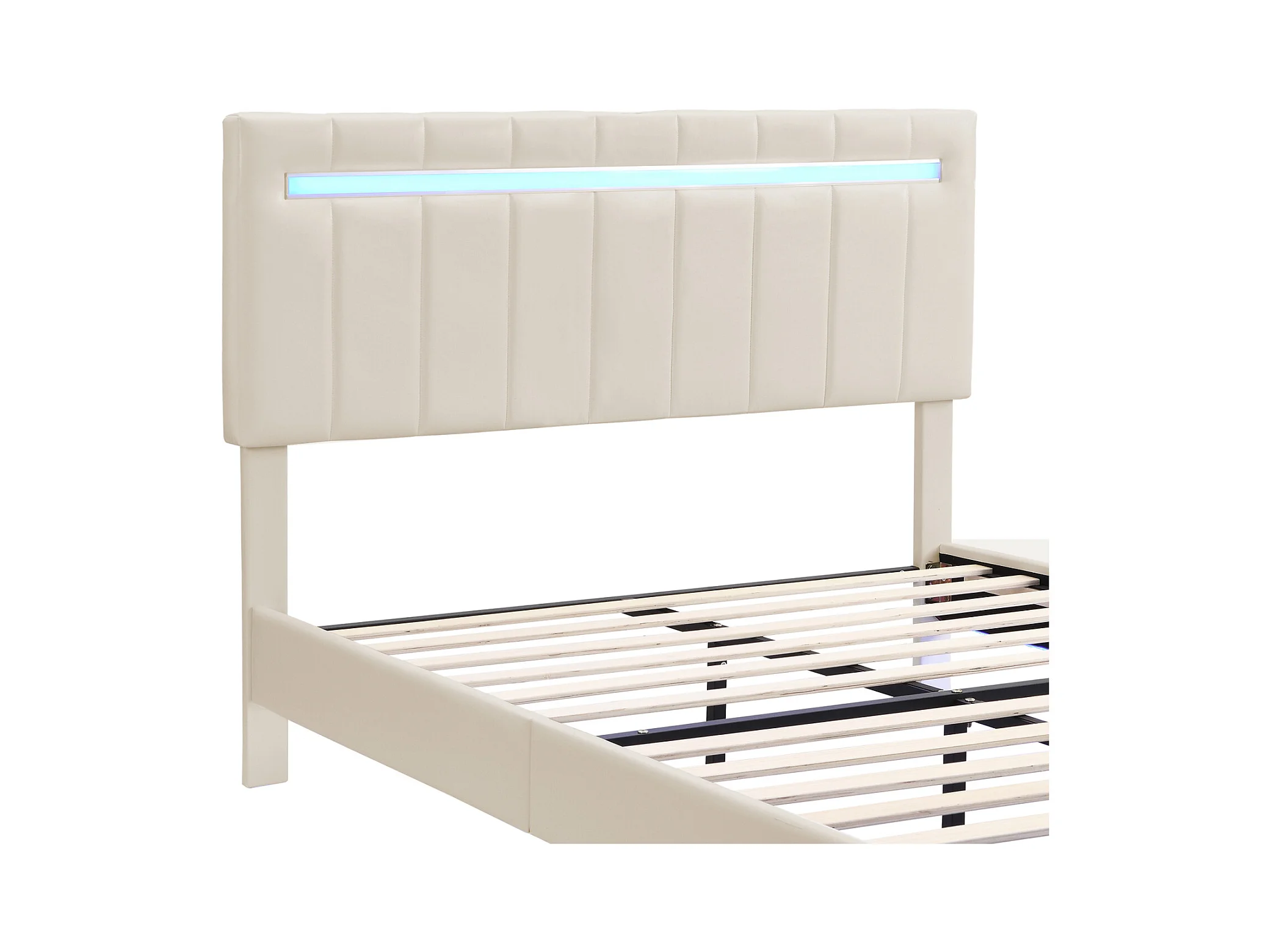 Lit rembourré 140 x 200 cm, cadre de lit flottant rembourré avec lumières LED et tête de lit design, lit d'appoint plat en lin doux pour la peau beige