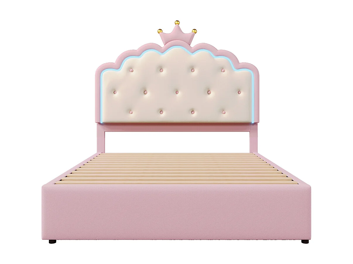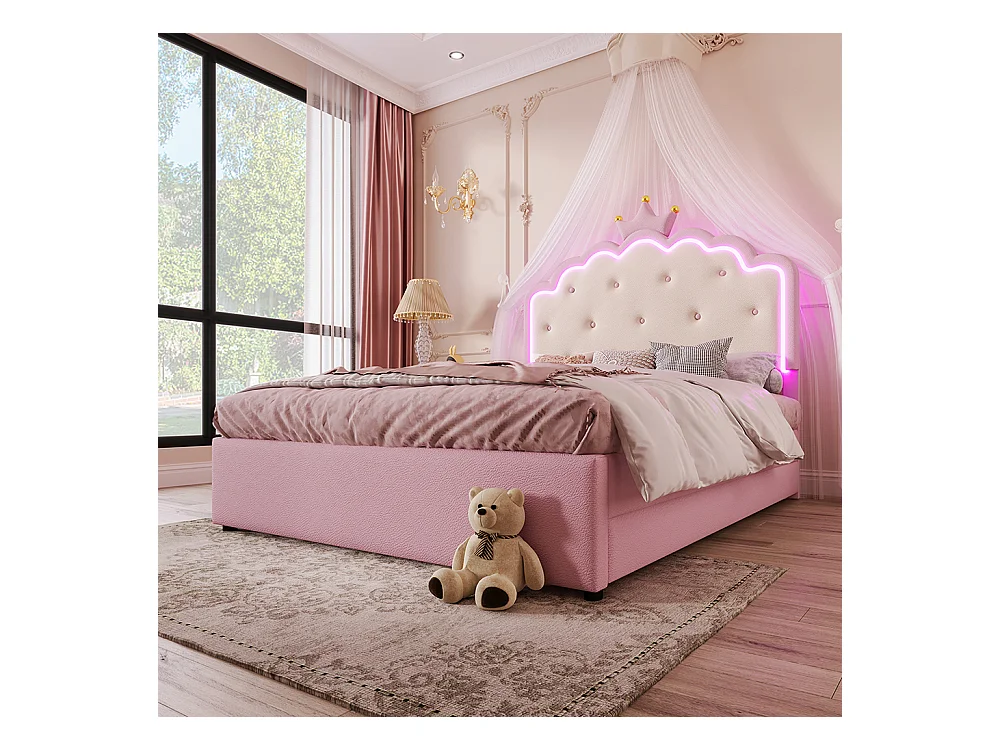 Lit rembourré 140 x 200 cm, éclairage d'ambiance avec télécommande, forme princesse, lit escamotable, PU, rose