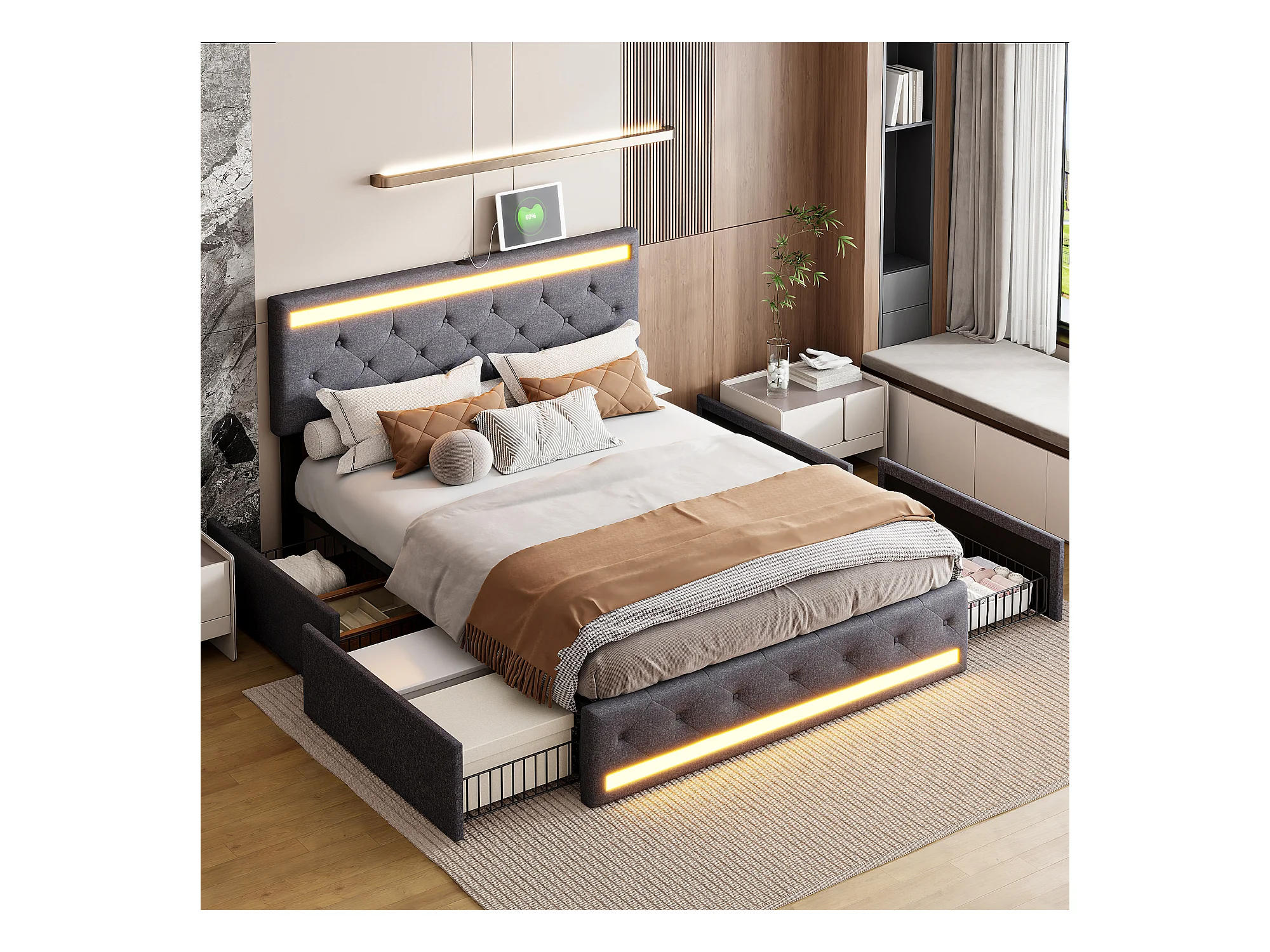 Lit rembourré 140 x 200 cm en velours,Tête de lit réglable,4 tiroirs,éclairages LED,lit double,gris