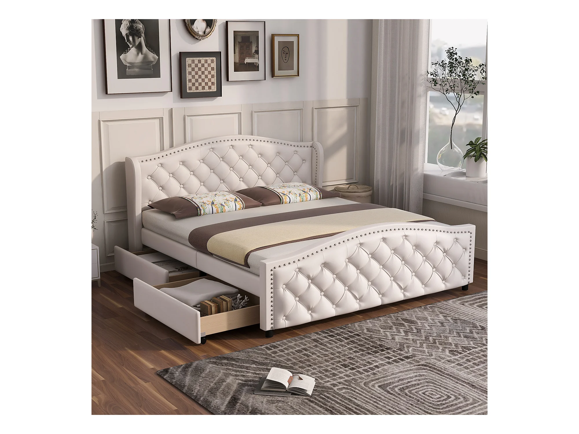 Lit rembourré 140 x 200 cm - lit avec cadre à lattes, 2 tiroirs et tête de lit avec rivets à tiroir bois / cuir synthétique