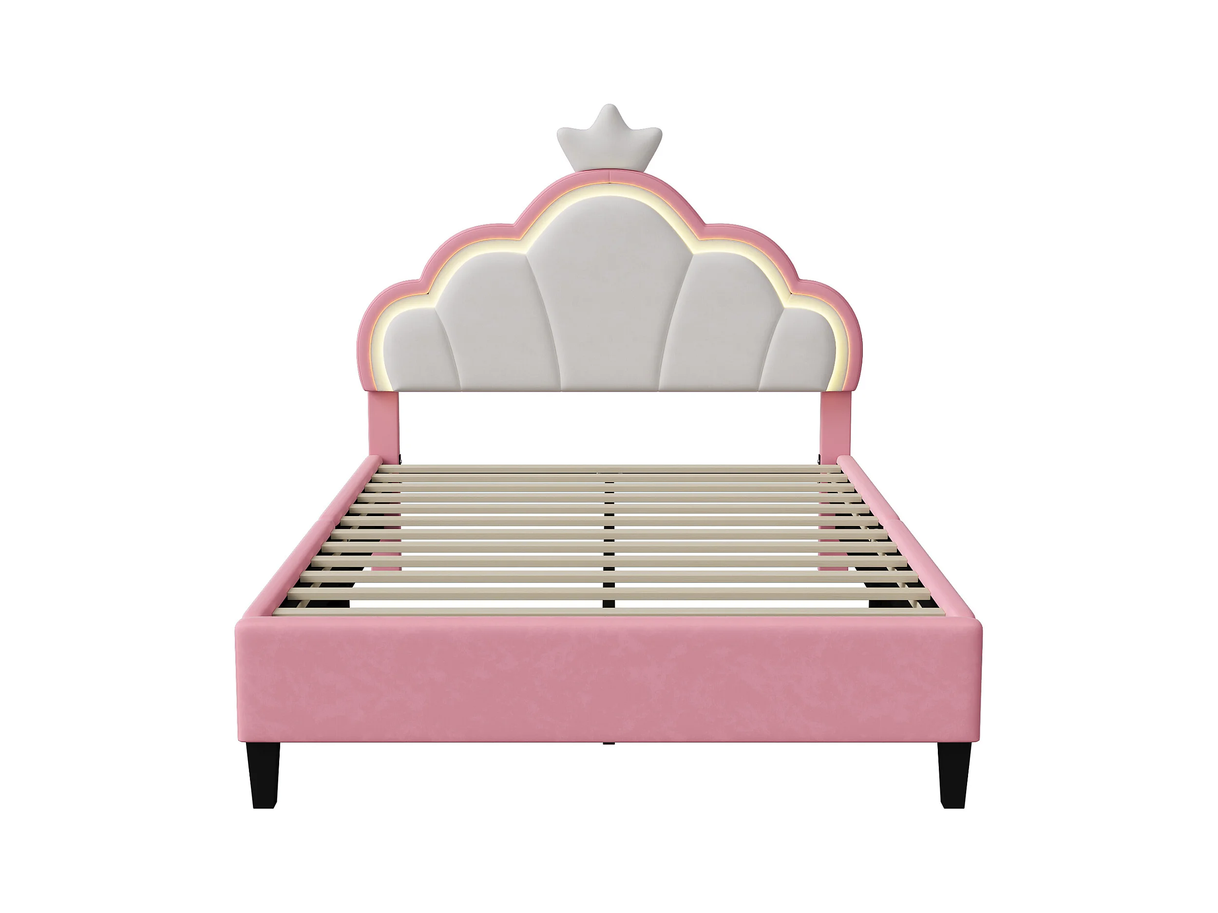 Lit rembourré 140 x 200 cm, lit simple avec sommier à lattes, tête de lit couronne, flanelle, rose