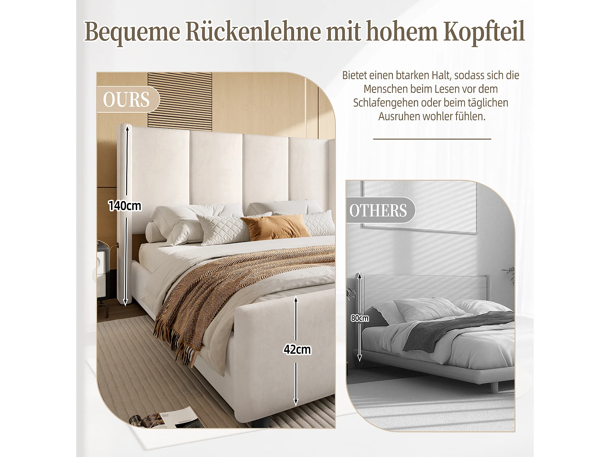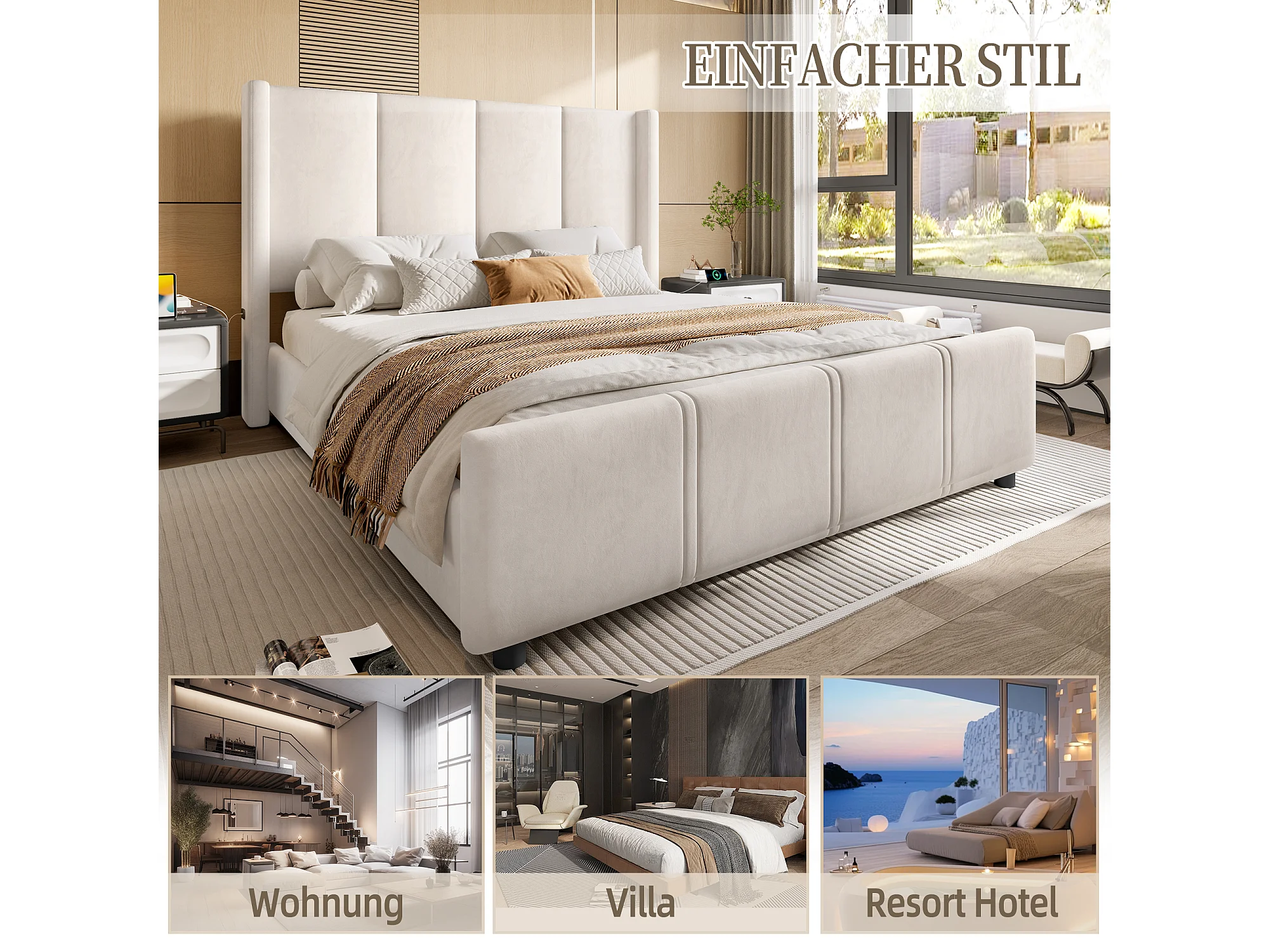 Lit Rembourré 140×190 cm Velours Beige – Grand Tête de Lit - avec LED – Ports USB/USB‑C – Style Contemporain