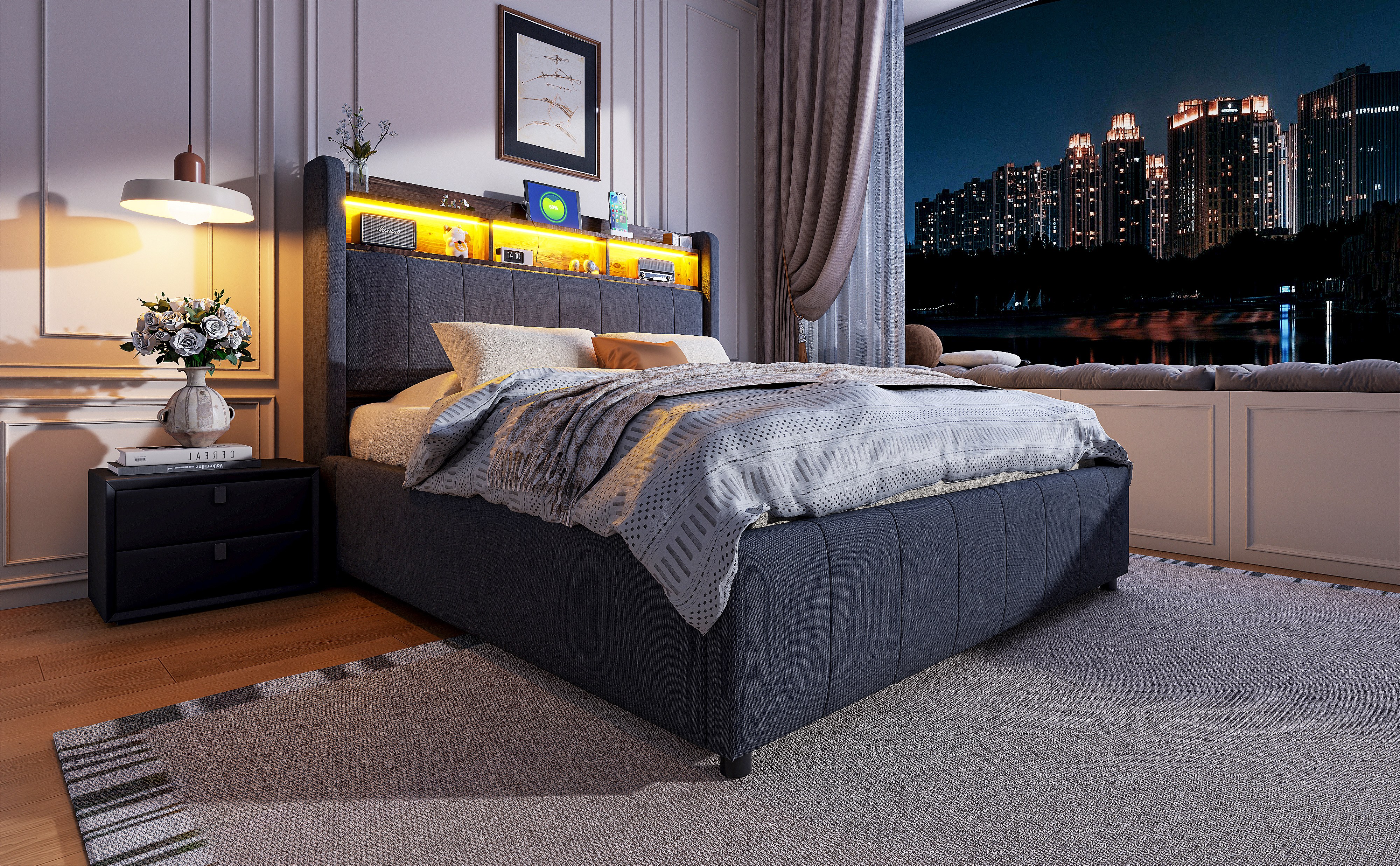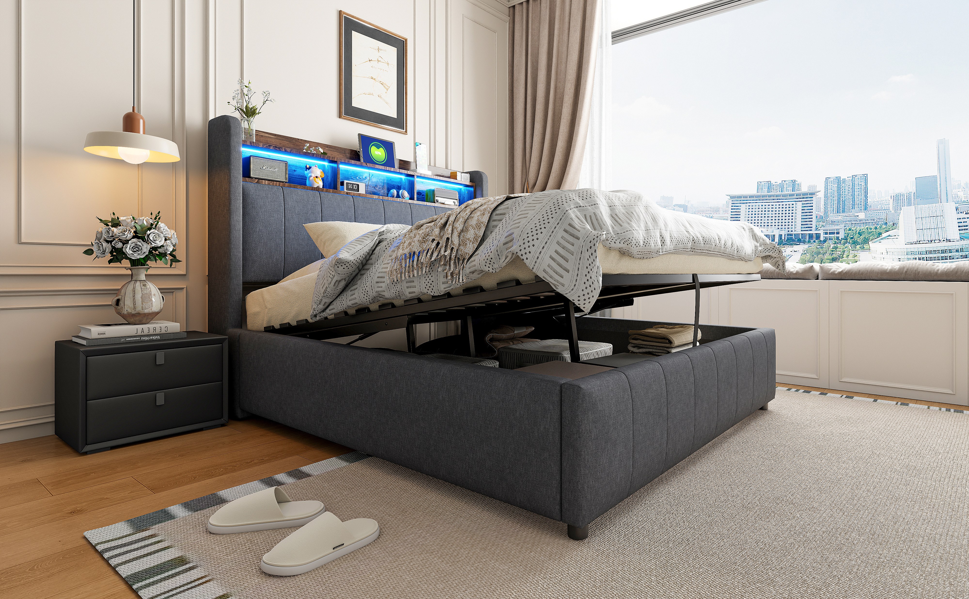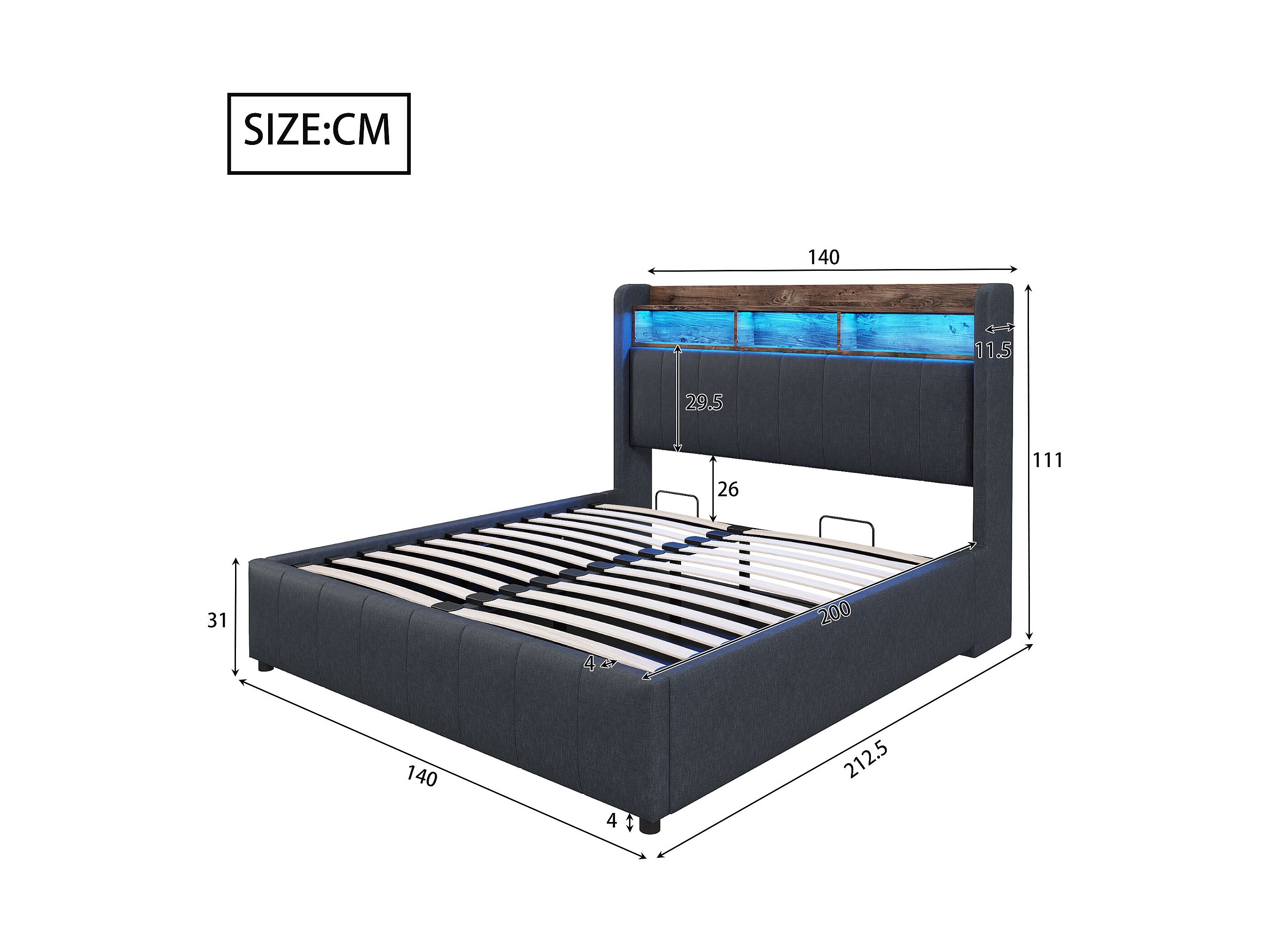 Lit rembourré 140×200 cm avec éclairage LED et prise USB, tête de lit avec étagères et rangement, hydraulique