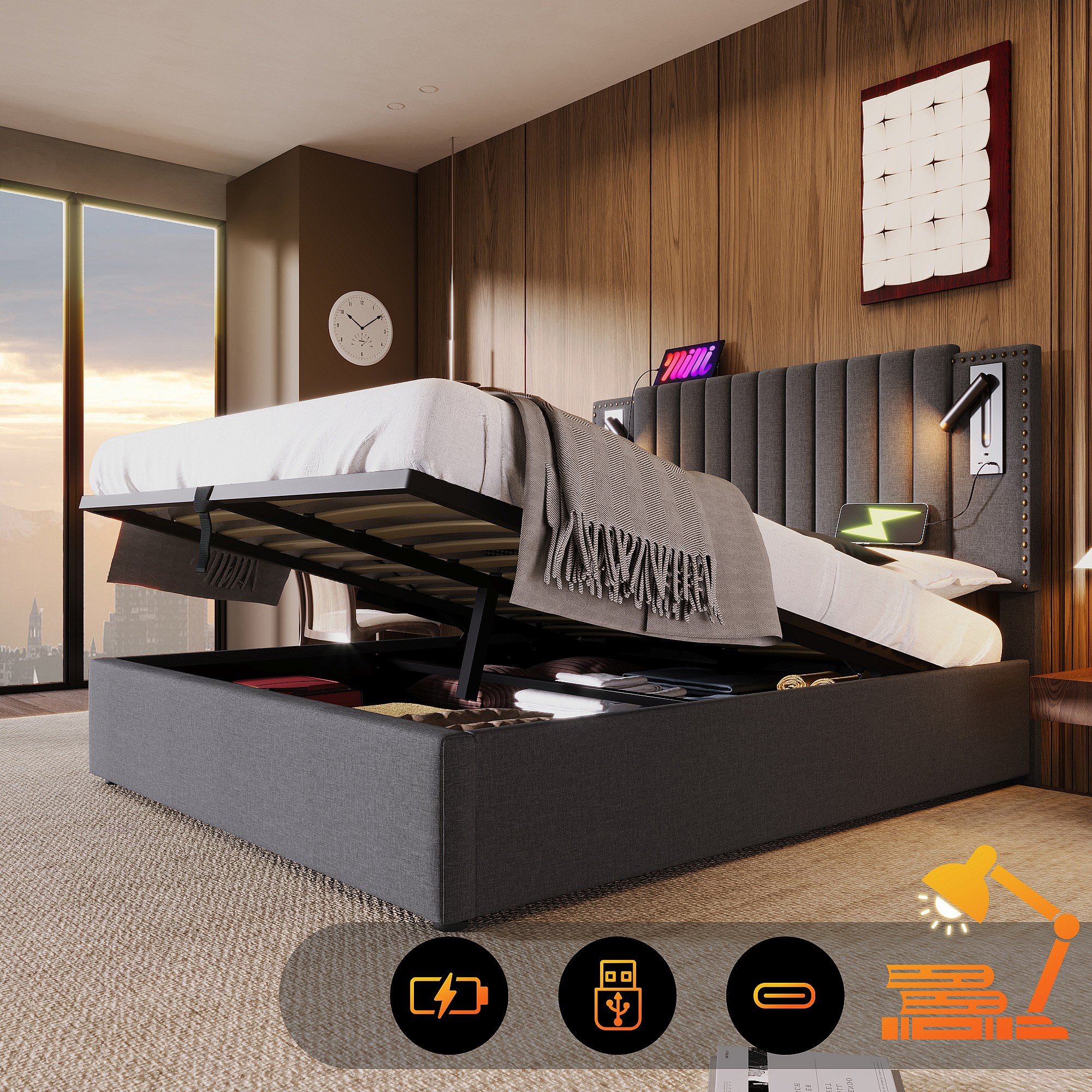 Lit rembourré 140x200 cm, avec espace de rangement, éclairage de lecture USB et tête de lit réglable en gris