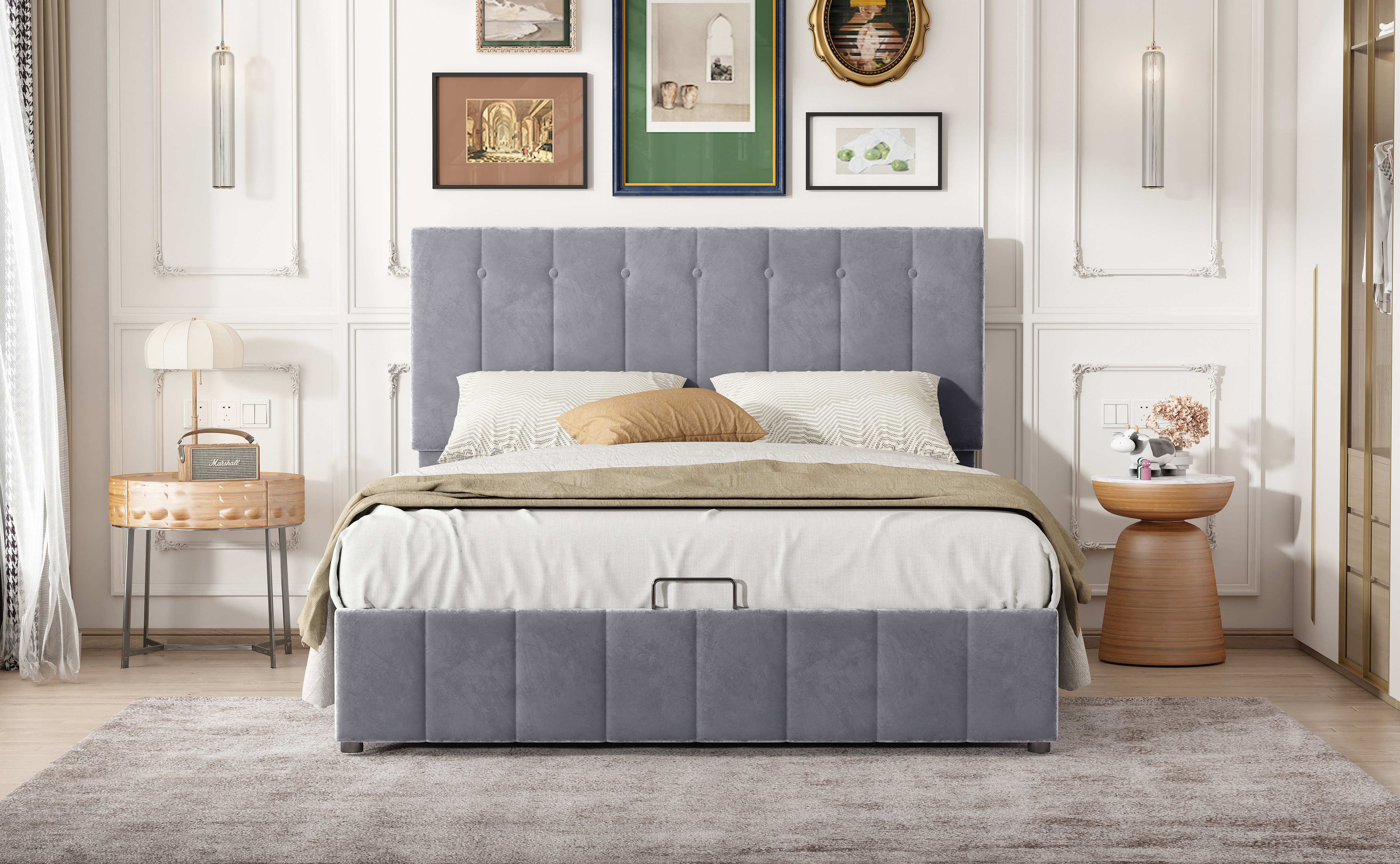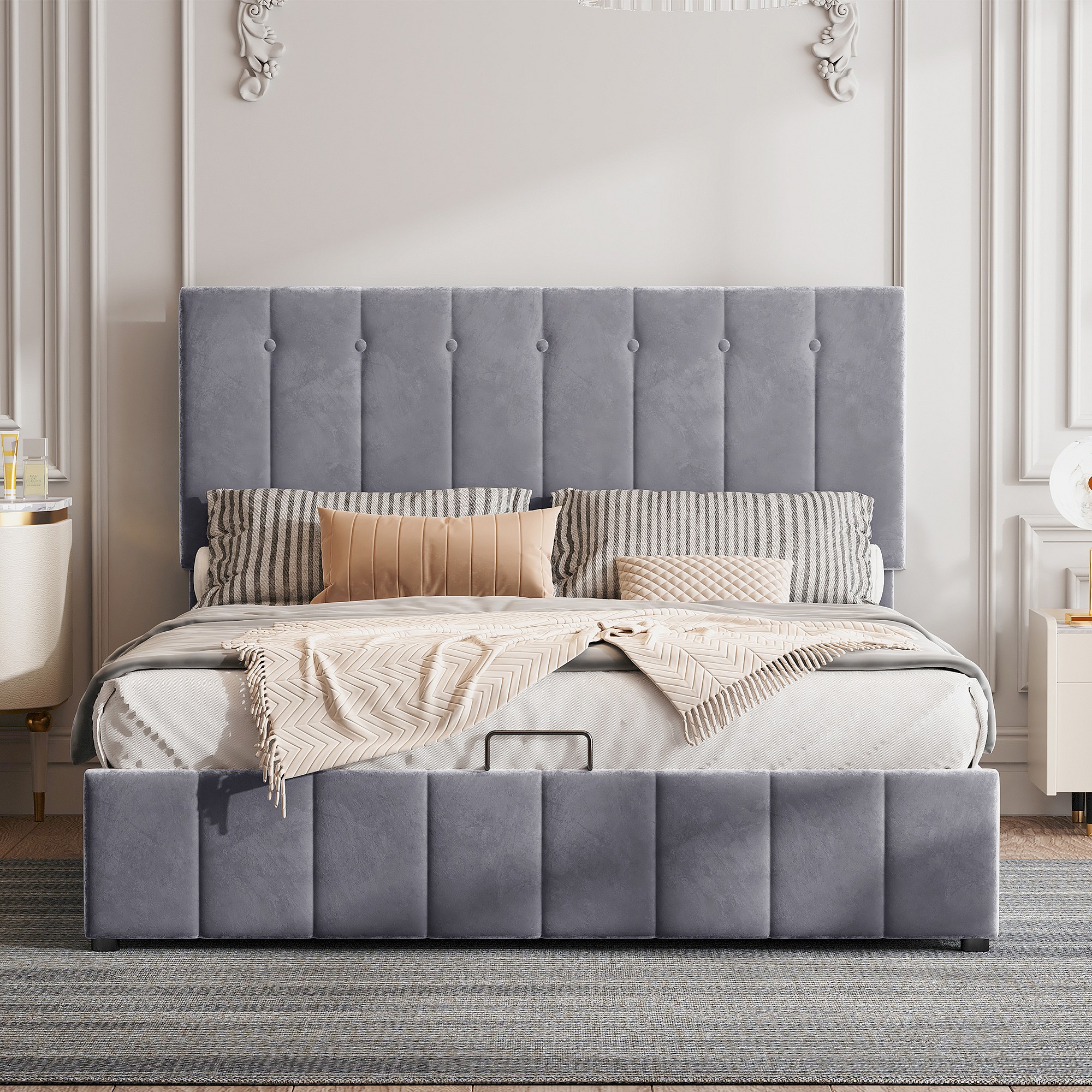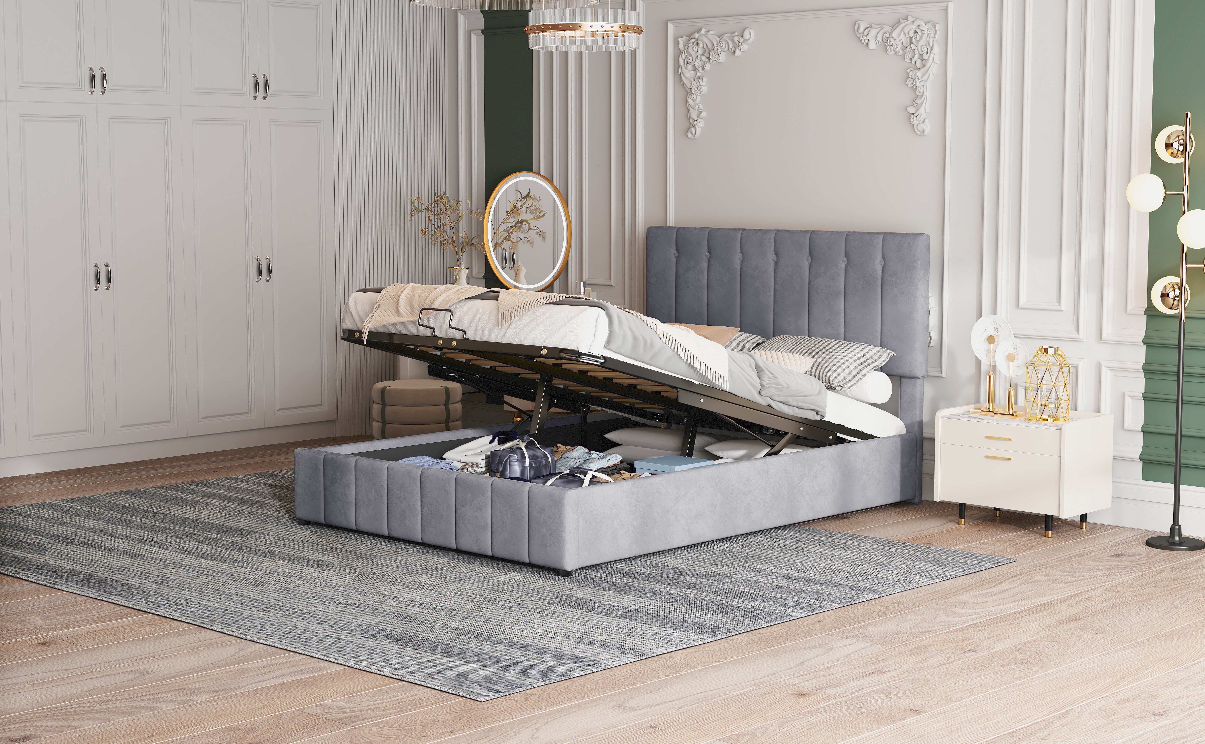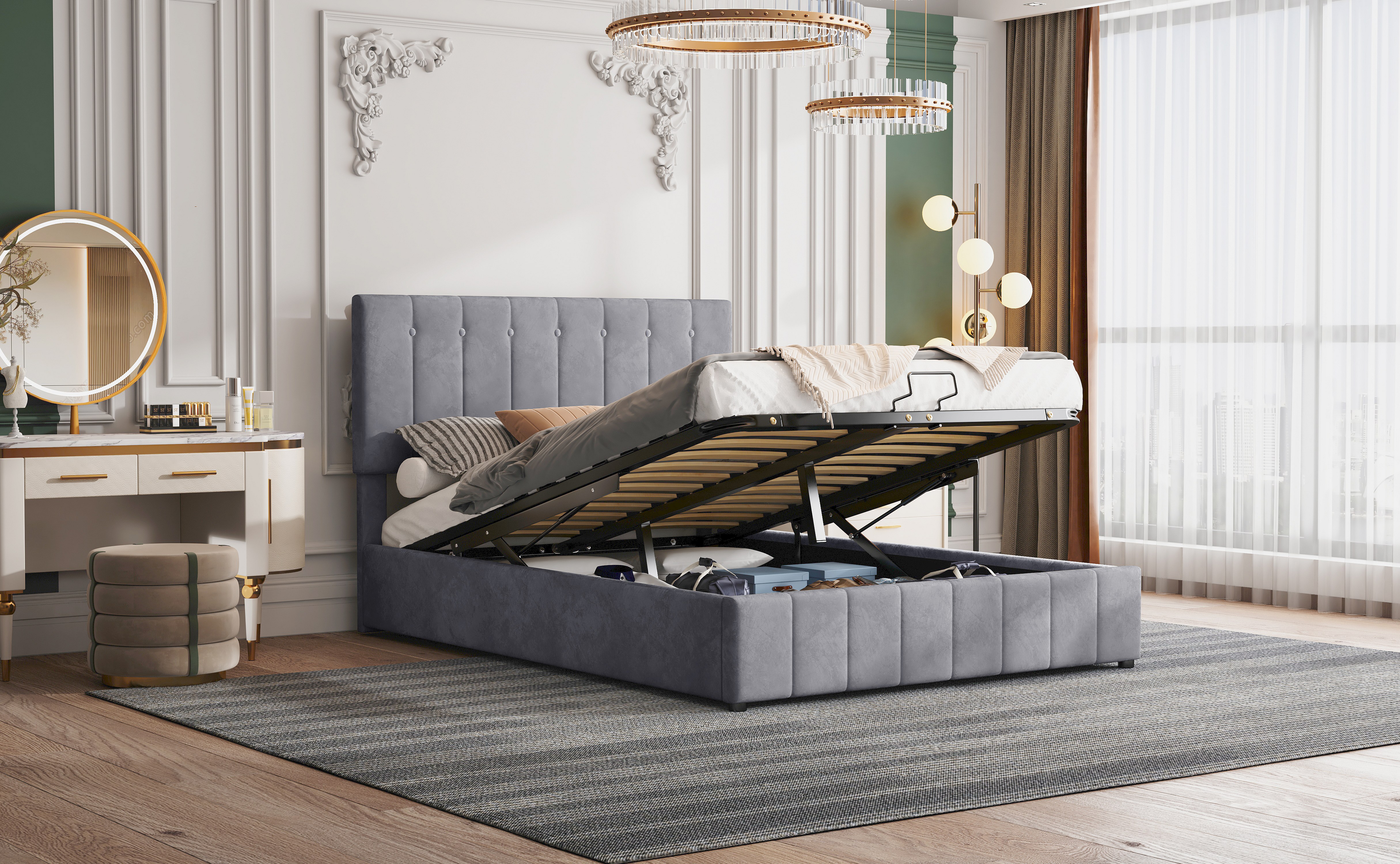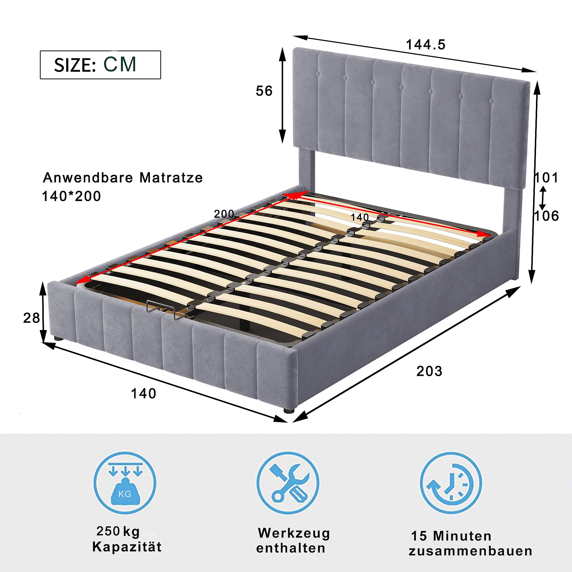 Lit rembourré 140x200 cm avec rangement hydraulique, tête réglable, sommier métal, velours gris, adulte et junior