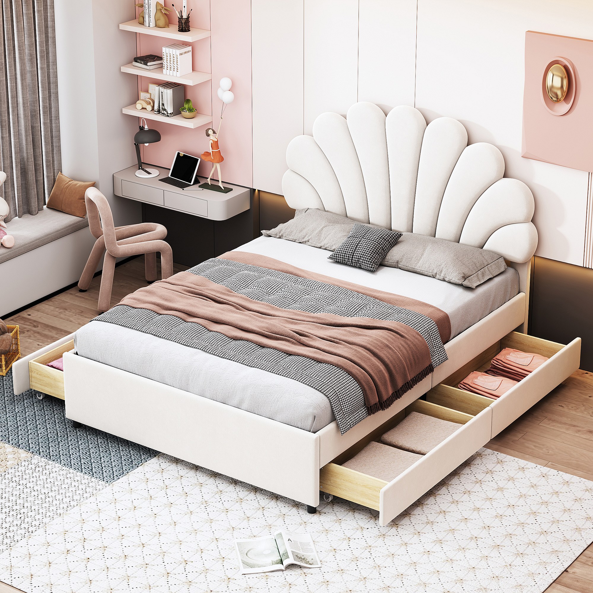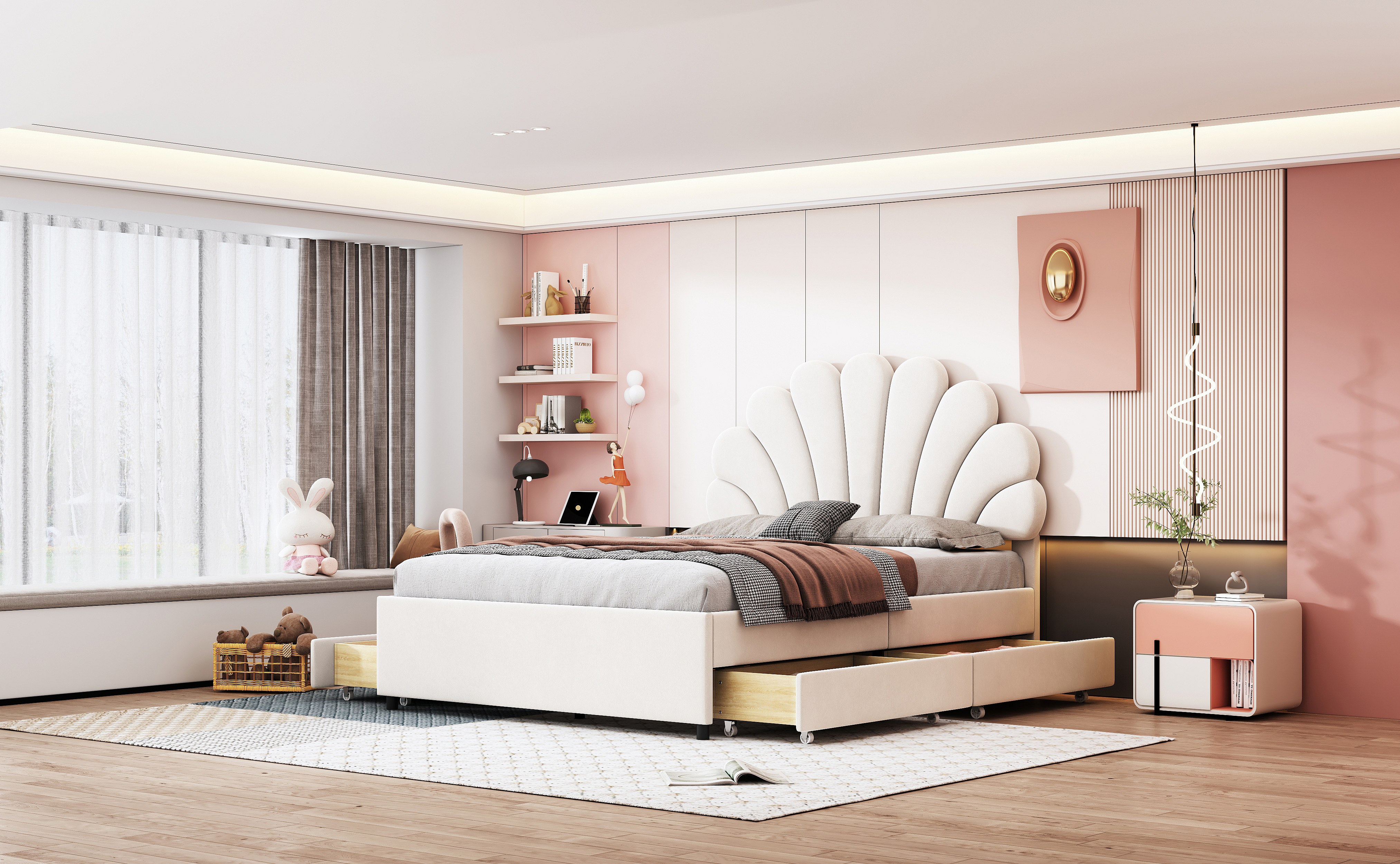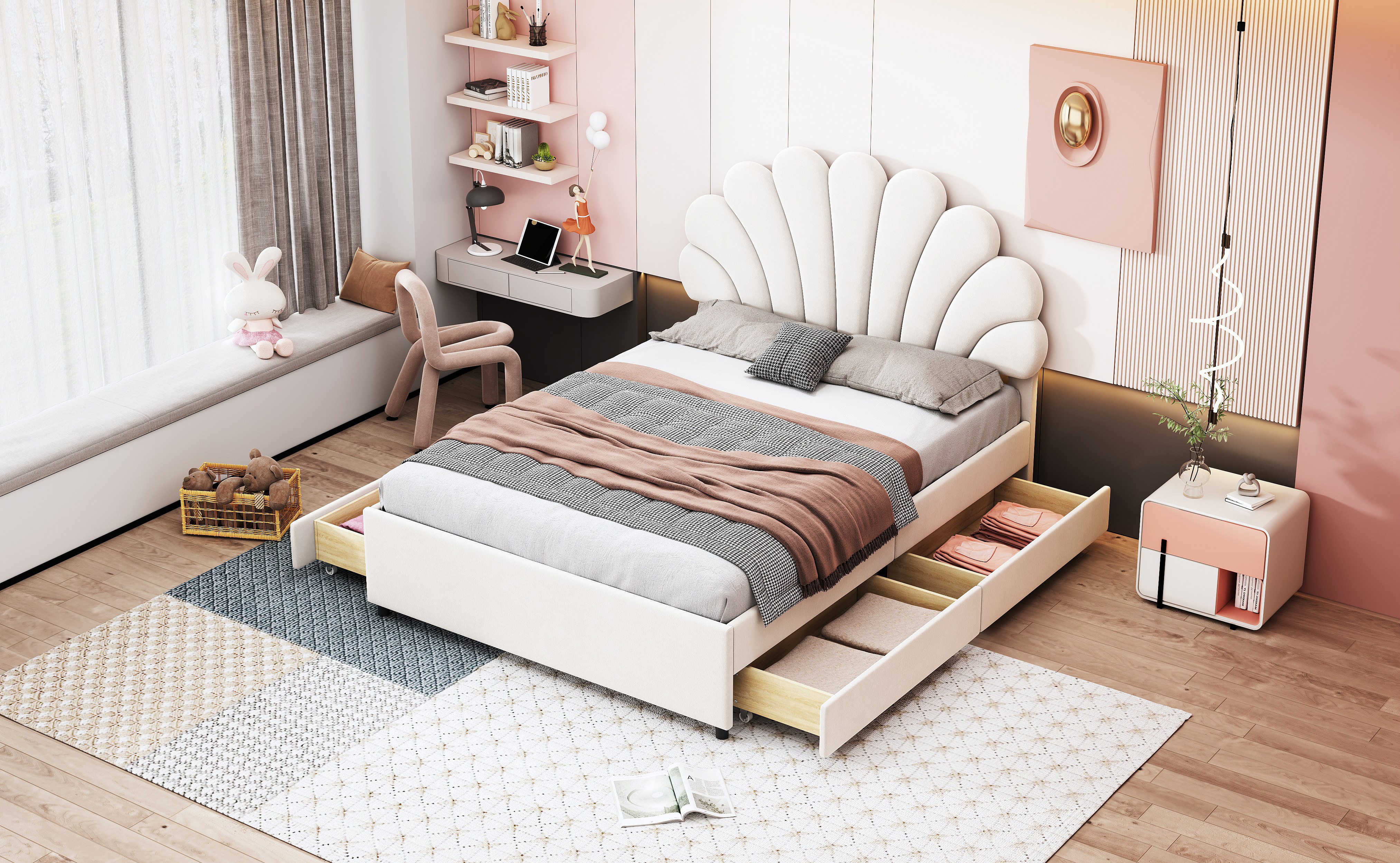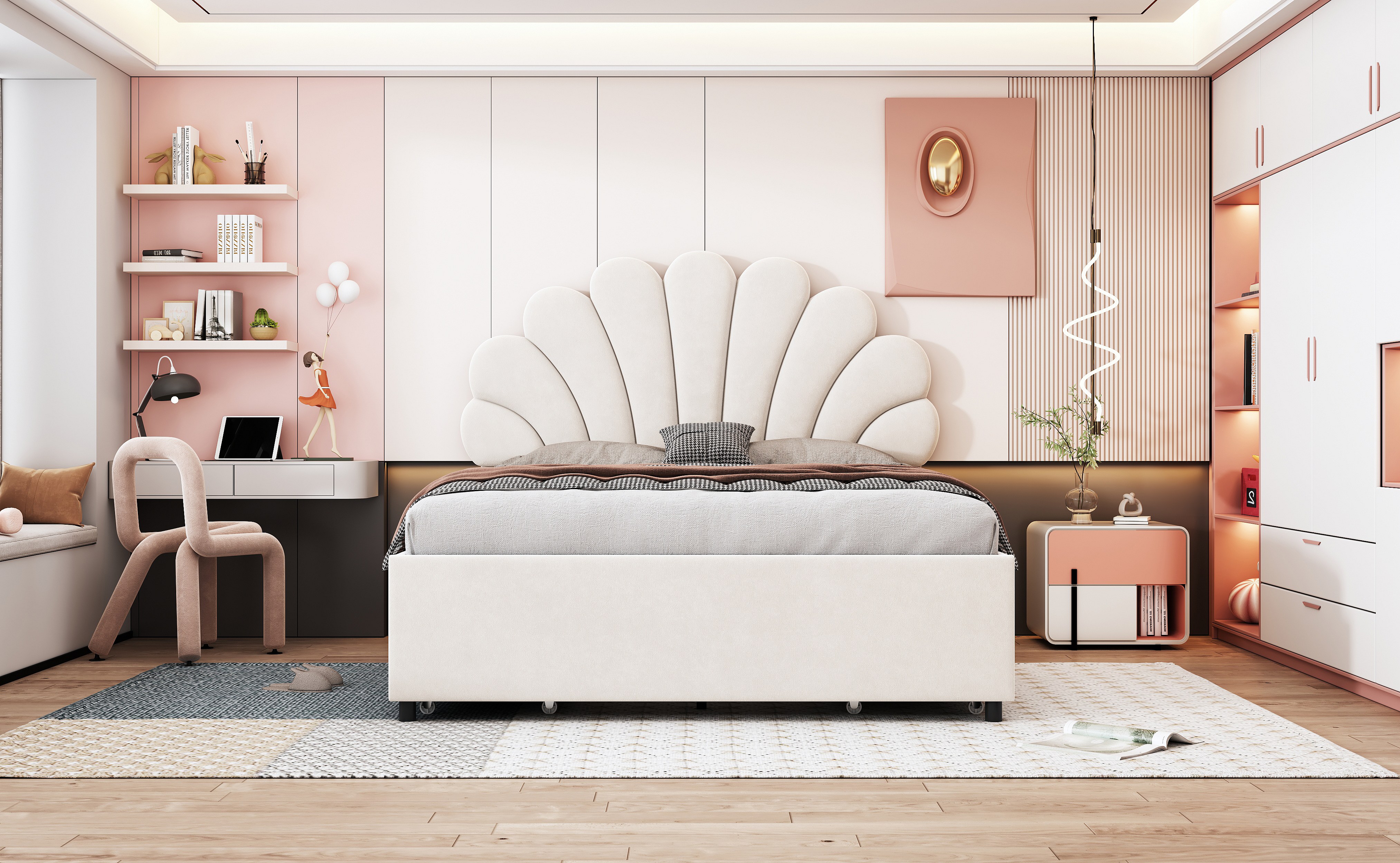 Lit rembourré 140x200 cm, cadre avec tête fleurie, sommier et rangements, velours beige, lit adulte et junior