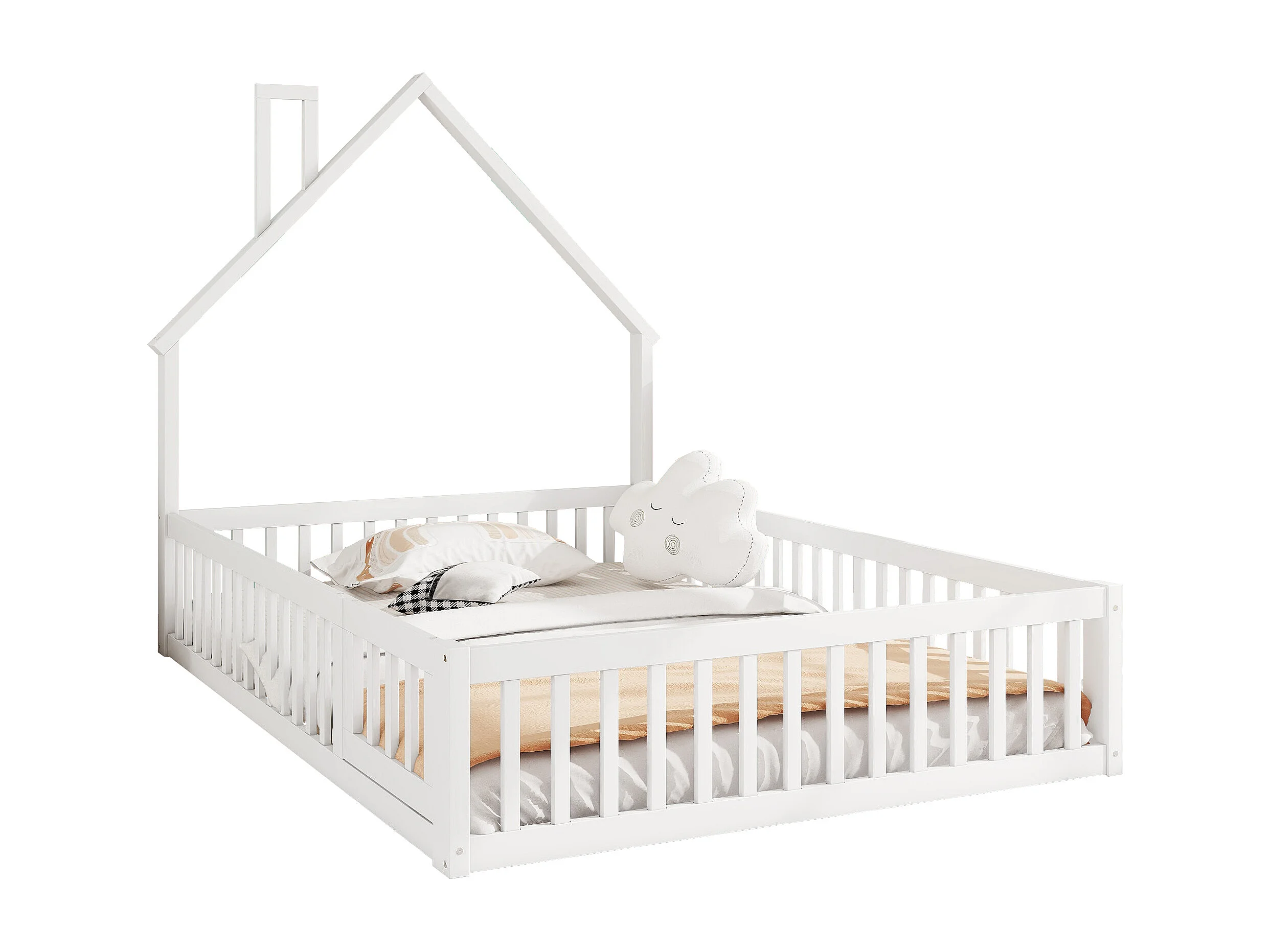 Lit rembourré 140x200 cm en pin blanc avec sommier, style cabane cheminée, pour chambre enfant moderne