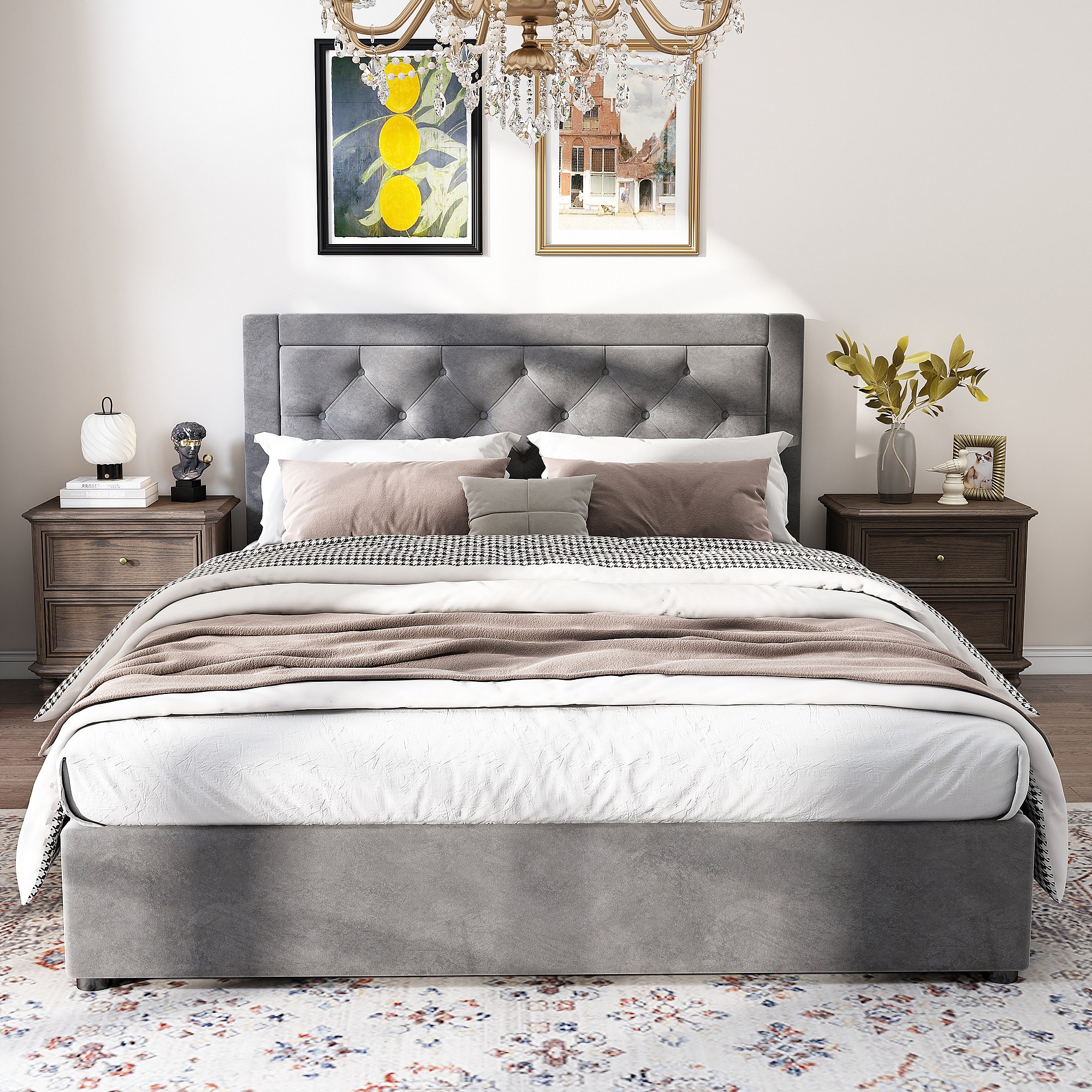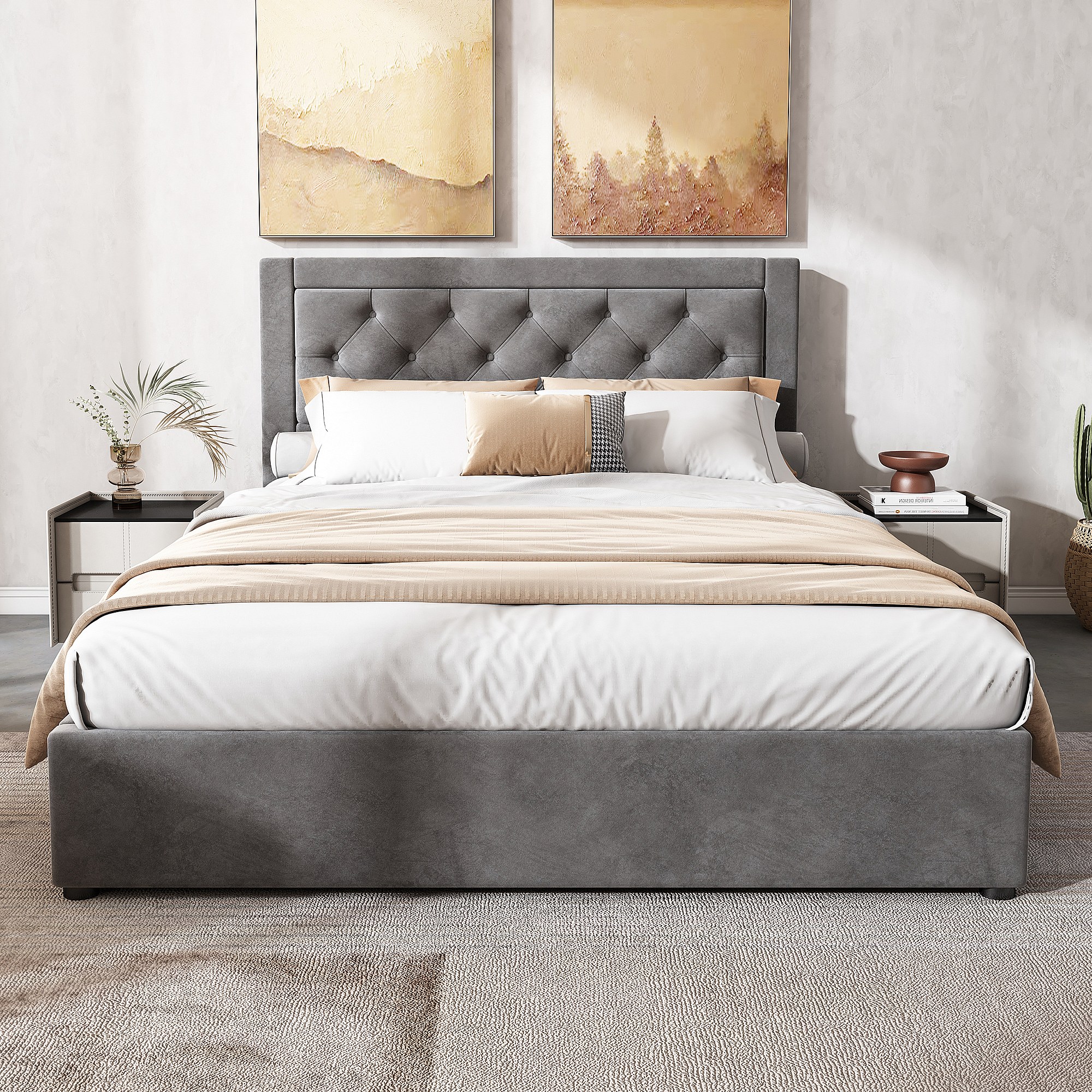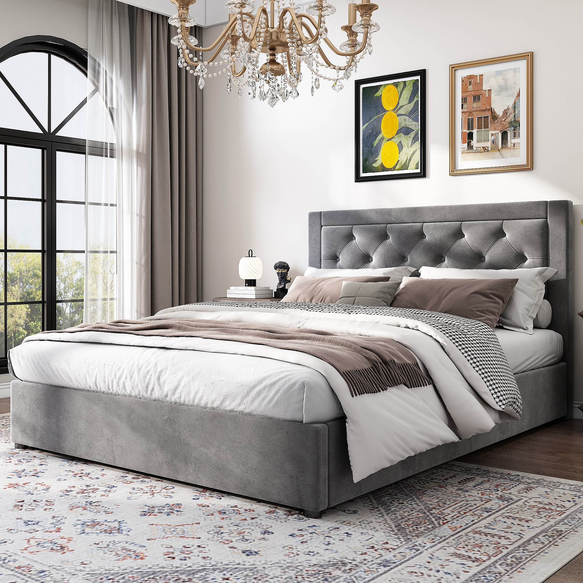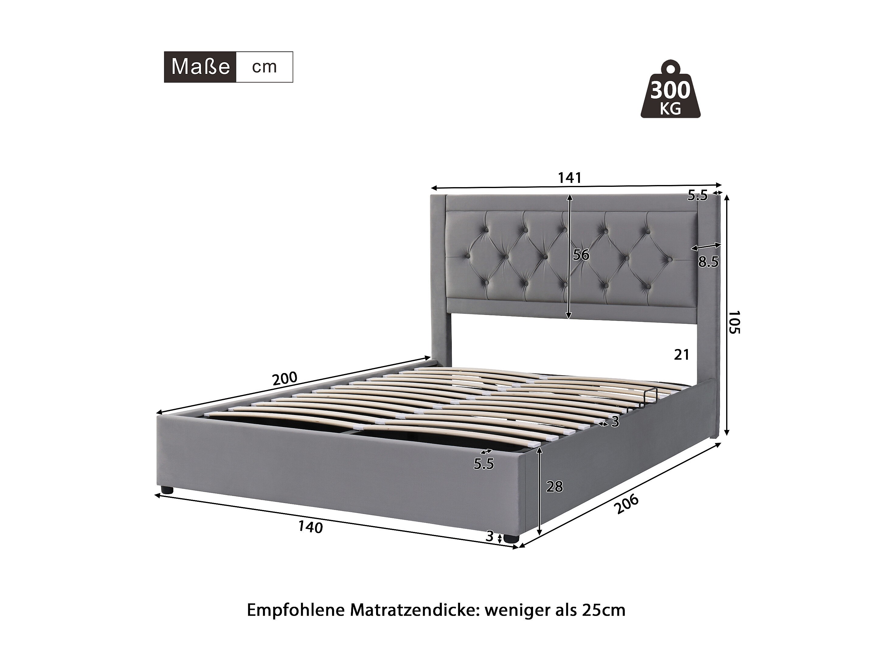 Lit rembourré 140×200 cm en velours gris avec rangement, tête de lit en mousse, style Chesterfield