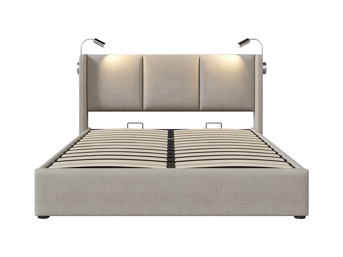 Lit rembourré 140x200 cm, lit avec rangement, lit double avec sommier à lattes et lampe de lecture, lin, beige, sans matelas
