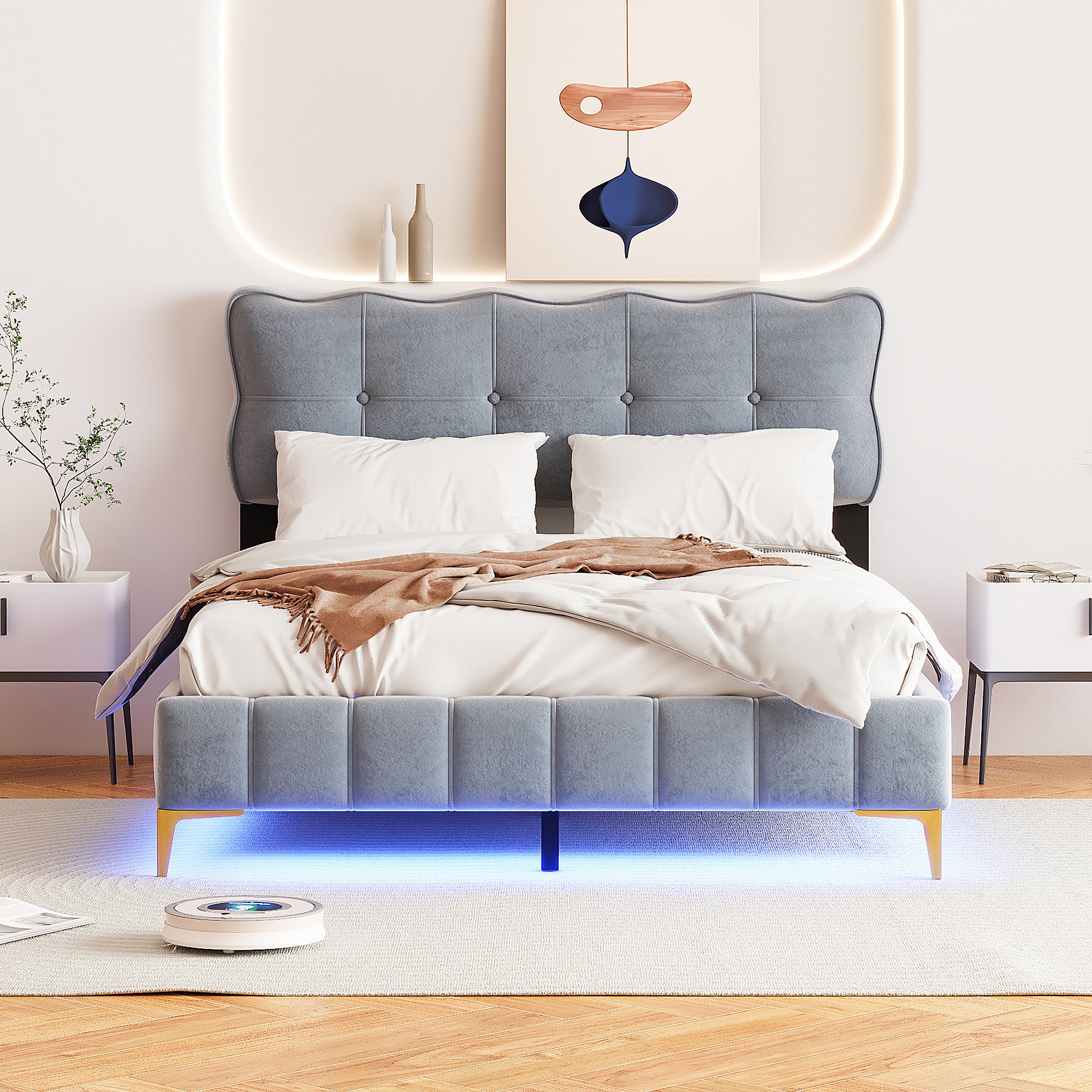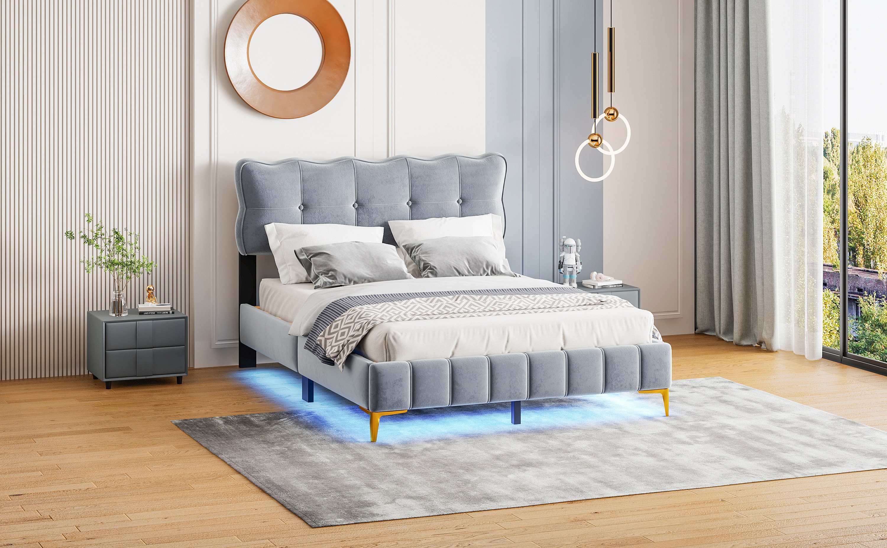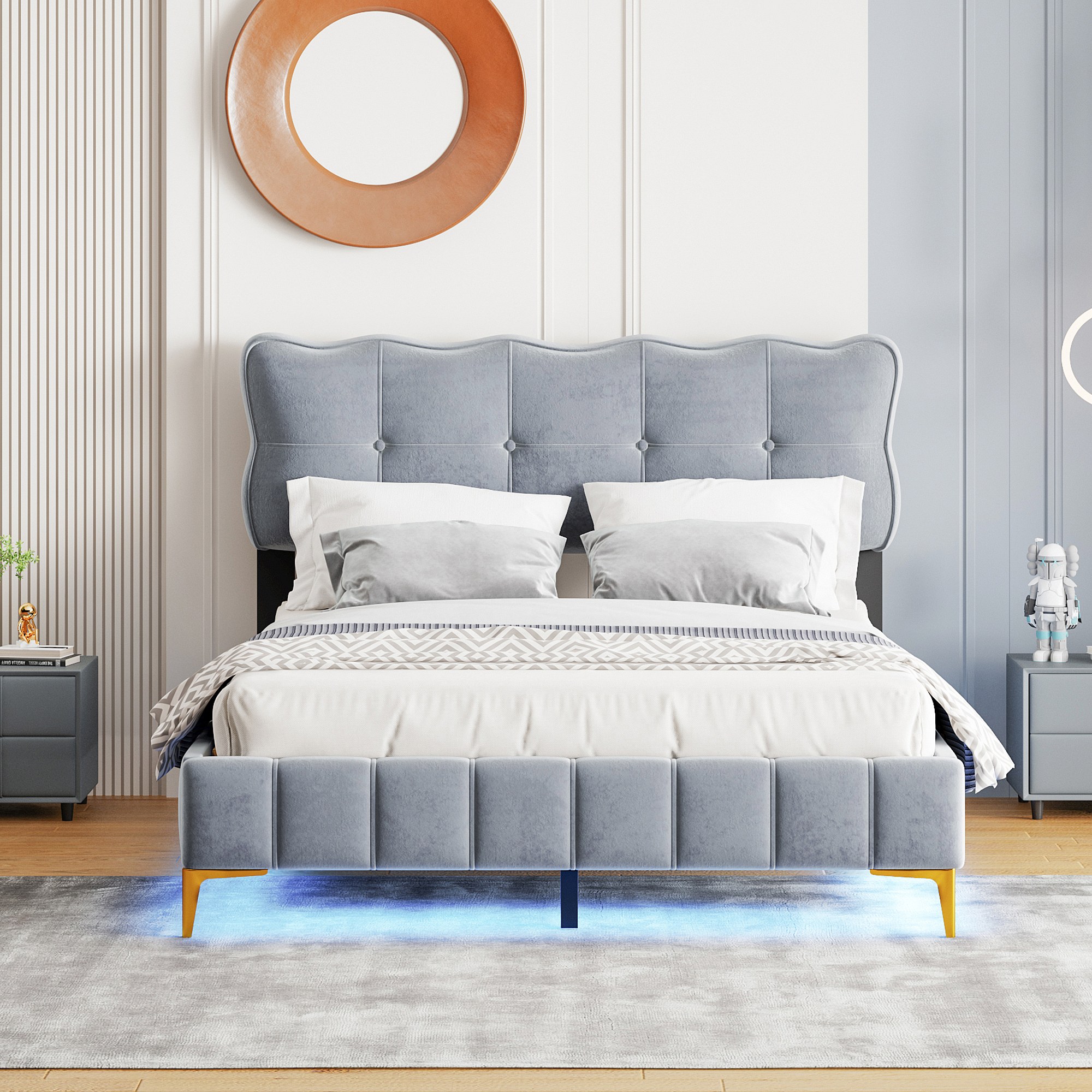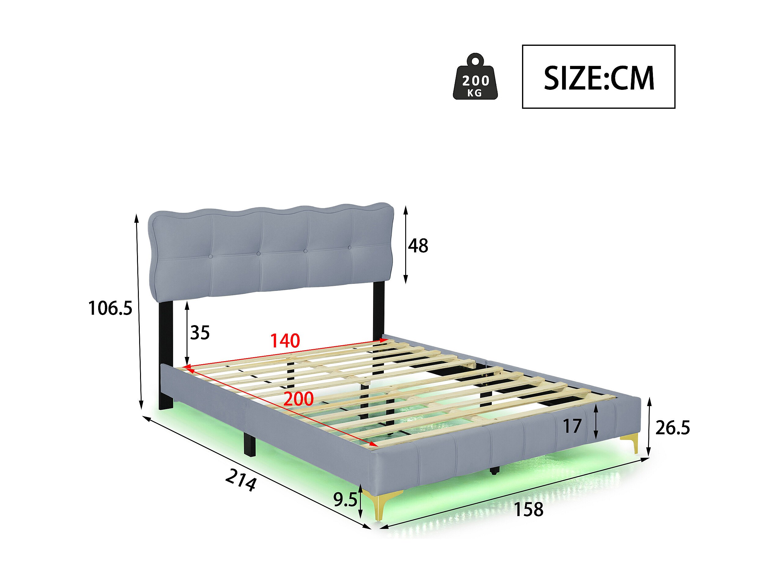 Lit rembourré 140x200 cm pour jeunes, LED, tête rembourrée, sommier métal, velours gris