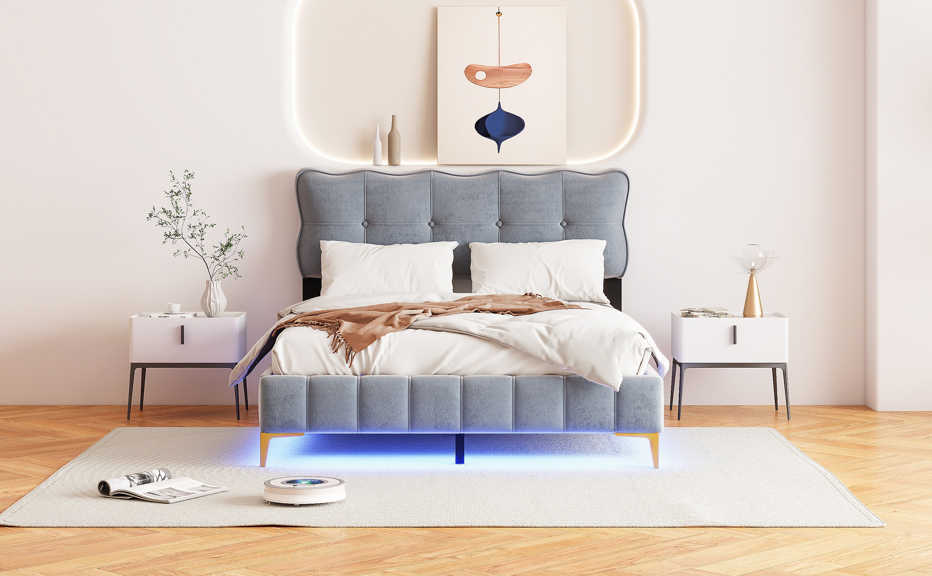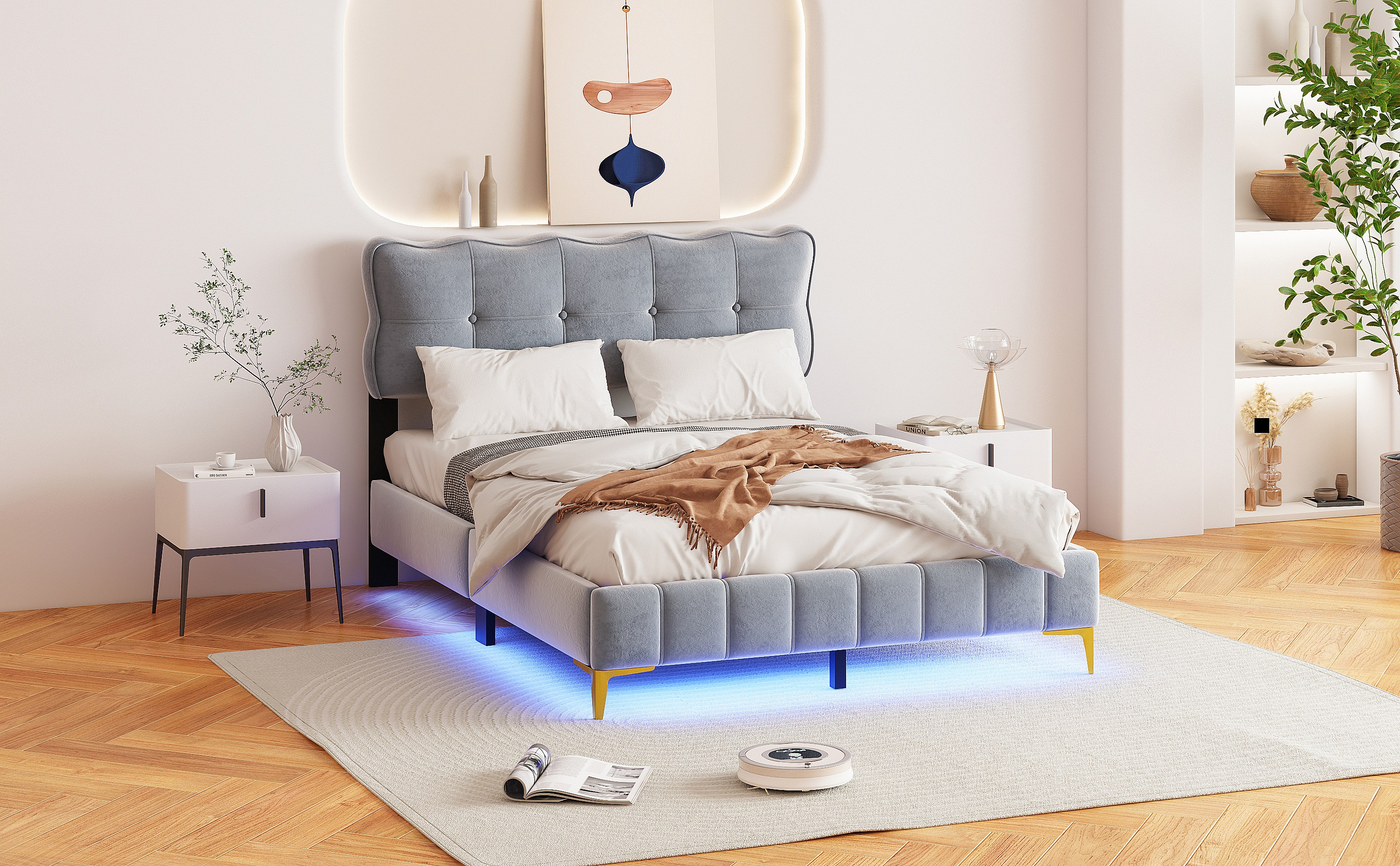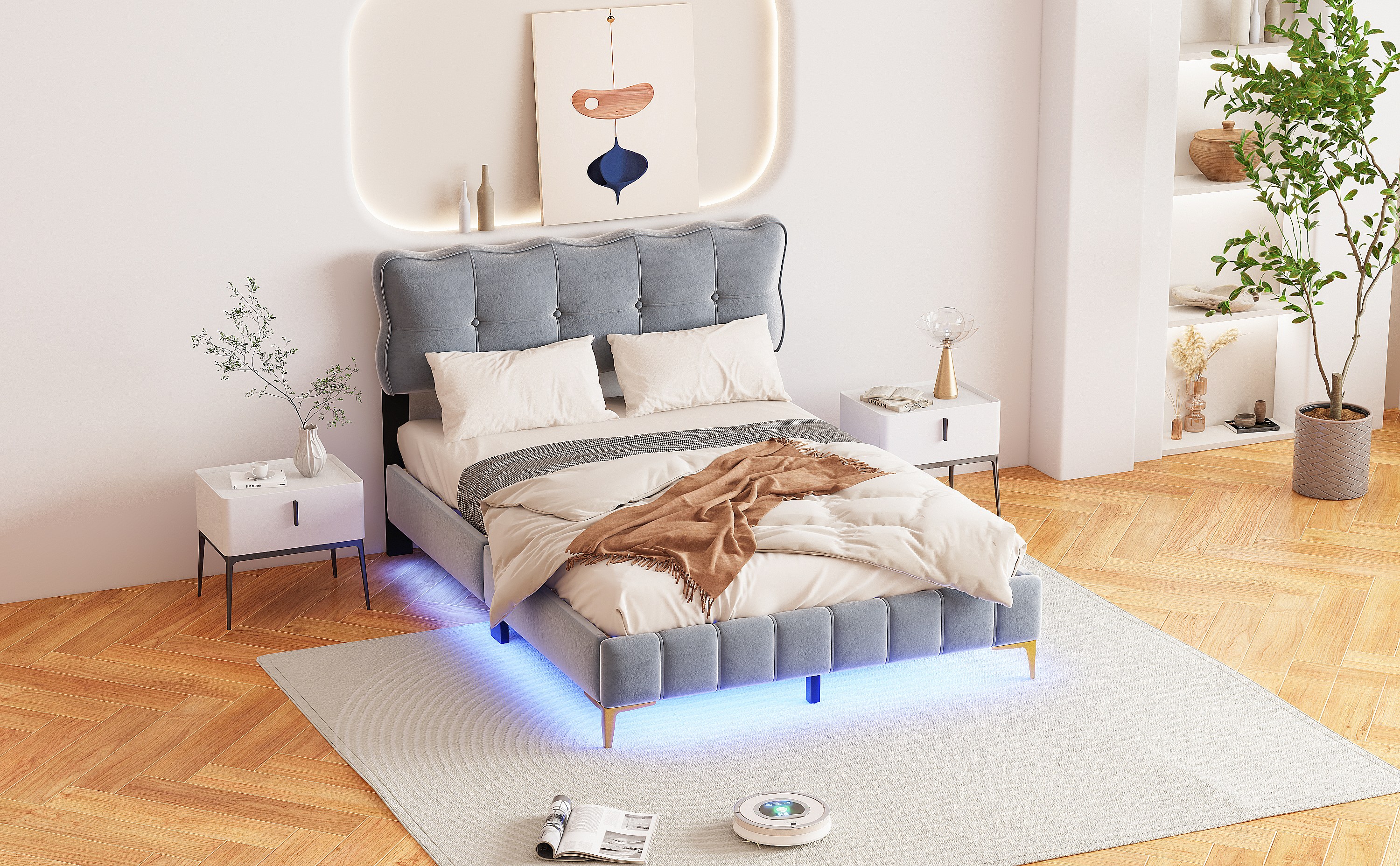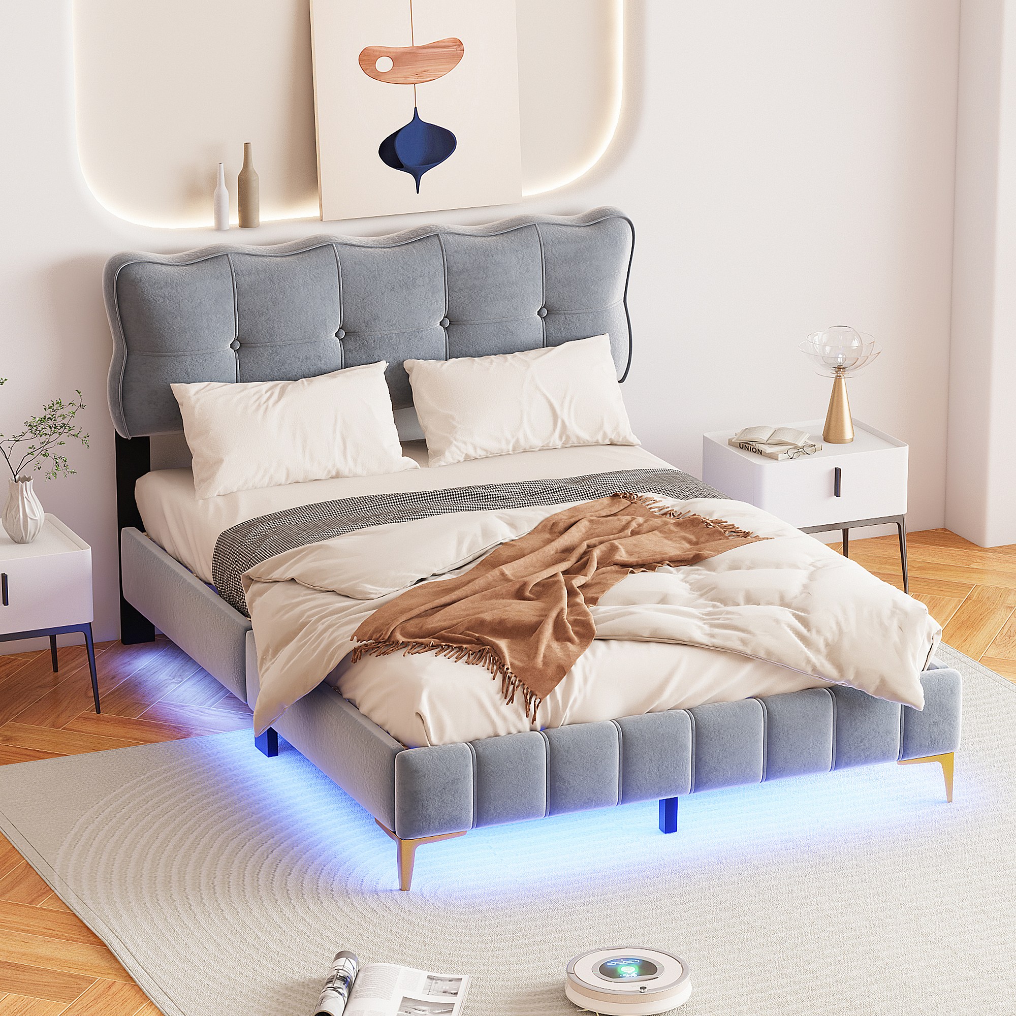 Lit rembourré 140x200 cm pour jeunes, LED, tête rembourrée, sommier métal, velours gris