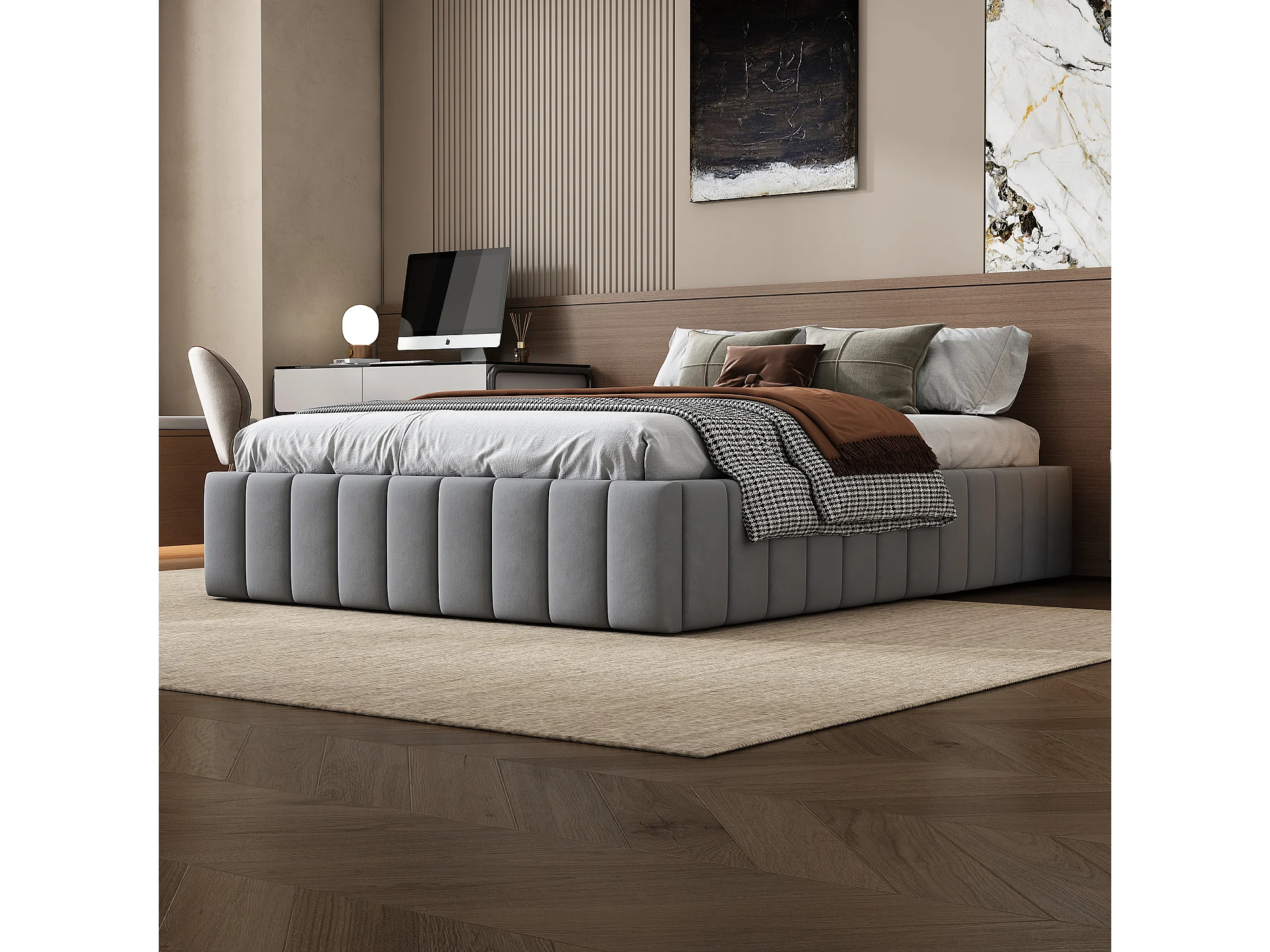 Lit rembourré 140x200 cm sans tête de lit, style minimaliste, cadre avec sommier, coloris gris