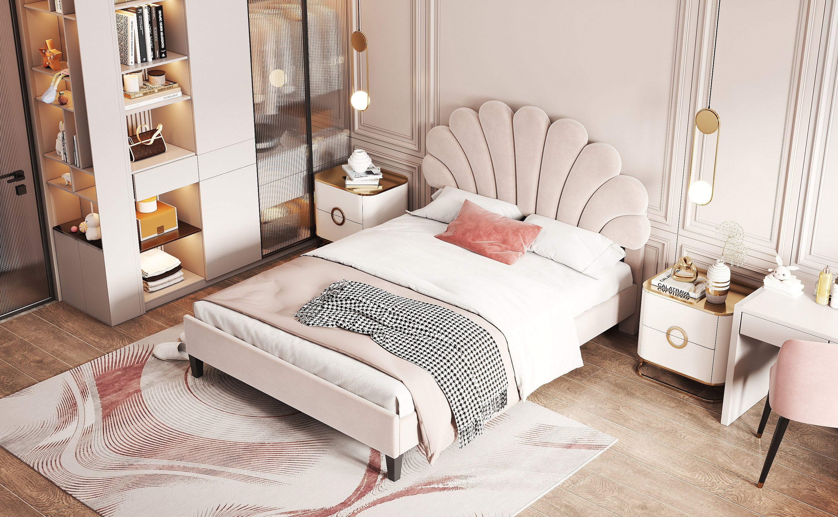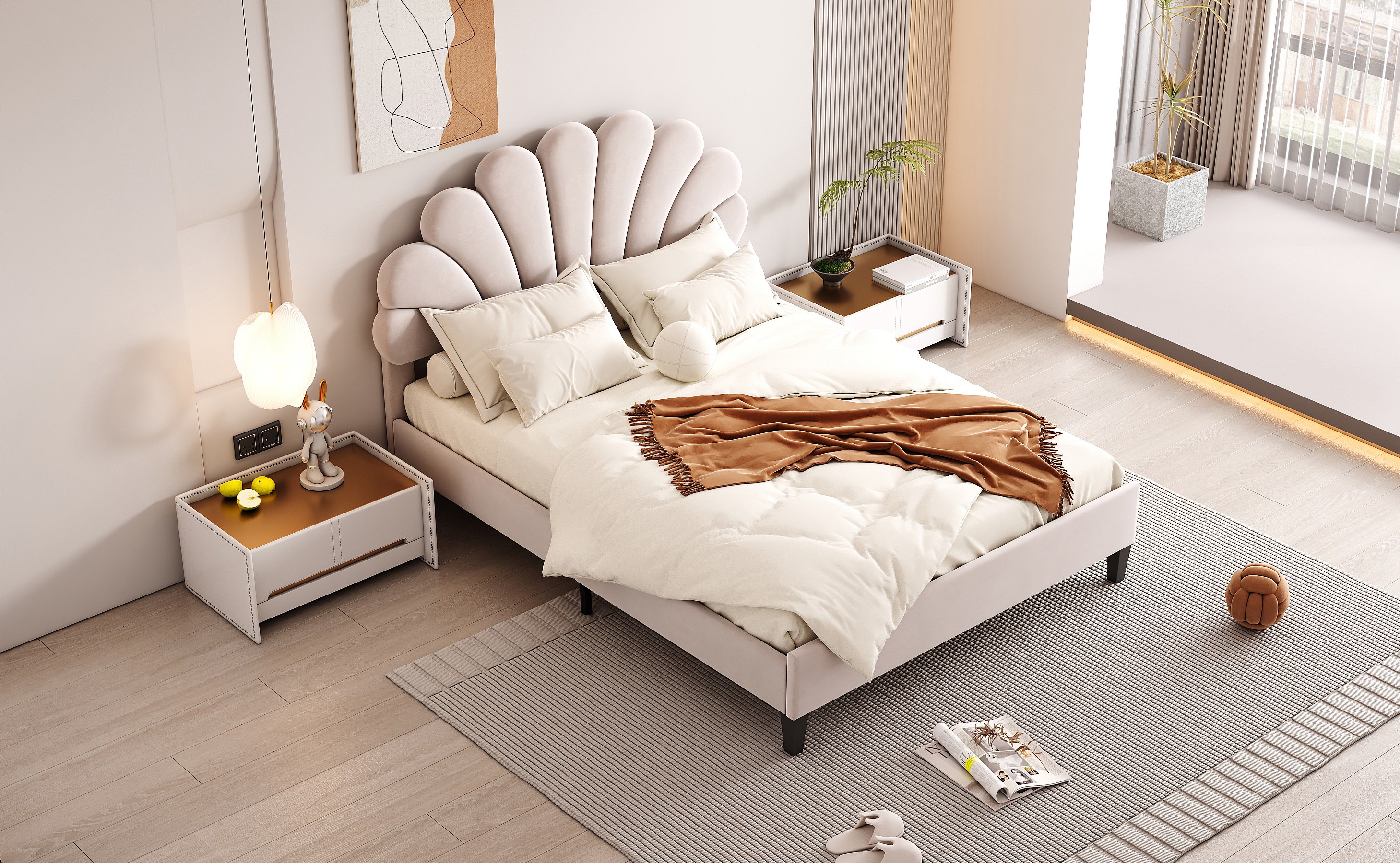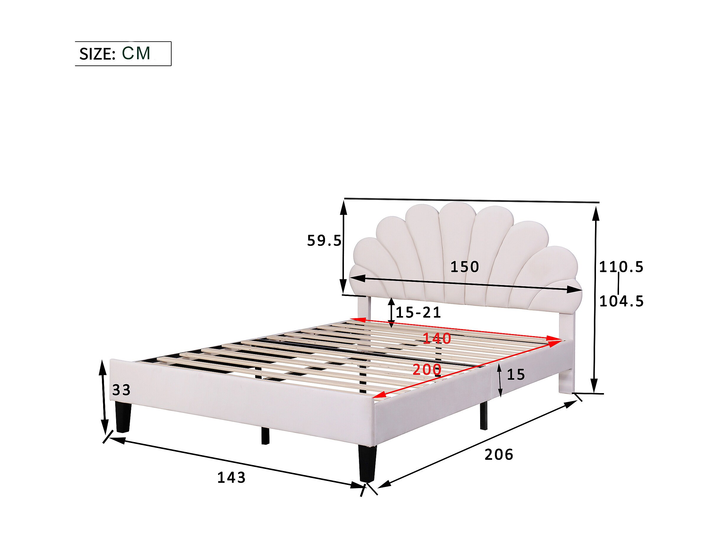 Lit rembourré 140x200 cm tête en forme de fleurs, sommier inclus, velours beige, adulte ou junior