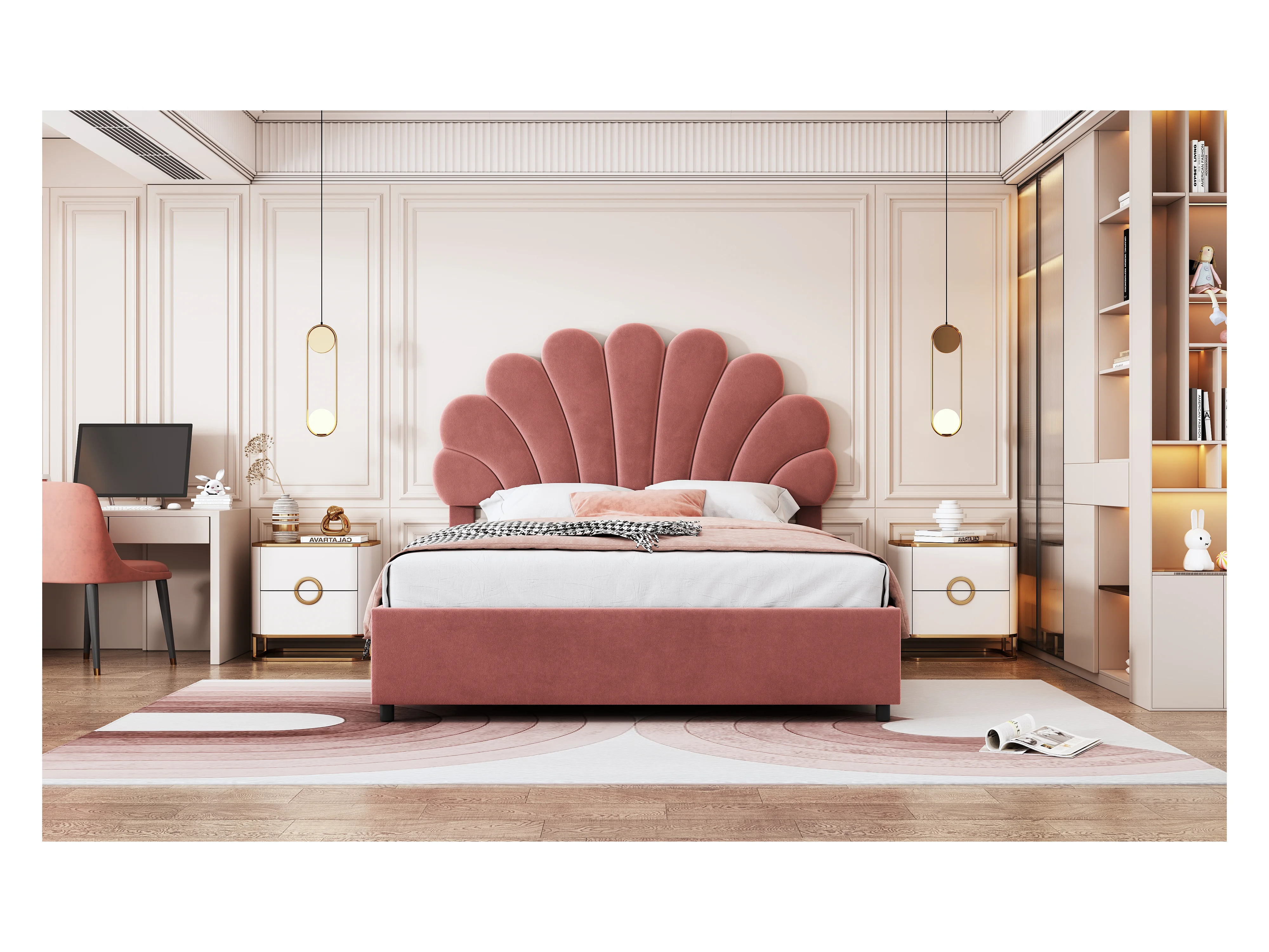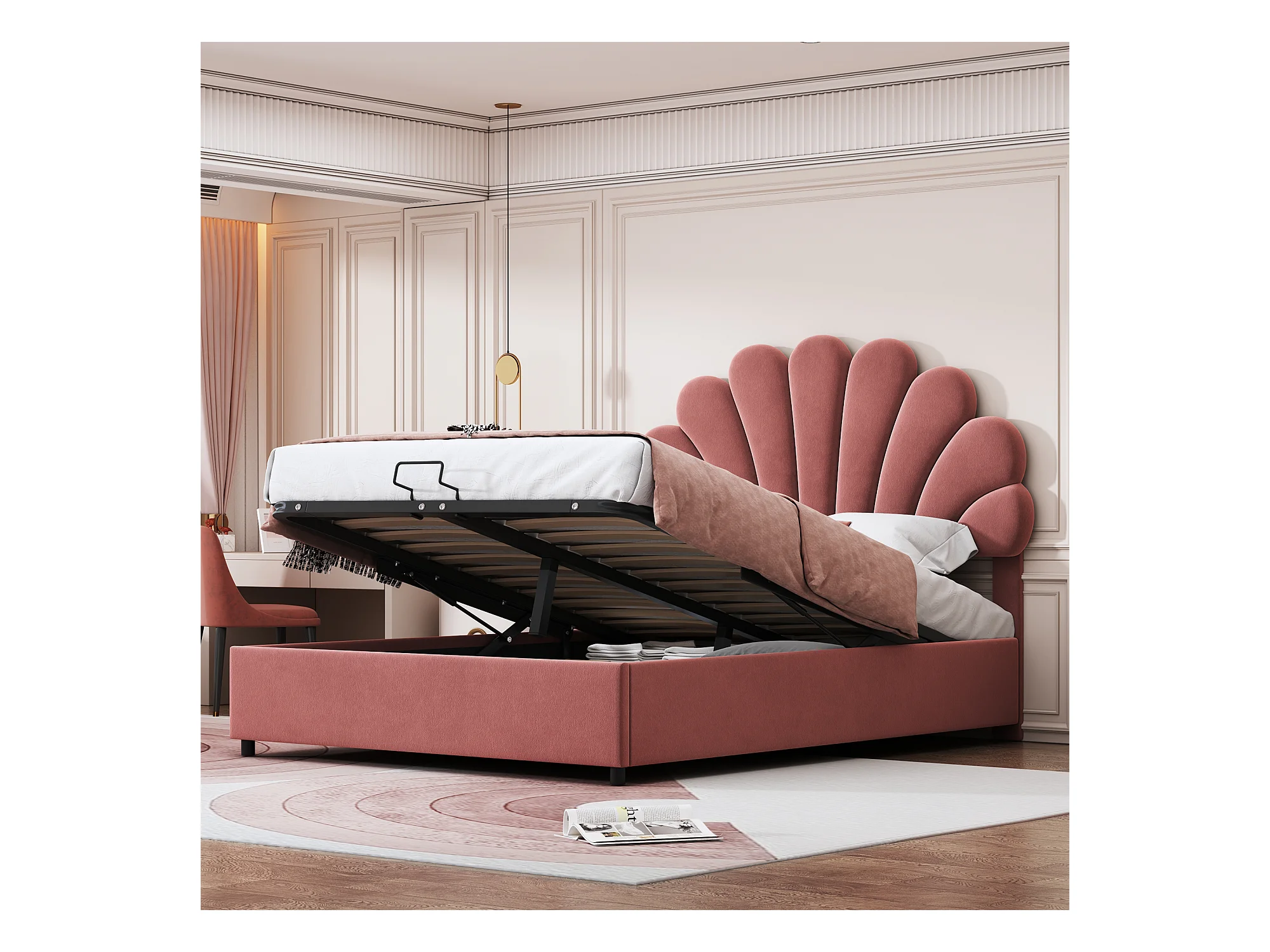Lit rembourré 140x200 cm, tête fleurie, sommier, rangement hydraulique, velours rose, lit junior