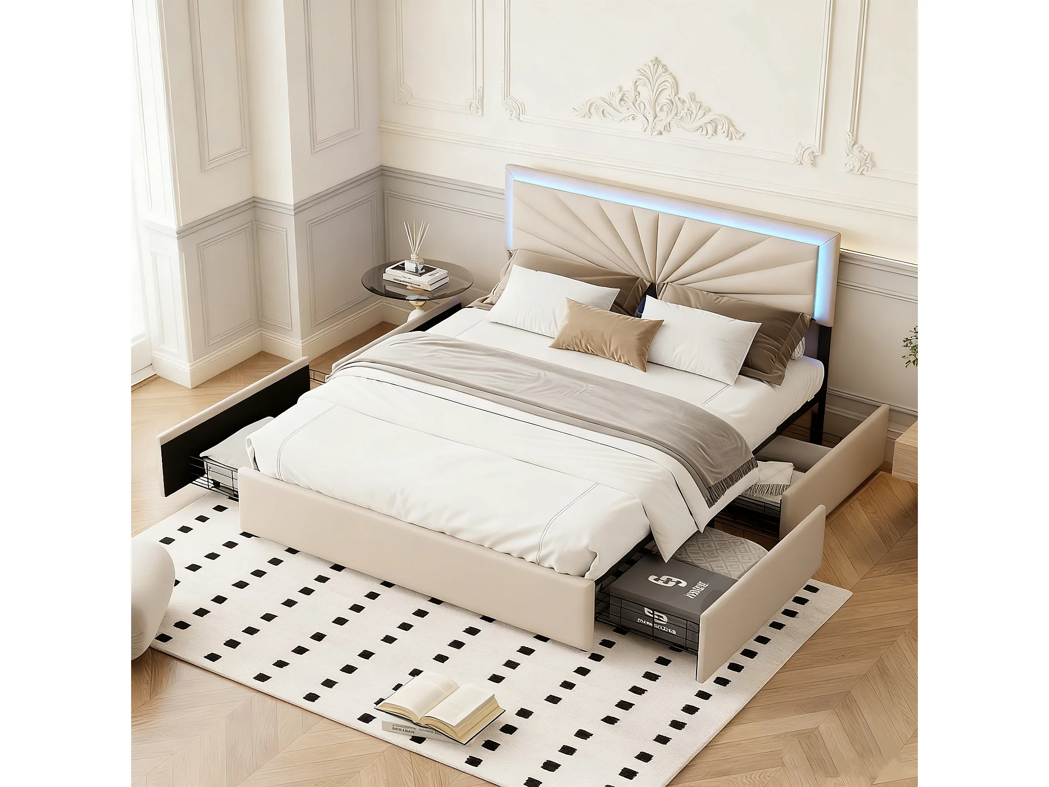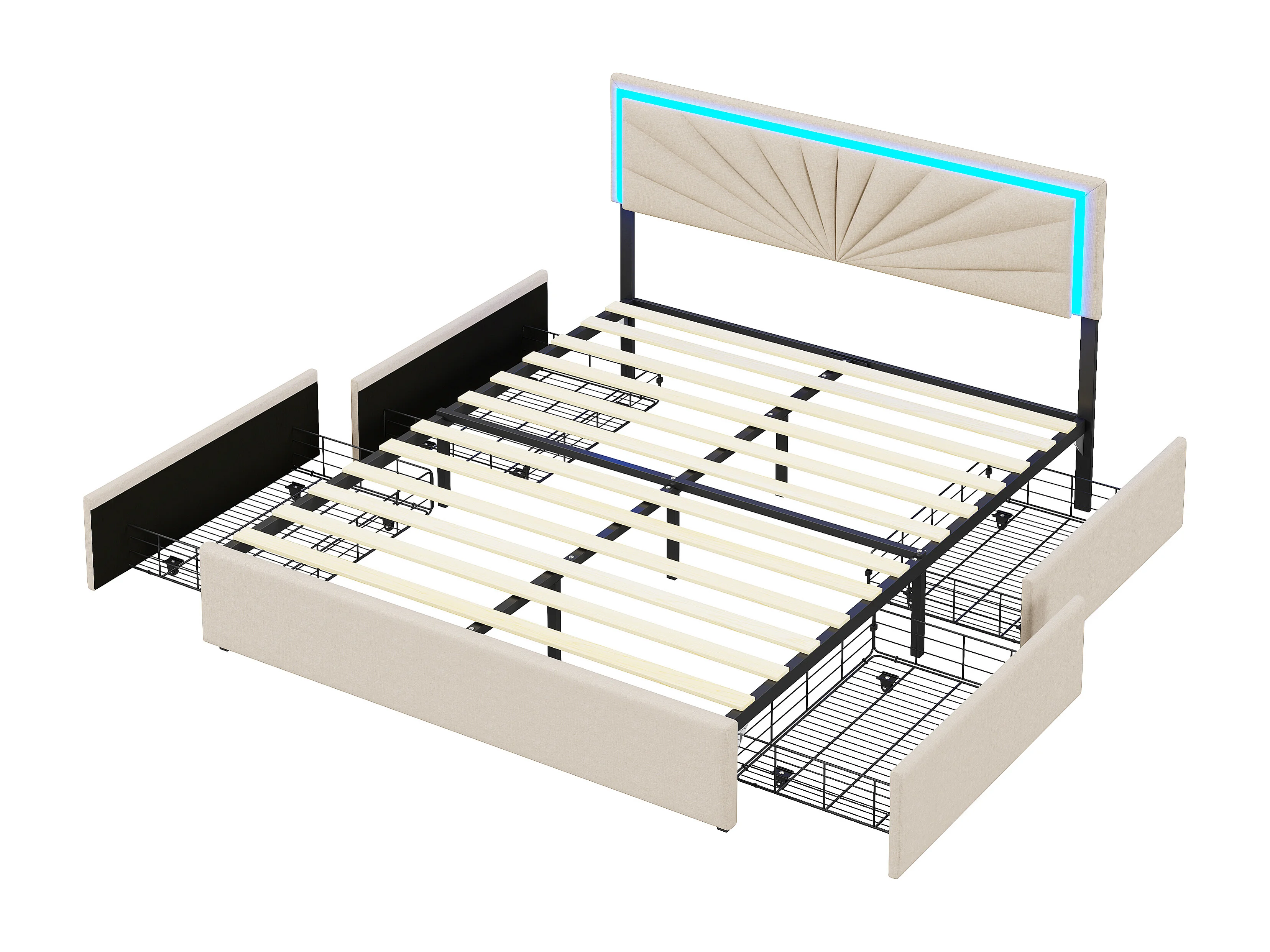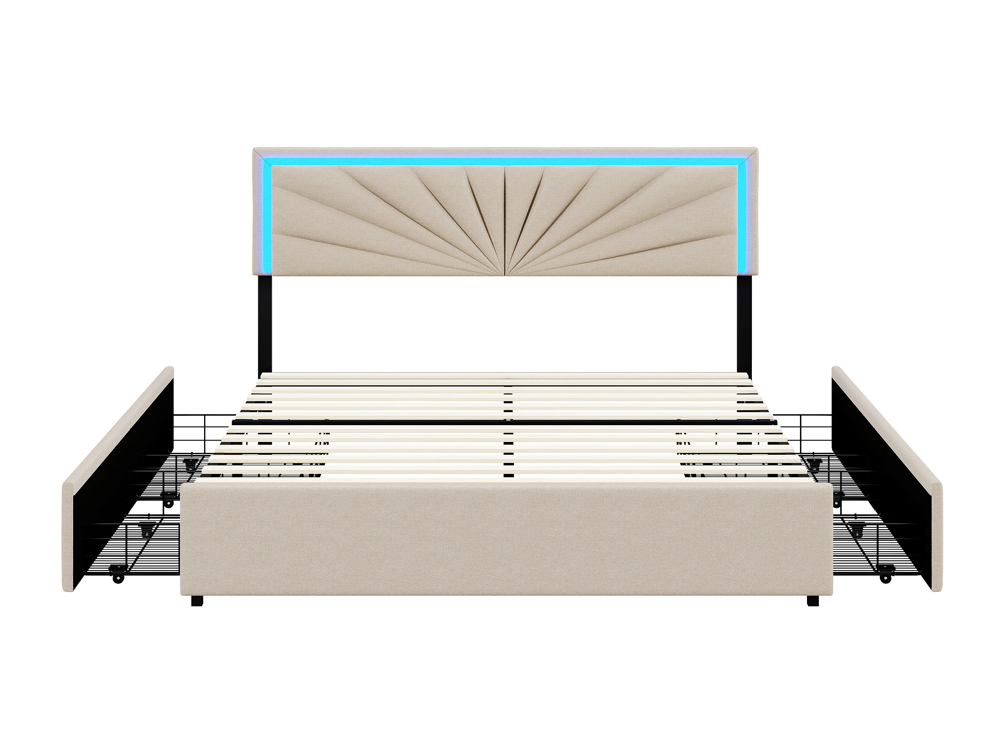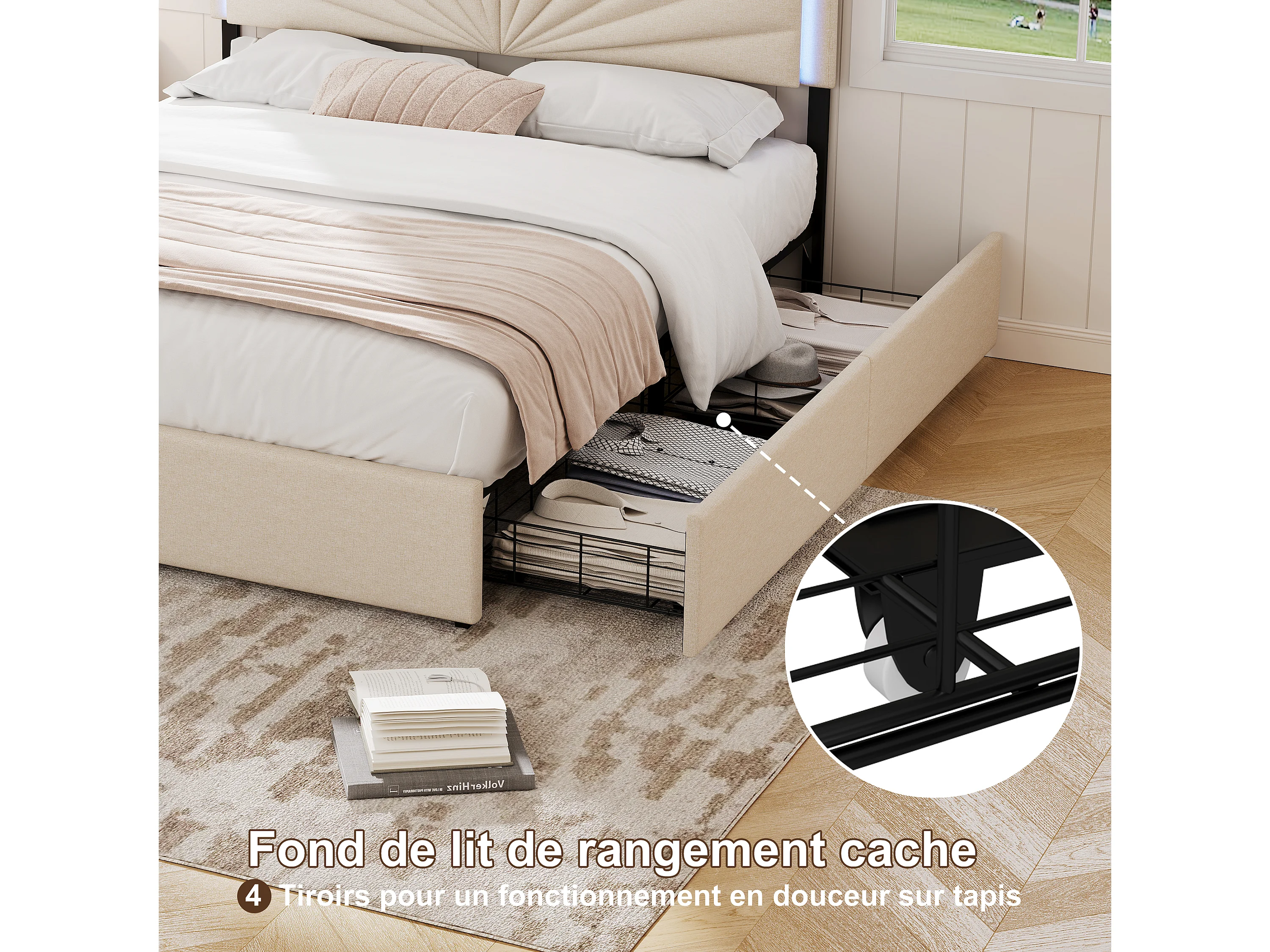 Lit capitonné 140 x 200 cm - avec LED et 4 Tiroirs - Lit double é avec Tête de Lit Réglable en Hauteur - avec Sommier à Lattes - Lin - beige