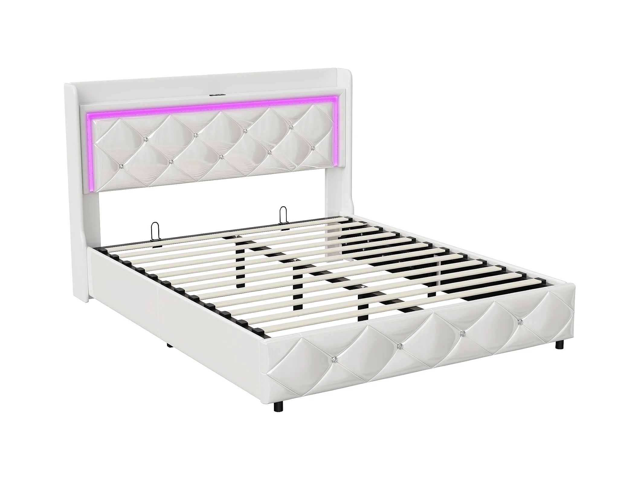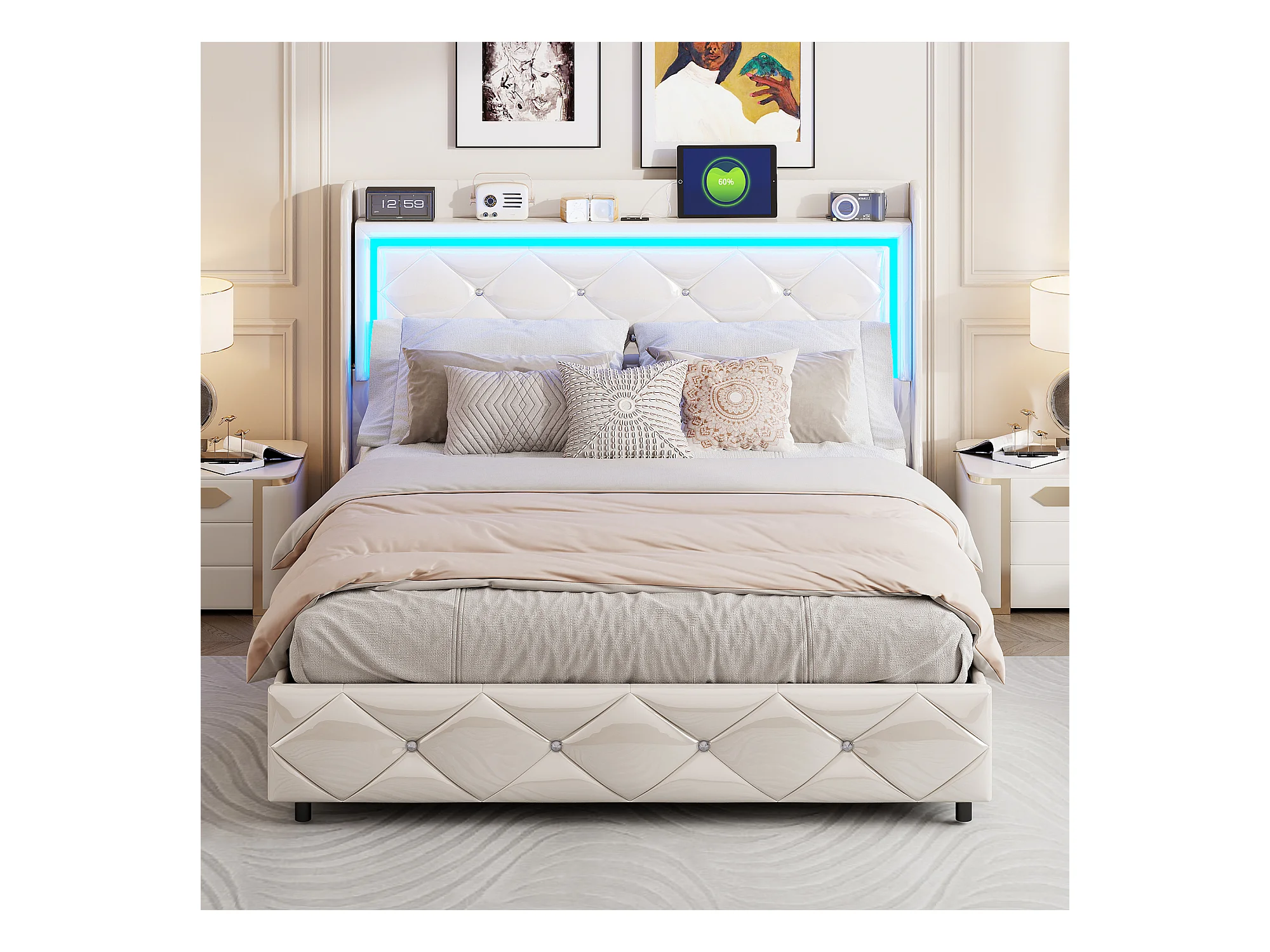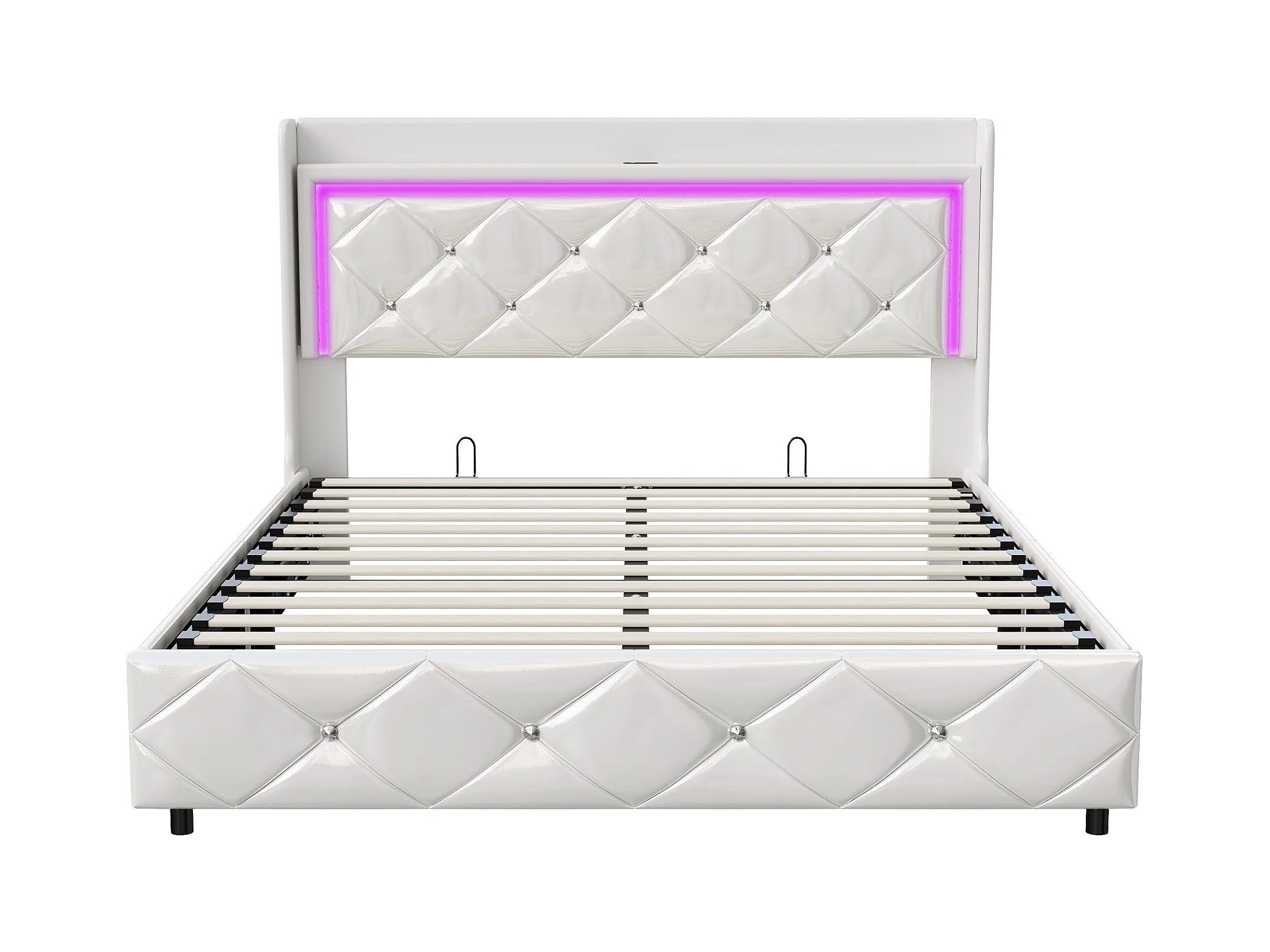 Lit Rembourré 140x200cm Avec USB, Lit Double, Lit Rangement Avec LED,simili Cuir, Cadre De Lit,blanc