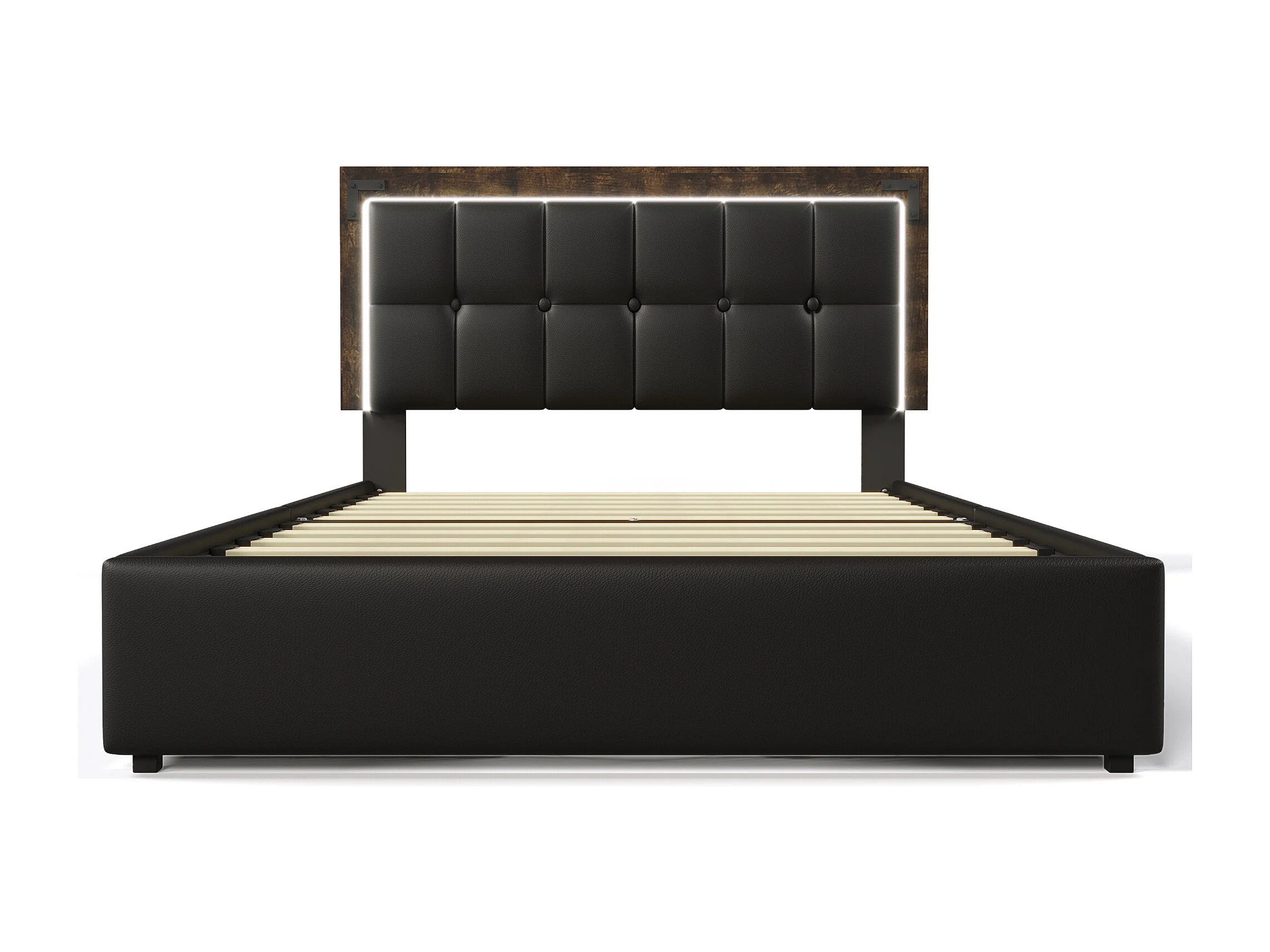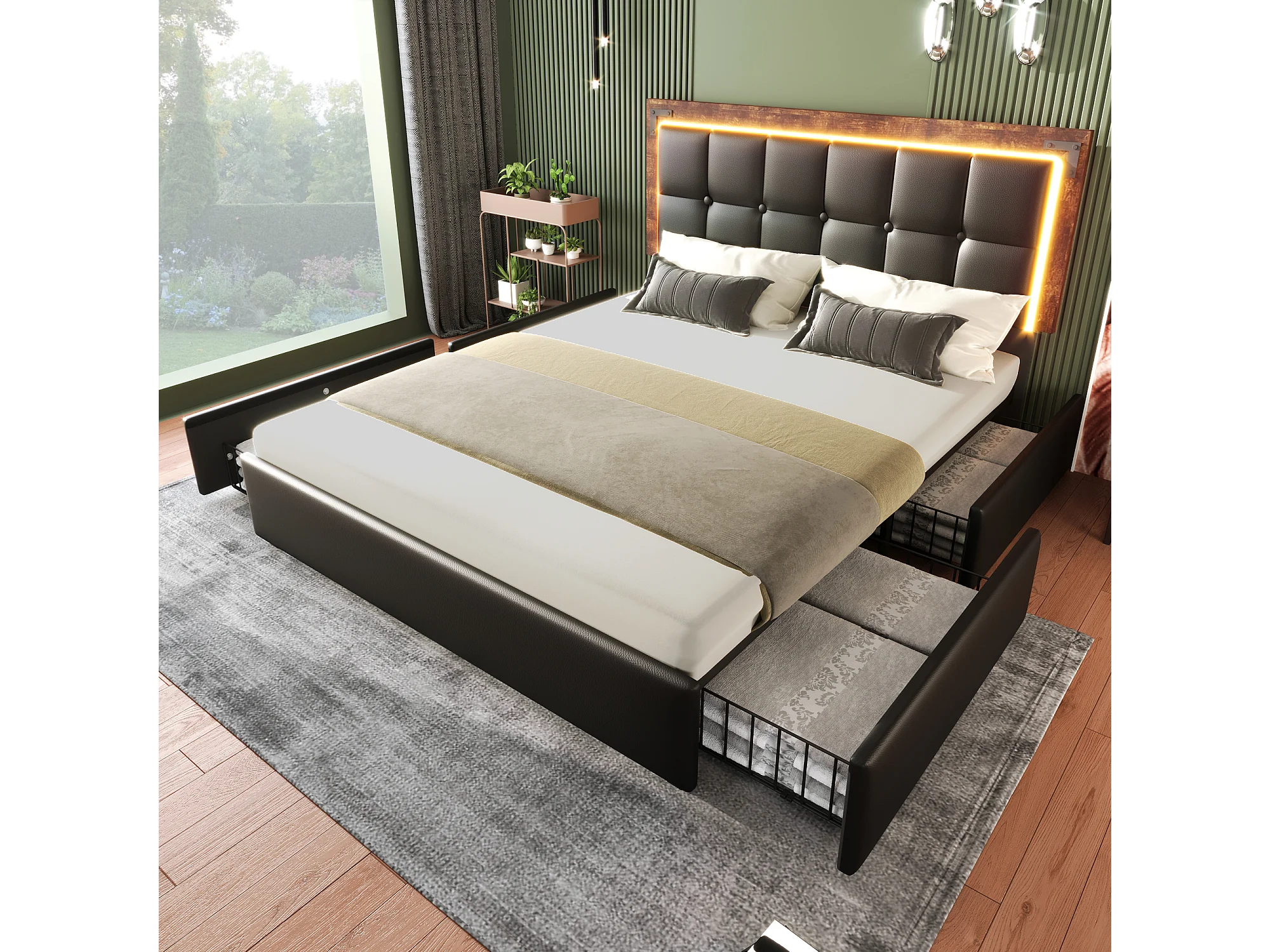 Lit rembourré 140x200cm, lit double, avec bande lumineuse LED, 4 tiroirs et tête de lit réglable en hauteur, PU, noir, avec matelas