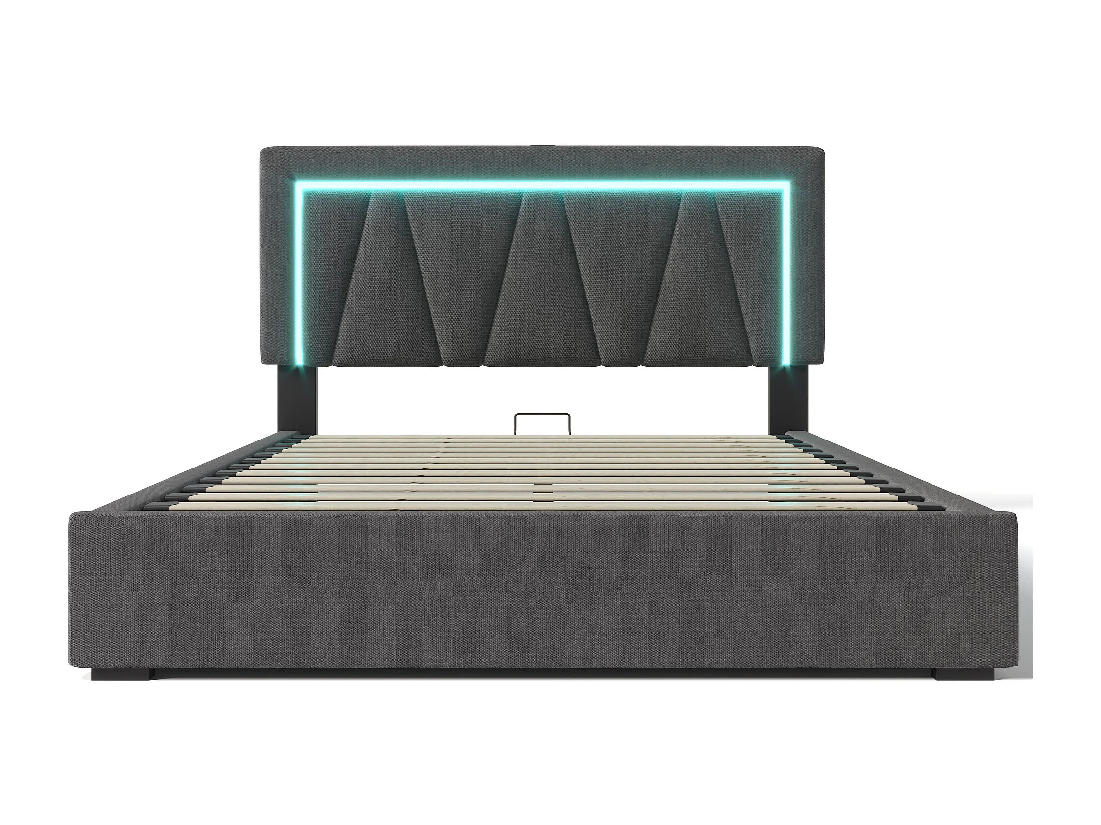 Lit rembourré 140x200cm, lit double avec fonction de chargement USB Type C et éclairage LED, lit coffre, lin, gris, avec matelas