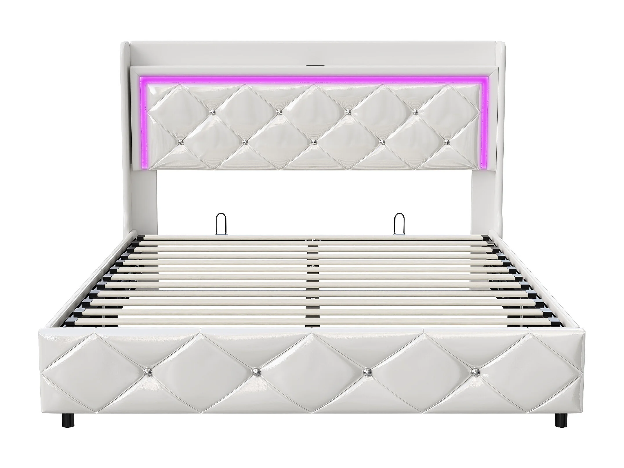 Lit rembourré 160×200 cm avec LED, USB et rangement – Similicuir blanc, cadre lit double